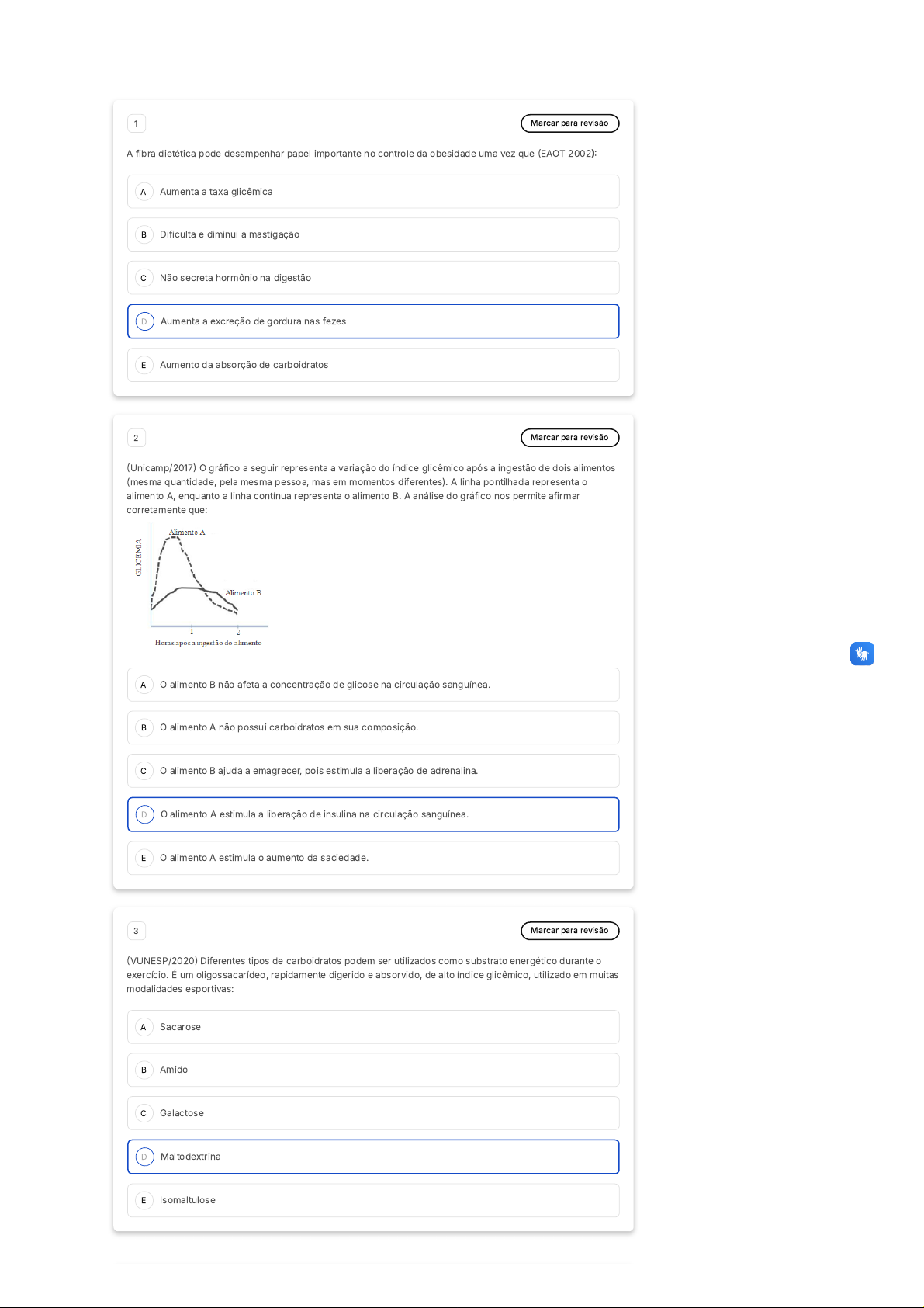 A B C D E A B C D E A B C D E 1 Marcar para revisão A fibra dietética pode desempenhar papel importante no controle da obesidade uma vez que (EAOT 2002): Aumenta a taxa glicêmica Dificulta e diminui a mastigação Não secreta hormônio na digestão Aumenta a excreção de gordura nas fezes Aumento da absorção de carboidratos 2 Marcar para revisão (Unicamp/2017) O gráfico a seguir representa a variação do índice glicêmico após a ingestão de dois alimentos (mesma quantidade, pela mesma pessoa, mas em momentos diferentes). A linha pontilhada representa o alimento A, enquanto a linha contínua representa o alimento B. A análise do gráfico nos permite afirmar corretamente que: O alimento B não afeta a concentração de glicose na circulação sanguínea. O alimento A não possui carboidratos em sua composição. O alimento B ajuda a emagrecer, pois estimula a liberação de adrenalina. O alimento A estimula a liberação de insulina na circulação sanguínea. O alimento A estimula o aumento da saciedade. 3 Marcar para revisão (VUNESP/2020) Diferentes tipos de carboidratos podem ser utilizados como substrato energético durante o exercício. É um oligossacarídeo, rapidamente digerido e absorvido, de alto índice glicêmico, utilizado em muitas modalidades esportivas: Sacarose Amido Galactose Maltodextrina Isomaltulose A B C D E A B C D E A B C D E A B 4 Marcar para revisão De acordo com o número de carbonos, os carboidratos são classificados em (_____) tipos. Os (_____) são carboidratos simples que recebem o sufixo ose. Já os (_____) são carboidratos complexos formados pela união de vários (_____). Assinale a alternativa que apresenta as respostas para preencher cada lacuna. Dois; monossacarídeos; dissacarídeos; oligossacarídeos Dois; dissacarídeos; polissacarídeos; oligossacarídeos Três; monossacarídeos; polissacarídeos; monossacarídeos Três; polissacarídeos; oligossacarídeos; dissacarídeos Três; oligossacarídeos; dissacarídeos; monossacarídeos 5 Marcar para revisão (UFMS -2014) Qual é a forma mais abundante de lipídios encontrada nos alimentos? Glicerol Triacilglicerol Cerídios Colesterol Fosfolipídios 6 Marcar para revisão As moléculas de acetil-CoA, oriundas no período de jejum da beta oxidação dos ácidos graxos, acumuladas no fígado devido à redução da velocidade do ciclo de Krebs, serão utilizadas para: Lipogênese Glicogênese Cadeia respiratória mitocondrial Glicogenólise Cetogênese 7 Marcar para revisão (VUNESP -2019) Sobre as lipoproteínas necessárias para o adequado transporte dos lipídios pelo sangue, é possível afirmar corretamente que: Os remanescentes de quilomícrons possuem colesterol, fosfolípides e uma grande quantidade de moléculas de triacilglicerol. As células do fígado secretam uma lipoproteína rica em triacilgliceróis, a VLDL, que transporta os lipídios exógenos. 00 hora : 39 min : 49 seg Ocultar Questão 9 de 10 Respondidas (10) Em branco (0) Finalizar prova 1 2 3 4 5 6 7 8 9 10 SM2 Nutrição Humana C D E A B C D E A B C D E A B C D E Os quilomícrons têm a função de transportar os triacilgliceróis provenientes da dieta para os tecidos periféricos. A HDL é sintetizada no fígado e tem a função de entregar o colesterol aos tecidos periféricos. A LDL é sintetizada no fígado e tem a função de capturar o colesterol livre dos tecidos periféricos. 8 Marcar para revisão O aumento de homocisteína, depressão, declínio cognitivo e Alzheimer pode ser consequência de deficiência de vitaminas, como por exemplo: Vitamina B1 Vitamina B3 Vitamina B12 Vitamina E Vitamina B7 9 Marcar para revisão A quantidade de vitamina C necessária para prevenir o escorbuto em humanos é em torno de: 10mg/d 40 mcg/d 40mg/d 150 mcg/d 70mg/d 10 Marcar para revisão A vitamina A é essencial para diversas funções do organismo, incluindo a visão, a diferenciação celular e o sistema imunológico. Após a ingestão, os ésteres de retinil presentes nos alimentos devem ser processados para que a vitamina possa ser absorvida e distribuída aos tecidos que dela necessitam. Assinale a alternativa que descreve corretamente o metabolismo e a absorção da vitamina A: A vitamina A é absorvida no estômago, sem necessidade de hidrólise dos ésteres de retinil, e armazenada principalmente nos rins. A absorção da vitamina A ocorre no intestino delgado, onde os ésteres de retinil sofrem hidrólise, sendo o fígado o principal órgão de armazenamento e metabolismo. A vitamina A é diretamente absorvida pelos tecidos periféricos, sem participação do fígado, que apenas a metaboliza parcialmente. O metabolismo da vitamina A ocorre exclusivamente em células musculares, enquanto o fígado tem função limitada na distribuição para tecidos periféricos. A absorção da vitamina A se dá no intestino grosso, sendo armazenada preferencialmente no tecido adiposo.