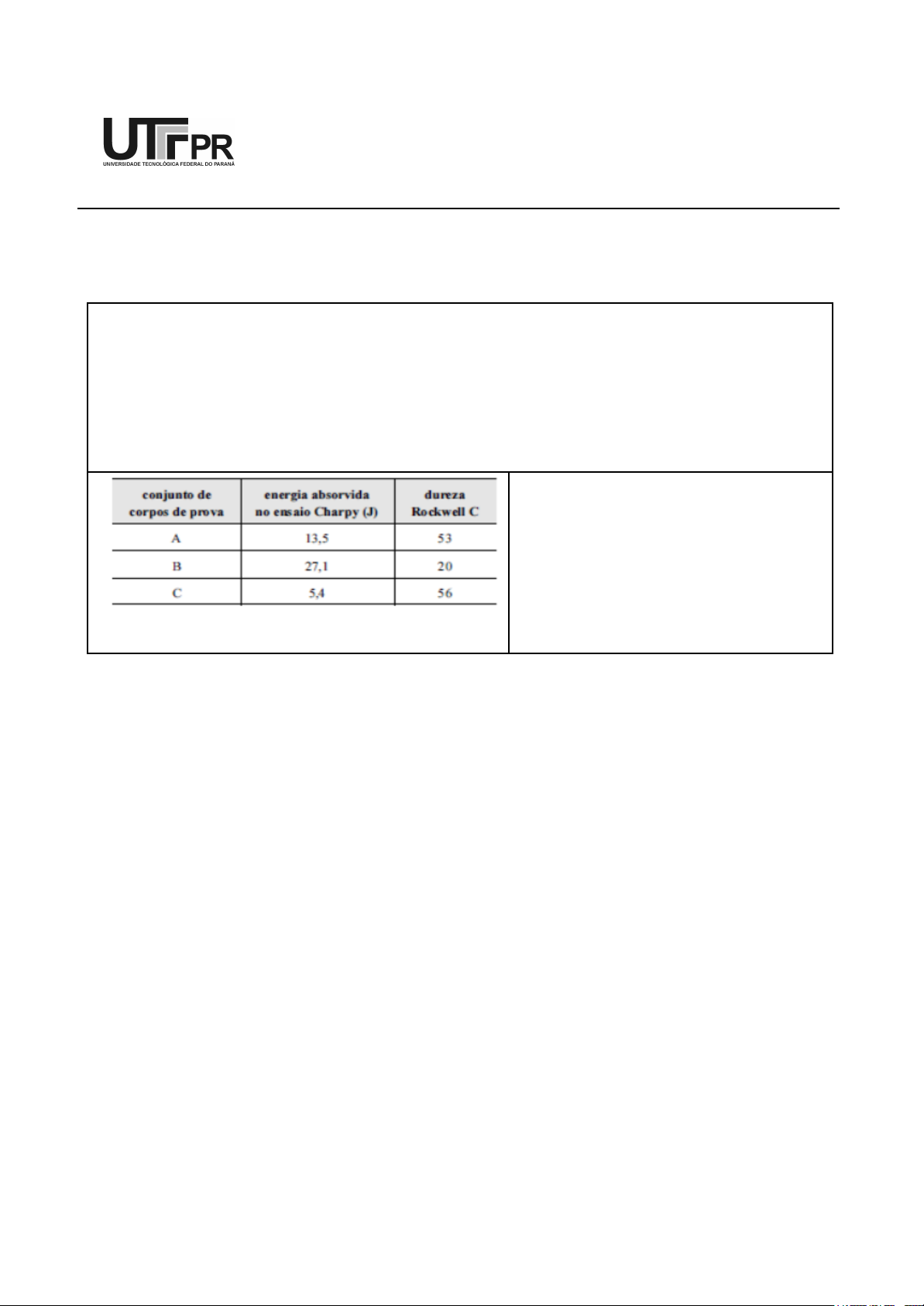 Ministério da Educação Universidade Tecnológica Federal do Paraná Campus Pato Branco Disciplina de Ensaio dos Materiais – EM25M Prof. Maria Nalu Verona Lista de Exercícios 2 18/11/2025 I.Assinale V para a alternativa Verdadeira e F para a alternativa Falsa nas questões 1 a 14 (1,4): A partir de uma amostra de um aço-carbono com mais de 0,5% de carbono foram confeccionados três conjuntos de corpos de prova para ensaio Charpy. Um dos conjuntos foi recozido, o outro foi temperado e revenido e o último conjunto foi apenas temperado. Cada conjunto foi submetido a ensaio de dureza Rockwell C e ao ensaio Charpy, cujos resultados são mostrados na tabela abaixo. Infelizmente, ao se fazer o ensaio Charpy, perderam-se as etiquetas que identificavam o tratamento térmico dado a cada conjunto. Nessa situação, de acordo com os resultados dos ensaios realizados: 1. ( ) O conjunto de corpo de prova designado por A foi temperado e revenido. 2. ( ) O conjunto designado por C foi recozido 3. ( ) O conjunto designado por B foi temperado. 4. ( ) No ensaio de impacto, o valor da energia absorvida na ruptura de um corpo de prova aumenta com a elevação da temperatura do corpo de prova. A classificação entre fratura frágil e dúctil baseia-se na habilidade do material em apresentar deformação plástica substancial, com grande absorção de energia antes da fratura. Sobre a fratura frágil, analise as afirmativas a seguir. 5. ( ) Está relacionada à propagação de trincas e apresenta superfície sem grandes deformações plásticas aparentes, ao contrário da fratura dúctil, que apresenta superfície característica em forma de taça e cone. 6. ( ) É possível avaliar a fratura nos contornos dos grãos quando apresenta forma transgranular. 7. ( ) A fadiga é um mecanismo de falha que ocorre quando um material é submetido a tensões cíclicas abaixo do seu limite de resistência à tração, mas acima do seu limite de fadiga (ou limite de resistência). 8. ( ) A fadiga em materiais ocorre apenas quando o material é submetido a cargas estáticas. 9. ( ) No ensaio de fadiga, o limite de fadiga é a tensão máxima abaixo da qual se espera que o material suporte um número infinito de ciclos de carga sem falhar. Ministério da Educação Universidade Tecnológica Federal do Paraná Campus Pato Branco Disciplina de Ensaio dos Materiais – EM25M Prof. Maria Nalu Verona Lista de Exercícios 2 18/11/2025 10. ( ) A temperatura não influencia o comportamento de fadiga dos materiais, pois todos os materiais têm um limite de fadiga constante em qualquer temperatura. 11. ( ) Em temperaturas elevadas, a taxa de fluência (creep rate) de um material é influenciada significativamente por processos de difusão atômica e pelo movimento de discordâncias. 12. ( ) A fluência é um fenômeno que ocorre apenas em materiais metálicos a temperaturas elevadas. 13. ( ) A fluência ocorre abaixo do limite elástico do material. 14. ( ) A fluência (creep) é um fenômeno de deformação plástica progressiva que depende principalmente da magnitude da tensão aplicada e do número de ciclos de carga (e não da temperatura). II. Assinale a alternativa correta (1,2) 1. A principal aplicação do ensaio de fluência é: (a) Determinar a resistência ao cisalhamento. (b) Analisar o comportamento do material sob altas temperaturas e longos períodos de tempo. (c) Medir a elasticidade de um material em condições normais. (d) Avaliar qual a temperatura de fusão do material. 2. As amostras abaixo mostram corpos de prova adotados em ensaios de impacto. As amostras I e II são adotadas, respectivamente, nos ensaios de impacto do tipo: Parte superior do formulário (a) Charpy e Izod (b) Charpy e Nakazima (c) Erichsen e Nakazima (d) Erichsen e Izod (e) Izod e Charpy. 3. Os fatores podem influenciar os resultados de um ensaio de fluência são? (a) Temperatura e umidade do ambiente. (b) Tipo de material e forma da amostra. (c) Tempo de aplicação da carga. (d) Todas as alternativas acima. Ministério da Educação Universidade Tecnológica Federal do Paraná Campus Pato Branco Disciplina de Ensaio dos Materiais – EM25M Prof. Maria Nalu Verona Lista de Exercícios 2 18/11/2025 4. Com relação ao ensaio de fadiga é correto afirmar que: (a) O ensaio de fadiga sempre resulta em fratura instantânea do material testado. (b) O ensaio de fadiga é realizado com cargas estáticas aplicadas continuamente. (c) O limite de fadiga é a tensão máxima que um material pode suportar sem falha por um número indefinido de ciclos. (d) A forma da curva S-N (tensão vs. número de ciclos) é sempre linear para todos os materiais. (e) O ensaio de fadiga não leva em consideração a temperatura do ambiente durante o teste. 5. Sobre as máquinas e os ensaios de impacto Charpy e Izod, é incorreto afirmar que: (a) esses ensaios têm como objetivo avaliar a resistência ao impacto de um material em diferentes temperaturas e conhecer o tipo de fratura ocorrida no ensaio, avaliando e classificando-a como dúctil ou frágil. (b) a temperatura na qual é conduzido o ensaio de impacto (Charpy ou Izod) não tem influência no resultado do teste. (c) o ensaio é utilizado para avaliar se um dado material apresenta transição do tipo dúctil-frágil. (d) esses tipos de ensaios passaram a ser mais utilizados após a segunda guerra mundial devido à ocorrência de fratura frágil em estruturas metálicas, tais como pontes e navios. (e) aços de baixo carbono, como os utilizados em estruturas metálicas e em cascos de navios, podem apresentar comportamento frágil em função da temperatura. 6. Em um ensaio de fadiga que utiliza o método da Curva S−N (ou Tensão-Vida), o eixo das abscissas (x) e o eixo das ordenadas (y) representam, respectivamente: (a) Eixo x: Amplitude da Tensão Cíclica (S); Eixo y: Número de Ciclos de Carga (N). (b) Eixo x: Deformação Plástica (ϵp ); Eixo y: Tempo de Ensaio (t). (c) Eixo x: Tensão de Escoamento 
