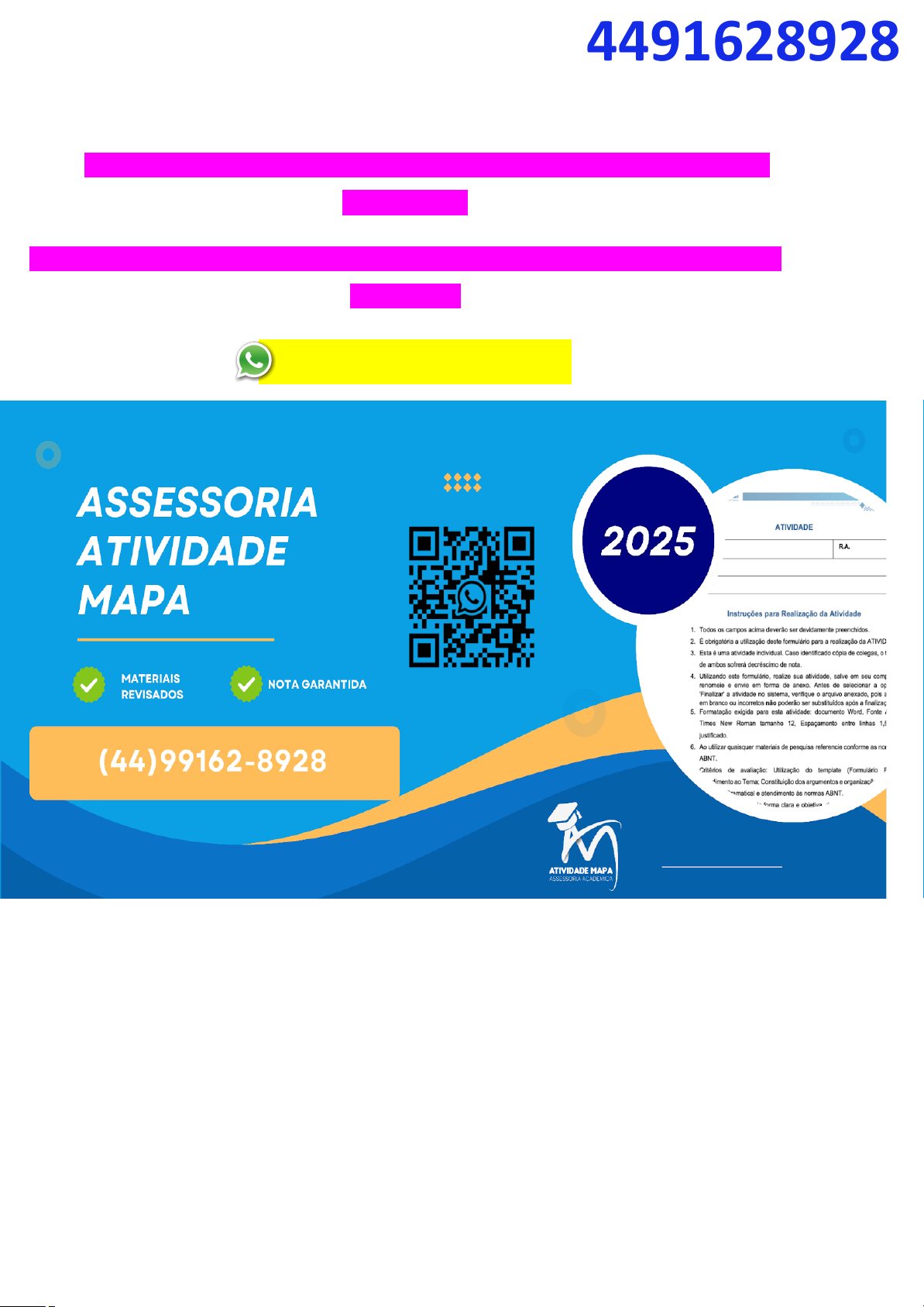 Está SEM TEMPO ou com DIFICULDADE de realizar o seu trabalho acadêmico? Entre em contato conosco agora mesmo! Iremos te ajudar nessa jornada acadêmica (44) 99162-8928 MAPA - ENF - ENFERMAGEM NA ASSISTÊNCIA AO PACIENTE CRÍTICO - 54_2025 Material de Avaliação Prática da Aprendizagem Prezado(a) estudante, Nesta atividade MAPA, você será convidado(a) a refletir sobre a complexidade do atendimento ao paciente crítico , com ênfase nos dispositivos utilizados em terapia intensiva e na necessidade do conhecimento técnico-científico do enfermeiro para sua execução. O objetivo desta atividade é estimular a conexão entre teoria e prática, garantindo que você compreenda os procedimentos essenciais no cuidado integral ao paciente crítico. 4491628928 44991628928 Seu desafio: Imagine que você é o(a) enfermeiro(a) responsável da Unidade de Terapia Intensiva (UTI) e acabou de receber a admissão da Sra. Tereza , uma paciente crítica. Durante sua admissão e evolução, tornou-se necessária a execução de diferentes procedimentos de alta complexidade, como o uso de sondas, dispositivos invasivos e protocolos de emergência. Nesse contexto, surge a simulação de uma situação em que você precisa atuar de forma imediata diante de paciente crítico. Questões: 1.Descreva detalhadamente a técnica da sondagem gástrica , ressaltando os principais passos para a realização segura do procedimento. 2.Explique o passo a passo da sondagem vesical de demora , destacando as diferenças de execução entre pacientes do sexo masculino e feminino. 3.Sobre a monitorização da Pressão Arterial Invasiva (PAI) , descreva o conceito de cada uma das medidas da pressão arterial: Pressão Arterial Sistólica (PAS) e Diastólica (PAD), Pressão Arterial Média (PAM), Débito Cardíaco (DB) e Resistência Vascular Sistêmica (RVS) e cite um cuidado de enfermagem nos momentos pré incersão do catéter, durante a manutenção e no momento da retirada do catéter. Fonte: STIES, Sabrina Weiss; ORTOLAN, Xana Raquel. Técnicas e procedimentos de primeiros socorros . Maringá: Unicesumar, 2019. Reimpresso e 4491628928 44991628928