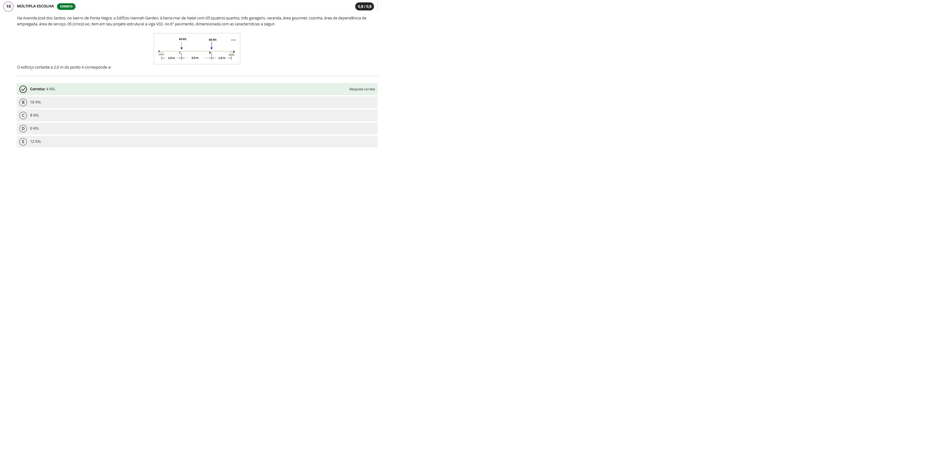 10 MULTIPLA ESCOLHA CORRETO 0,8/0,8 Na Avenida José dos Santos, no bairro de Ponta Negra, Edifício Hannah à beira-mar de Natal com 05 (quatro) quartos, três garagens, varanda, área gourmet, cozinha, área de dependência de empregada, área de serviço, 05 (cinco) WC, tem em seu projeto estrutural a viga V32, no 6° pavimento, dimensionada com as características a seguir. 60 KN A D O esforço cortante a 2,0 m do ponto A corresponde a: Correta: 4 KN. Resposta correta B 16 KN. C 8 KN. D 0 KN. E 12 KN.