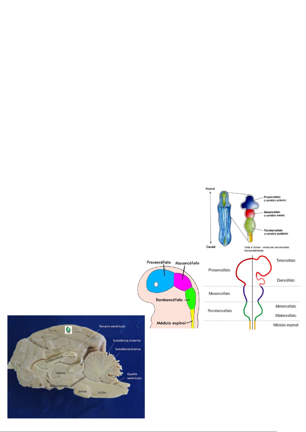APARELHO NERVOSO FASES DO DESENVOLVIMENTO Vesícula embrionária: aglomerado de células sustentado por uma vesícula Disco embrionário: a multiplicação celular determina com que haja um achatamento da vesícula tornando-a um disco, quando já é possível reconhecer três folhetos embrionários: · Ectoderma · Mesoderma · Endoderma O aparelho nervoso provém do ectoderma TUBO NEURAL – DILATAÇÕES Dá origem ao sistema nervoso central (cérebro e medula espinhal) Na extremidade cranial do tudo neural, apresenta três dilatações denominadas vesículas primárias · Prosencéfalo · Mesencéfalo · Rombencéfalo Essas vesículas sofrem transformações, originando as partes mais importantes do SNC As três vesículas primárias darão origem a cinco vesículas secundárias: · Prosencéfalo · Telencéfalo · Diencéfalo · Mesencéfalo · Rombencéfalo · Metencéfalo · Mielencéfalo FUNÇÕES APARELHO NERVOSO É Protegido por uma caixa craniana Dividido em: · Central · Periférico SISTEMA NERVOSO CENTRAL Dividido em: · ENCEFALO · Cérebro · Bulbo · Ponte · Cerebelo · MEDULA ESPINHAL: filamento nervoso que percorre o interior do canal da coluna vertebral SISTEMA NERVOSO PERIFERICO Formado por vários gânglios nervosos e uma rede nervosa que se espelha por todo o corpo Os nervos podem ser: · Cranianos – partem do encéfalo · Espinhais – partem da medula espinal TIPOS DE NERVOS · Sensitivos (aferentes) · Transmitem impulso nervoso dos órgãos receptores (como olhos, ouvidos, pele)para o SNC. · Motores (eferentes) · Transmitem impulso nervoso do SNC para os órgãos efetores. · Mistos · Possuem neurofibras sensitivas e motoras. image6.png image1.png image2.jpeg image3.jpeg image4.jpeg image5.jpeg