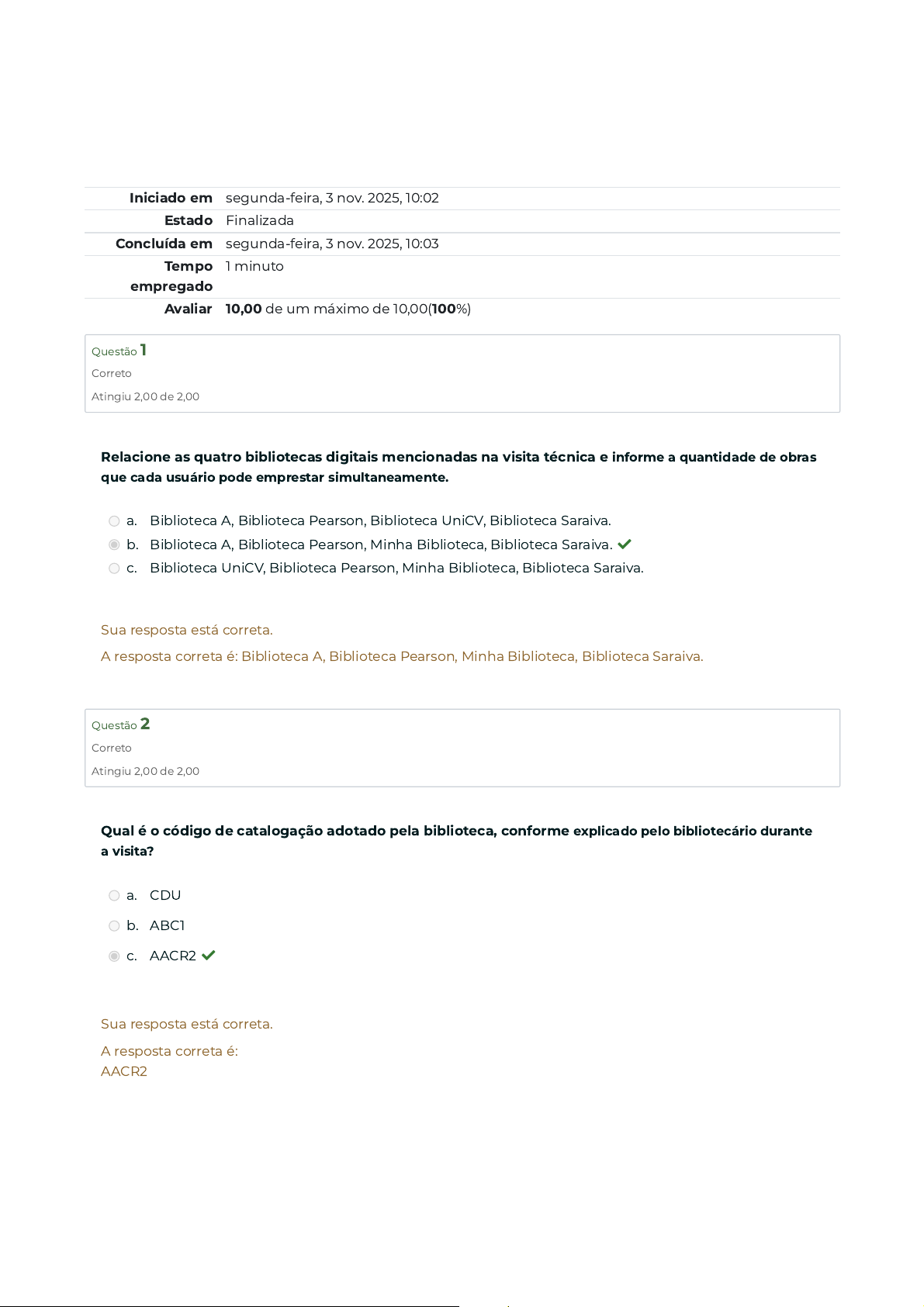 Iniciado em segunda-feira, 3 nov. 2025, 10:02 Estado Finalizada Concluída em segunda-feira, 3 nov. 2025, 10:03 Tempo empregado 1 minuto Avaliar 10,00 de um máximo de 10,00(100%) Questão 1 Correto Atingiu 2,00 de 2,00 Questão 2 Correto Atingiu 2,00 de 2,00 Relacione as quatro bibliotecas digitais mencionadas na visita técnica e informe a quantidade de obras que cada usuário pode emprestar simultaneamente. a. Biblioteca A, Biblioteca Pearson, Biblioteca UniCV, Biblioteca Saraiva. b. Biblioteca A, Biblioteca Pearson, Minha Biblioteca, Biblioteca Saraiva. c. Biblioteca UniCV, Biblioteca Pearson, Minha Biblioteca, Biblioteca Saraiva. Sua resposta está correta. A resposta correta é: Biblioteca A, Biblioteca Pearson, Minha Biblioteca, Biblioteca Saraiva. Qual é o código de catalogação adotado pela biblioteca, conforme explicado pelo bibliotecário durante a visita? a. CDU b. ABC1 c. AACR2 Sua resposta está correta. A resposta correta é: AACR2 Questão 3 Correto Atingiu 2,00 de 2,00 Questão 4 Correto Atingiu 2,00 de 2,00 Questão 5 Correto Atingiu 2,00 de 2,00 Informe o nome completo do(a) bibliotecário(a) responsável pela condução da visita técnica à Biblioteca UniCV. a. Fátima Calicchio. b. Lucas Rodrigues. c. Josimar de Oliveira. Sua resposta está correta. A resposta correta é: Josimar de Oliveira. Qual é o sistema de classificação utilizado para a organização do acervo físico da biblioteca? a. Ordem Alfabetica. b. Arquivo comum. c. CDU (Classificação Decimal Universal). Sua resposta está correta. A resposta correta é: CDU (Classificação Decimal Universal). Cite, ao menos, dois ambientes funcionais da Biblioteca UniCV que foram apresentados durante a visita técnica. a. Recepção da biblioteca; Salas de aula. b. Local de estudos individuais; Recepção da biblioteca. c. Local de estudos individuais; Banheiros. Sua resposta está correta. A resposta correta é: Local de estudos individuais; Recepção da biblioteca.
