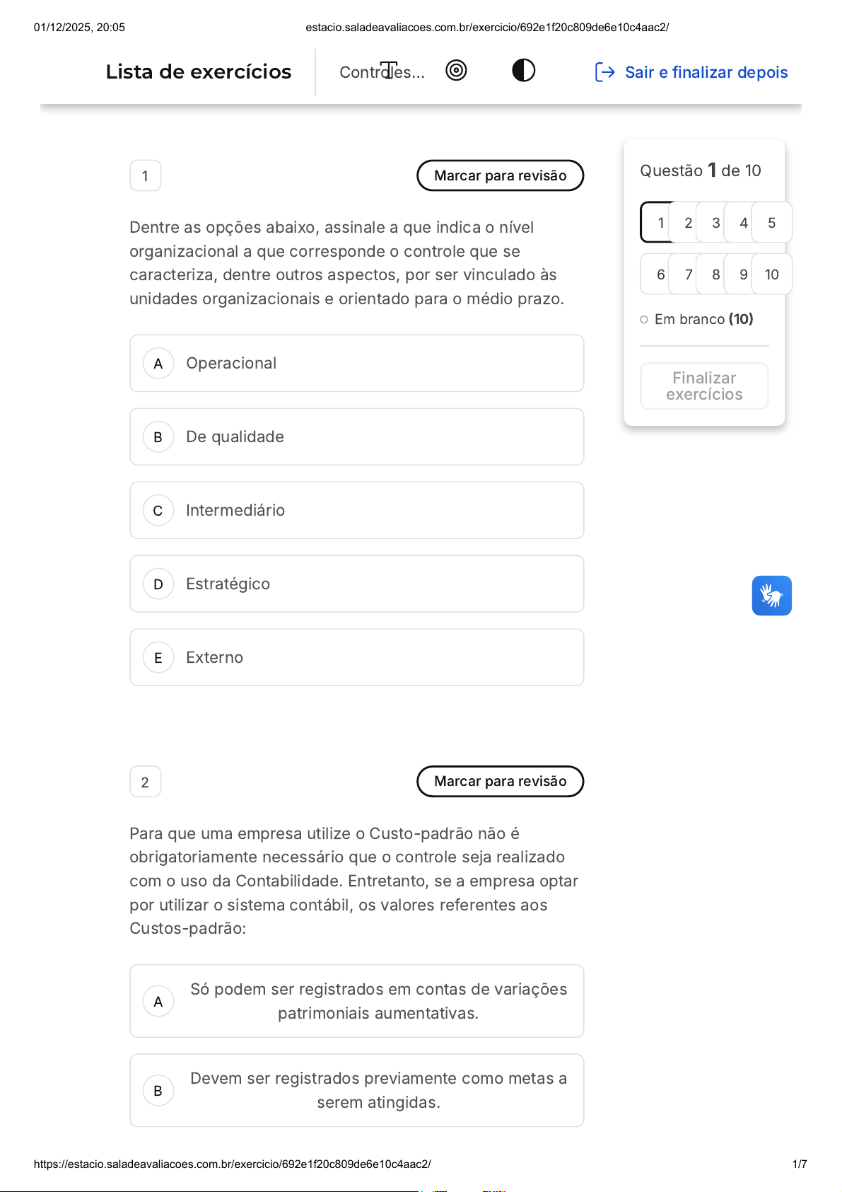 A B C D E A B 1 Marcar para revisão Dentre as opções abaixo, assinale a que indica o nível organizacional a que corresponde o controle que se caracteriza, dentre outros aspectos, por ser vinculado às unidades organizacionais e orientado para o médio prazo. Operacional De qualidade Intermediário Estratégico Externo 2 Marcar para revisão Para que uma empresa utilize o Custo-padrão não é obrigatoriamente necessário que o controle seja realizado com o uso da Contabilidade. Entretanto, se a empresa optar por utilizar o sistema contábil, os valores referentes aos Custos-padrão: Só podem ser registrados em contas de variações patrimoniais aumentativas. Devem ser registrados previamente como metas a serem atingidas. Questão 1 de 10 Em branco (10) 1 2 3 4 5 6 7 8 9 10 Finalizar exercícios Lista de exercícios Controles… Sair e finalizar depois 01/12/2025, 20:05 estacio.saladeavaliacoes.com.br/exercicio/692e1f20c809de6e10c4aac2/ https://estacio.saladeavaliacoes.com.br/exercicio/692e1f20c809de6e10c4aac2/ 1/7 C D E A B C D E Devem ser obrigatoriamente registrados em contas de resultado. Só podem ser registrados em contas de variações patrimoniais diminutivas. Devem ser integrados apenas pelos valores referentes às matérias-primas. 3 Marcar para revisão As variações entre o Custo-padrão e o Custo real podem ser de duas diferentes origens: internos ou externos à empresa. Quando as causas de uma determinada variação são internas: Significa que necessariamente houve um problema grave dentro da própria empresa. Significa que a empresa foi vítima de algum ato doloso de algum funcionário da própria empresa. A própria empresa deve identificar os fenômenos que causaram a variação e os responsáveis. Normalmente é difícil, ou até mesmo impossível, que os gestores possam adotar alguma providência. A empresa deve realizar uma investigação minuciosa e punir o responsável ou os responsáveis. 01/12/2025, 20:05 estacio.saladeavaliacoes.com.br/exercicio/692e1f20c809de6e10c4aac2/ https://estacio.saladeavaliacoes.com.br/exercicio/692e1f20c809de6e10c4aac2/ 2/7 A B C D E A B 4 Marcar para revisão Conceitualmente, o Custo-padrão Ideal: Refere-se ao custo que, em média, a empresa normalmente consegue alcançar. É estabelecido com base no desempenho do custo real ao longo do tempo. Considera que sempre ocorrem ineficiências durante o processo produtivo. Pressupõe que as metas-custo sempre devem ser alcançadas a longo prazo. Considera que não deve haver nenhuma ineficiência no processo produtivo. 5 Marcar para revisão As ações de controle operacional são normalmente realizadas sobre pessoas e têm caráter corretivo, de natureza disciplinar, o que requer que o administrador responsável tenha habilidade ao implementá-las. Tais ações devem ser pautadas por certas características como, por exemplo, a impessoalidade, que se caracteriza: Por não causar surpresas nem apreensão ao empregado responsável pela falta que motivou a ação disciplinar. Pela aplicação da ação disciplinar tão logo o desvio seja detectado. 01/12/2025, 20:05 estacio.saladeavaliacoes.com.br/exercicio/692e1f20c809de6e10c4aac2/ https://estacio.saladeavaliacoes.com.br/exercicio/692e1f20c809de6e10c4aac2/ 3/7 C D E A B C D E Pela possibilidade de que o administrador reassuma a sua atitude normal em relação ao funcionário faltoso. Por possibilitar que o funcionário faltoso seja orientado sobre o que deve fazer para corrigir a falha. Por não buscar punir uma determinada pessoa ou grupos, mas apenas corrigir a situação. 6 Marcar para revisão São muitos os fatores que podem provocar variações desfavoráveis do real em relação ao padrão. Entre as opções abaixo, assinale aquela que descreve um fator que justifica a ocorrência de uma variação desfavorável de preço. Quantidades de matérias-primas mal especificadas. Uso de mão de obra inadequada. Máquinas inadequadas ou com problemas de calibração. Compra mal feita por deficiência do Setor de Compras. Falta de empregados treinados. 01/12/2025, 20:05 estacio.saladeavaliacoes.com.br/exercicio/692e1f20c809de6e10c4aac2/ https://estacio.saladeavaliacoes.com.br/exercicio/692e1f20c809de6e10c4aac2/ 4/7 A B C D E 7 Marcar para revisão A empresa XYZ possui quatro filiais no Brasil, localizadas em duas cidades: Niterói. O Gerente Administrativo, por problemas financeiros, tomou a decisão de fechar a filial que apresenta pior desempenho em relação aos custos. Todas as filiais produzem os mesmos produtos e apresentaram os seguintes dados, relativos ao exercício financeiro de 20XX: Item de Custo Custo-padrão Corrente Realizado Quantidade Preço (R$) Quantidade Preço (R$) NITERÓI Matérias- primas Mão de obra 14 40 10,00 12,00 12 42 12,50 14,80 PETRÓPOLIS Matérias- primas Mão de obra 15 40 10,00 12,00 14 41 12,50 14,80 Calcule as variações de quantidade e indique a opção que apresenta o valor total da variação referente à filial que deve ser fechada. R$ 18 desfavorável R$ 5 desfavorável R$ 24 desfavorável R$ 4 desfavorável R$ 3 desfavorável 01/12/2025, 20:05 estacio.saladeavaliacoes.com.br/exercicio/692e1f20c809de6e10c4aac2/ https://estacio.saladeavaliacoes.com.br/exercicio/692e1f20c809de6e10c4aac2/ 5/7 A B C D E A B C 8 Marcar para revisão Para efeito gerencial, as variações de custo são apuradas por meio da diferença entre o Custo Real e o Custo-padrão Corrente. Quando o Custo Real é menor que o Custo-padrão Corrente, significa que: As expectativas em relação aos custos foram frustradas. Foi gerada uma situação desfavorável. Foi gerada uma situação neutra transitória. Houve prejuízo para os acionistas da empresa. Houve eficiência superior ao que se esperava. 9 Marcar para revisão Existem vários tipos de controle, com uma incrível variedade de coberturas e de abrangências. Que tipo de controle se caracteriza por ser detalhado e analítico? Tático Estratégico Institucional 01/12/2025, 