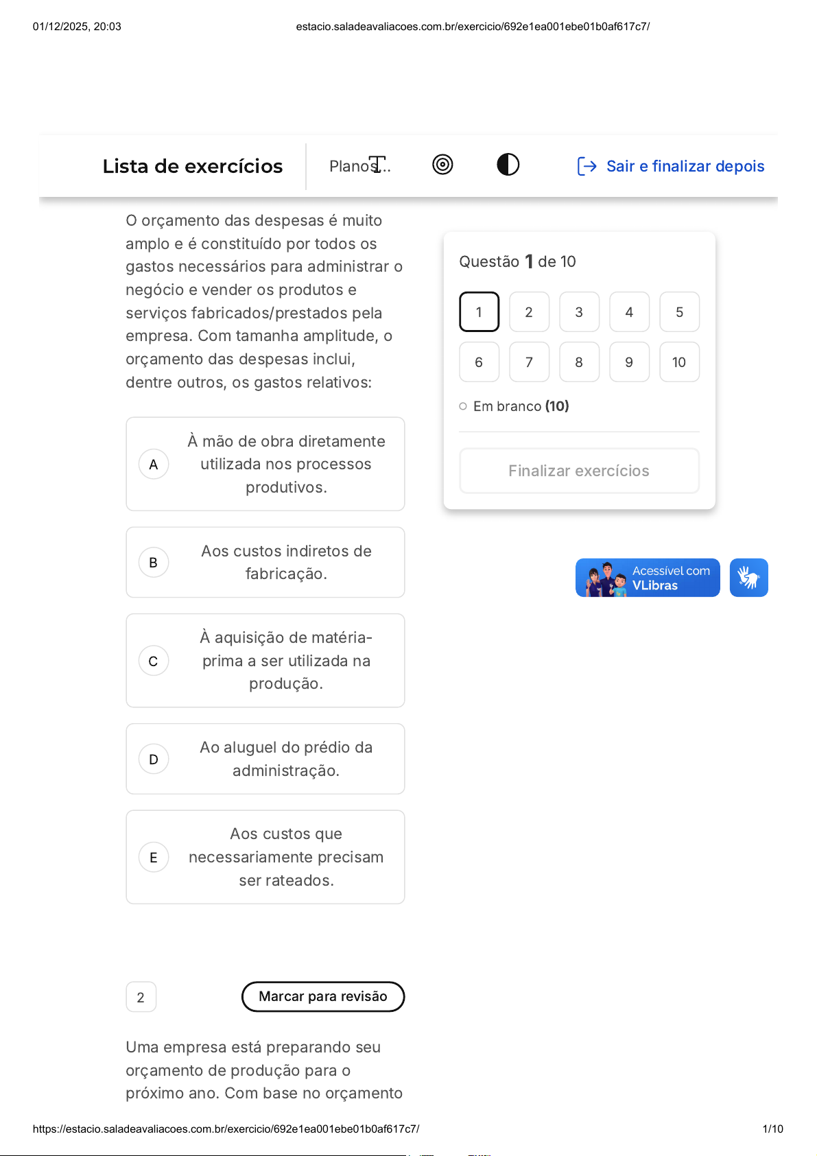 A B C D E 1 Marcar para revisão O orçamento das despesas é muito amplo e é constituído por todos os gastos necessários para administrar o negócio e vender os produtos e serviços fabricados/prestados pela empresa. Com tamanha amplitude, o orçamento das despesas inclui, dentre outros, os gastos relativos: À mão de obra diretamente utilizada nos processos produtivos. Aos custos indiretos de fabricação. À aquisição de matéria- prima a ser utilizada na produção. Ao aluguel do prédio da administração. Aos custos que necessariamente precisam ser rateados. 2 Marcar para revisão Uma empresa está preparando seu orçamento de produção para o próximo ano. Com base no orçamento Questão 1 de 10 Em branco (10) 1 2 3 4 5 6 7 8 9 10 Finalizar exercícios Lista de exercícios Planos… Sair e finalizar depois 01/12/2025, 20:03 estacio.saladeavaliacoes.com.br/exercicio/692e1ea001ebe01b0af617c7/ https://estacio.saladeavaliacoes.com.br/exercicio/692e1ea001ebe01b0af617c7/ 1/10 A B C D E de vendas, a empresa projeta vender 120.000 unidades de seus produtos no primeiro trimestre. A empresa precisa manter um estoque final de 10.000 unidades e começou o trimestre com um estoque inicial de 5.000 unidades. Quantas unidades a empresa precisa produzir no primeiro trimestre? 115.000 unidades 120.000 unidades 125.000 unidades 130.000 unidades 135.000 unidades 3 Marcar para revisão No processo de elaboração de um orçamento empresarial, a divisão do orçamento em períodos menores é crucial para o acompanhamento contínuo do desempenho financeiro da empresa. Qual é a vantagem principal de utilizar um orçamento contínuo ou perpétuo? 01/12/2025, 20:03 estacio.saladeavaliacoes.com.br/exercicio/692e1ea001ebe01b0af617c7/ https://estacio.saladeavaliacoes.com.br/exercicio/692e1ea001ebe01b0af617c7/ 2/10 A B C D E Eliminar a necessidade de revisões periódicas do orçamento Reduzir os custos operacionais da empresa Manter o planejamento financeiro sempre atualizado e relevante Simplificar o processo de tomada de decisão Facilitar a centralização das decisões orçamentárias 4 Marcar para revisão Para que o orçamento-mestre seja confiável, é essencial começar com premissas claras e realistas. As premissas são suposições sobre condições futuras, baseadas em dados históricos da empresa, análises de mercado e expectativas futuras. Elas orientam o desenvolvimento do orçamento-mestre, ajudando a garantir que o planejamento financeiro esteja alinhado com os objetivos estratégicos da empresa. Quais elementos devem ser combinados para definir premissas claras e realistas no desenvolvimento do orçamento-mestre? 01/12/2025, 20:03 estacio.saladeavaliacoes.com.br/exercicio/692e1ea001ebe01b0af617c7/ https://estacio.saladeavaliacoes.com.br/exercicio/692e1ea001ebe01b0af617c7/ 3/10 A B C D E Previsões exatas sobre o desempenho futuro. Dados históricos da empresa, análises de mercado e expectativas futuras. Apenas dados históricos da empresa. Hipóteses sobre o desempenho de concorrentes. Somente expectativas futuras da empresa. 5 Marcar para revisão Atualmente, o orçamento é uma ferramenta essencial para a gestão estratégica das empresas. Considere as seguintes tendências modernas relacionadas ao uso do orçamento: I. A utilização de inteligência artificial (IA) e machine learning para análise de dados e previsão de cenários. II. A integração do orçamento com outras ferramentas de gestão, como o ERP (Enterprise Resource Planning). III. A adoção de metodologias ágeis para tornar o processo orçamentário mais flexível e adaptável. IV. O uso exclusivo do orçamento para controle de custos, sem considerar sua aplicação estratégica. Quais tendências são alinhadas com as práticas modernas de orçamento 01/12/2025, 20:03 estacio.saladeavaliacoes.com.br/exercicio/692e1ea001ebe01b0af617c7/ https://estacio.saladeavaliacoes.com.br/exercicio/692e1ea001ebe01b0af617c7/ 4/10 A B C D E conforme o texto? I, II e III I, III e IV II, III e IV I, II e IV Todas as afirmativas são verdadeiras 6 Marcar para revisão O orçamento de caixa é uma ferramenta essencial para a gestão financeira, permitindo prever e controlar os fluxos de caixa. Considere os seguintes componentes avançados do orçamento de caixa e suas definições. Associe as colunas a seguir: [coluna 1] (A) Receitas operacionais (B) Despesas operacionais (C) Investimentos planejados (D) Financiamentos (E) Saldo de caixa projetado [coluna 2] (I) Recursos gerados pelas operações principais da empresa, como vendas de produtos ou serviços. (II) Gastos relacionados à manutenção das operações diárias da empresa, incluindo salários, aluguel e utilidades. 01/12/2025, 20:03 estacio.saladeavaliacoes.com.br/exercicio/692e1ea001ebe01b0af617c7/ https://estacio.saladeavaliacoes.com.br/exercicio/692e1ea001ebe01b0af617c7/ 5/10 A B C D E (III) Gastos previstos para a aquisição de ativos de longo prazo, como equipamentos e infraestrutura. (IV) Recursos obtidos de fontes externas, como empréstimos ou emissão de ações, para financiar as atividades da empresa. (V) Valor estimado de caixa ao final do período após considerar todas as receitas, despesas, investimentos e financiamentos. A sequência correta dessa associação é: (A)(I), (B)(II), (C)(III), (D)(IV), (E)(V) (A)(II), (B)(I), (C)(IV), (D)(III), (E)(V) (B)(II), (A)(I), (D)(IV), (C)(III), (E)(V) (A)(I), (B)(II), (D)(III), (C)(IV), (E)(V) (E)(V), (D)(IV), (C)(III), (B)(II), (A)(I) 7 Marcar para revisão A loja de brinquedos XYZ resolveu expandir suas vendas fazendo entregas a domicílio. Para isso fez um investimento de R$ 180.000,00. A previsão de retorno é: primeiro ano R$ 74.000; segundo ao quarto ano de R$ 65.000 / ano. A taxa de juros 01/12/2025, 20:03 estacio.saladeavaliacoes.com.br/exercicio/692e1ea001ebe01b0af617c7/ https://estacio.saladeavaliacoes.com.br/exercicio/692e1ea001ebe01b0af617c7/ 6/10 A B C D E (TMA) é de 12,5% ao ano. Calcule o Payback d