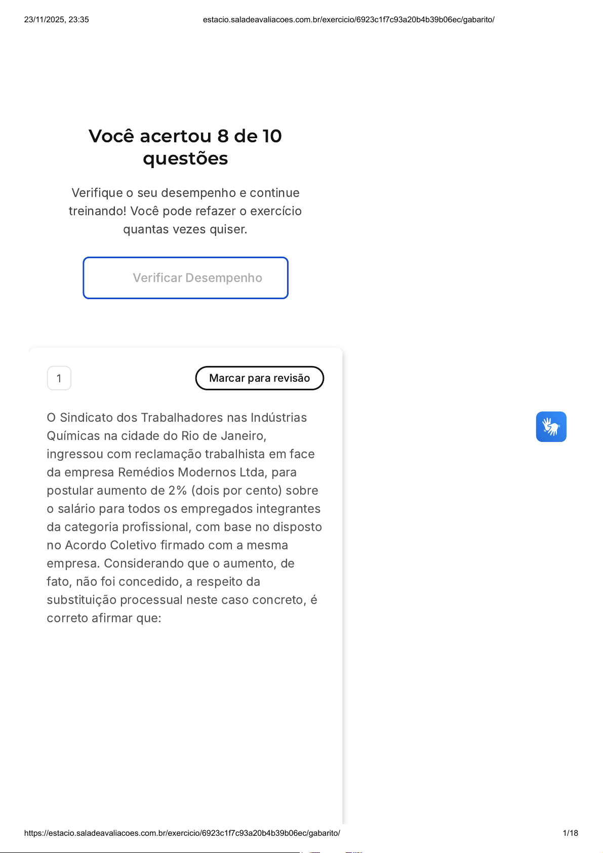 Você acertou 8 de 10 questões Verifique o seu desempenho e continue treinando! Você pode refazer o exercício quantas vezes quiser. Verificar Desempenho 1 Marcar para revisão O Sindicato dos Trabalhadores nas Indústrias Químicas na cidade do Rio de Janeiro, ingressou com reclamação trabalhista em face da empresa Remédios Modernos Ltda, para postular aumento de 2% (dois por cento) sobre o salário para todos os empregados integrantes da categoria profissional, com base no disposto no Acordo Coletivo firmado com a mesma empresa. Considerando que o aumento, de fato, não foi concedido, a respeito da substituição processual neste caso concreto, é correto afirmar que: 23/11/2025, 23:35 estacio.saladeavaliacoes.com.br/exercicio/6923c1f7c93a20b4b39b06ec/gabarito/ https://estacio.saladeavaliacoes.com.br/exercicio/6923c1f7c93a20b4b39b06ec/gabarito/ 1/18 A B C D E Não é possível, pois o único caso em que se admite a substituição processual é o previsto no artigo 195, §2º da CLT (adicional de insalubridade); É possível, mas necessita da autorização expressa de todos os empregados substituídos; É possível, independentemente de autorização dos substituídos, pois a legitimidade do Sindicato é ampla e irrestrita nos termos da Constituição; Não é possível, pois estamos diante de direitos individuais, devendo cada empregado ajuizar reclamação trabalhista própria; Não se trata de substituição processual, mas de representação processual, pois o Sindicato comparece em nome alheio para defender os direitos dos representados. Resposta correta Parabéns, você selecionou a alternativa correta. Confira o gabarito comentado! Gabarito Comentado De acordo com a Constituição (artigo 8º, III), o Sindicato possui legitimidade extraordinária ampla e irrestrita, que abrange tanto os direitos individuais quanto 23/11/2025, 23:35 estacio.saladeavaliacoes.com.br/exercicio/6923c1f7c93a20b4b39b06ec/gabarito/ https://estacio.saladeavaliacoes.com.br/exercicio/6923c1f7c93a20b4b39b06ec/gabarito/ 2/18 A B C os coletivos dos membros da categoria. Isso significa que o Sindicato pode representar os trabalhadores em questões judiciais, sem a necessidade de autorização expressa de cada um. Essa prerrogativa é reforçada pela Orientação Jurisprudencial 359 da SDI-1 do TST, que admite a interrupção da prescrição de ações individuais pelo simples ajuizamento da ação movida pelo sindicato. Portanto, no caso apresentado, é possível a substituição processual pelo Sindicato, independentemente de autorização dos substituídos. 2 Marcar para revisão É correto afirmar que a ação de cumprimento ajuizada pelo sindicato dos trabalhadores é hipótese de: Representação processual, já que o sindicato não é parte, mas apenas atua em nome do representado; Substituição processual, pois a ação é ajuizada em nome próprio, mas em defesa de direito alheio; Substituição processual, pois a ação é ajuizada em nome alheio para defender direito de outrem; 23/11/2025, 23:35 estacio.saladeavaliacoes.com.br/exercicio/6923c1f7c93a20b4b39b06ec/gabarito/ https://estacio.saladeavaliacoes.com.br/exercicio/6923c1f7c93a20b4b39b06ec/gabarito/ 3/18 D E Legitimidade ordinária, pois o sindicato figura como representante dos interesses da categoria em juízo; Legitimidade extraordinária que surge com a inércia do legitimado ordinário. Resposta correta Parabéns, você selecionou a alternativa correta. Confira o gabarito comentado! Gabarito Comentado A situação descrita no enunciado é um exemplo de substituição processual (legitimidade extraordinária). Nesse caso, o sindicato atua em nome próprio, mas defende os interesses ou direitos dos trabalhadores da categoria profissional que representa. Isso difere da representação processual, na qual o sindicato atuaria em nome de terceiros. É importante destacar que o artigo 872, parágrafo único da CLT, autoriza o sindicato a ajuizar a ação de cumprimento na tutela dos direitos dos trabalhadores. 3 Marcar para revisão Sobre a competência da Justiça do Trabalho, a Consolidação das Leis do Trabalho e as Súmulas do Tribunal Superior do Trabalho estabelecem: 23/11/2025, 23:35 estacio.saladeavaliacoes.com.br/exercicio/6923c1f7c93a20b4b39b06ec/gabarito/ https://estacio.saladeavaliacoes.com.br/exercicio/6923c1f7c93a20b4b39b06ec/gabarito/ 4/18 A B C A competência territorial das Varas do Trabalho é determinada pela localidade onde o empregado prestar serviços ao empregador, ainda que tenha sido contratado noutro local ou no estrangeiro, desde que seja o autor da ação. Quando for parte de dissídio agente ou viajante comercial, a competência será da Vara da localidade em que a empresa tenha agência ou filial e a esta o empregado esteja subordinado e, na falta, será competente a Vara do domicílio do empregado ou a da localidade mais próxima. Se o empregado for brasileiro, a Justiça do Trabalho brasileira tem competência para processar e julgar os dissídios ocorridos em agência ou filial no estrangeiro, ainda que haja convenção internacional dispondo em contrário. 23/11/2025, 23:35 estacio.saladeavaliacoes.com.br/exercicio/6923c1f7c93a20b4b39b06ec/gabarito/ https://estacio.saladeavaliacoes.com.br/exercicio/6923c1f7c93a20b4b39b06ec/gabarito/ 5/18 D E A Justiça do Trabalho é competente para determinar o recolhimento das contribuições previdenciárias, em relação às sentenças condenatórias em pecúnia que proferir e aos valores, objeto de acordo homologado, que integram o salário de contribuição, inclusive, no caso de reconhecimento de vínculo empregatício, quanto aos salários pagos durante a contratualidade. A Justiça do Trabalho é competente para processar e julgar as ações de indenização por danos morais e materiais decorrentes da relação de trabalho, inclusive as oriundas de acidente de trabalho e doenças a ele equiparados, ainda que propostas pelos dependentes, desde que habilitados no Inst