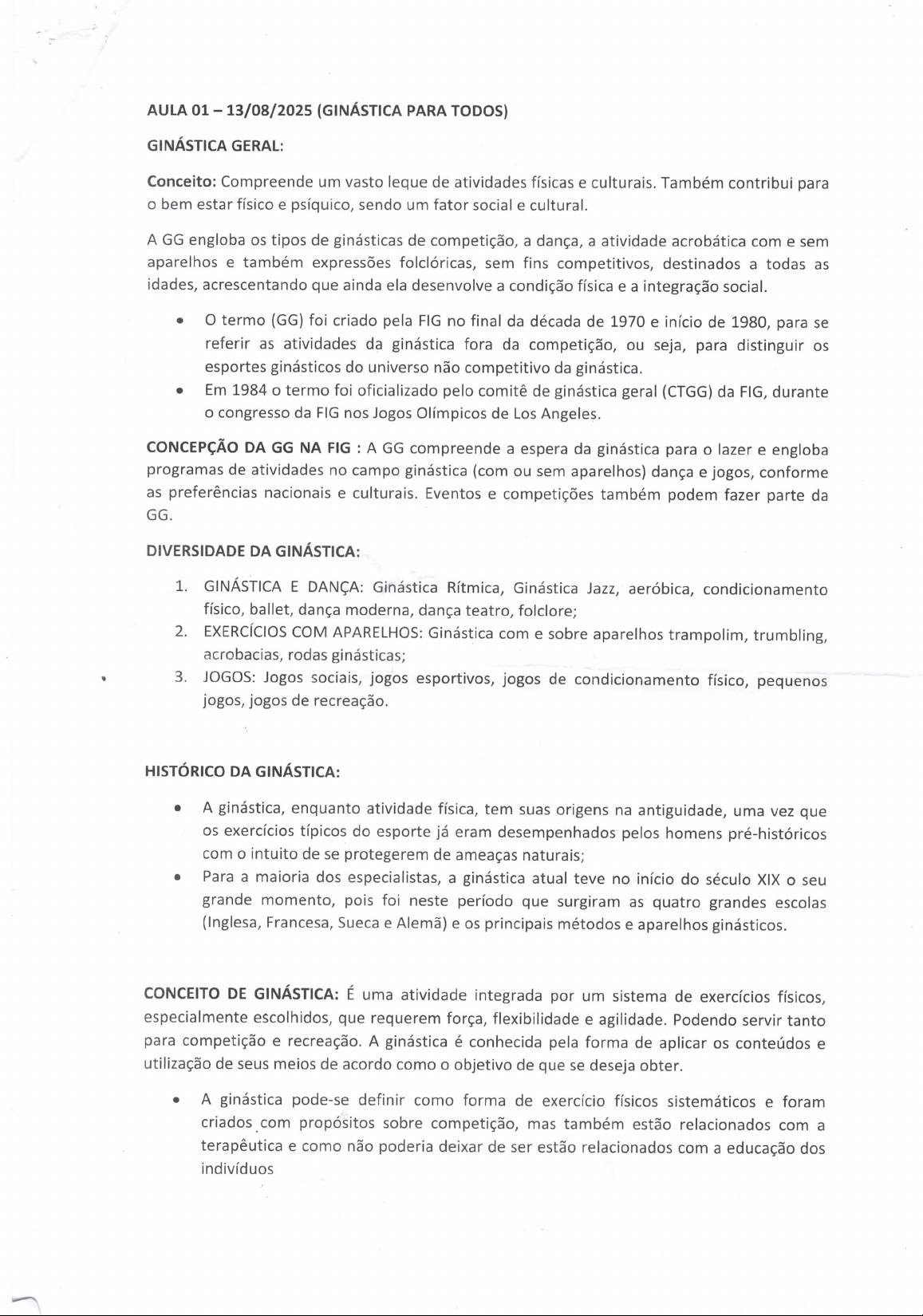 AULA 01 13/08/2025 (GINÁSTICA PARA TODOS) GINÁSTICA GERAL: Conceito: Compreende um vasto leque de atividades físicas e culturais. Também contribui para o bem estar físico e psíquico, sendo um fator social e cultural. A GG engloba os tipos de ginásticas de competição, a dança, a atividade acrobática com e sem aparelhos e também expressões folclóricas, sem fins competitivos, destinados a todas as idades, acrescentando que ainda ela desenvolve a condição física e a integração social. O termo (GG) foi criado pela FIG no final da década de 1970 e início de 1980, para se referir as atividades da ginástica fora da competição, ou seja, para distinguir os esportes ginásticos do universo não competitivo da ginástica. Em 1984 termo foi oficializado pelo comitê de ginástica geral (CTGG) da FIG, durante congresso da FIG nos Jogos Olímpicos de Los Angeles. CONCEPÇÃO DA GG NA FIG A GG compreende a espera da ginástica para lazer e engloba programas de atividades no campo ginástica (com ou sem aparelhos) dança e jogos, conforme as preferências nacionais e culturais. Eventos e competições também podem fazer parte da GG. DIVERSIDADE DA GINÁSTICA: 1. GINÁSTICA E DANÇA: Ginástica Rítmica, Ginástica Jazz, aeróbica, condicionamento físico, ballet, dança moderna, dança teatro, folclore; 2. EXERCÍCIOS COM APARELHOS: Ginástica com e sobre aparelhos trampolim, trumbling, acrobacias, rodas ginásticas; 3. JOGOS: Jogos sociais, jogos esportivos, jogos de condicionamento físico, pequenos jogos, jogos de recreação. HISTÓRICO DA GINÁSTICA: A ginástica, enquanto atividade física, tem suas origens na antiguidade, uma vez que os exercícios típicos do esporte já eram desempenhados pelos homens pré-históricos com intuito de se protegerem de ameaças naturais; Para a maioria dos especialistas, a ginástica atual teve no início do século XIX o seu grande momento, pois foi neste período que surgiram as quatro grandes escolas (Inglesa, Francesa, Sueca e Alemã) e os principais métodos e aparelhos ginásticos. CONCEITO DE GINÁSTICA: É uma atividade integrada por um sistema de exercícios físicos, especialmente escolhidos, que requerem força, flexibilidade e agilidade. Podendo servir tanto para competição e recreação. A ginástica é conhecida pela forma de aplicar os conteúdos e utilização de seus meios de acordo como objetivo de que se deseja obter. A ginástica pode-se definir como forma de exercício físicos sistemáticos e foram criados com propósitos sobre competição, mas também estão relacionados com a terapêutica e como não poderia deixar de ser estão relacionados com a educação dos indivíduosAULA 02 20/08/2025 (GINÁSTICA PARA TODOS) CONTINUAÇÃO: CARACTERÍSTICAS: Oportunizar a participação do maior número de pessoas em atividade física de lazer fundamentadas nas atividades de ginástica. Integrar várias possibilidades de manifestações corporais às atividades de ginástica. Oportunizar a auto superação sociocultural entre os participantes ativos ou não. Manter e desenvolver o bem estar físico e psíquico pessoal; Promover uma melhor compreensão entre os indivíduos e os povos em geral; Oportunizar a valorização do trabalho coletivo, sem deixar de valorizar a individualidade neste contexto. Realizar eventos que proporcionem experiências de beleza estética a partir dos movimentos apresentados tanto aos participantes ativos quanto aos espectadores; Desenvolver a cultura através das manifestações folclóricas; Mostrar nos eventos as tendências da ginástica; Modalidades Competitivas: Ginástica Artística: Envolve elementos de força, flexibilidade, equilíbrio e agilidade em aparelhos como barras assimétricas, trave de equilíbrio, solo e salto sobre cavalo (feminino), e argolas, barra fixa, cavalo com alças, solo, salto sobre o cavalo e barras paralelas (masculino). Ginástica Rítmica: Combina elementos de dança, acrobacias e uso de aparelhos como corda, arco, bola, maças e fita. Ginástica Acrobática: Foca em elementos acrobáticos em dupla, trio ou grupo, com movimentos de sustentação e lançamentos. Ginástica de Trampolim: Utiliza o trampolim como aparelho principal para a execução de acrobacias aéreas. Ginástica Aeróbica: É uma modalidade de alta intensidade que combina movimentos aeróbicos com elementos acrobáticos, usando música como guia. Modalidades Não Competitivas: Ginástica Geral: Abrange um conjunto de atividades físicas e expressivas que promovem desenvolvimento integral do indivíduo, incluindo atividades em grupo e individuais. Ginástica Localizada: Envolve exercícios específicos para fortalecer e tonificar grupos musculares, frequentemente praticada em academias. Hidroginástica: É uma forma de exercício físico praticada na água, com benefícios para a saúde cardiovascular e muscular. Ginástica Laboral: Realizada no ambiente de trabalho para prevenir lesões e melhorar bem-estar dos funcionários.AULA 03 03/09/2025 (GINÁSTICA PARA TODOS) Conceito, estrutura e funcionamento da GPT INTRODUÇÃO: A ginástica não se limita ao esporte competitivo (GA e GR) Existe também uma vertente educativa, cultural e inclusiva: Ginástica Para Todos; Ela é reconhecida oficialmente pela Federação Internacional de Ginástica FIG e até eventos mundiais, como a GYMNAESTRADA. CONCEITO DE GINÁSTICA PARA TODOS: É uma manifestação da ginástica voltada para todas as pessoas, independentemente de idade, sexo, habilidade ou condição física; Valoriza a participação, a cooperação e a diversidade, e não a competição; Busca o desenvolvimento global: físico, social, cultural e artístico; Caracteriza-se por apresentações coletivas que unem movimento, música, expressão corporal, e muitas vezes, elementos culturais. ESTRUTURA DA GINÁSTICA PARA TODOS: Participação livre: aberta a todas as idades e níveis de habilidade; Atividades diversificadas: podem incluir elementos de
