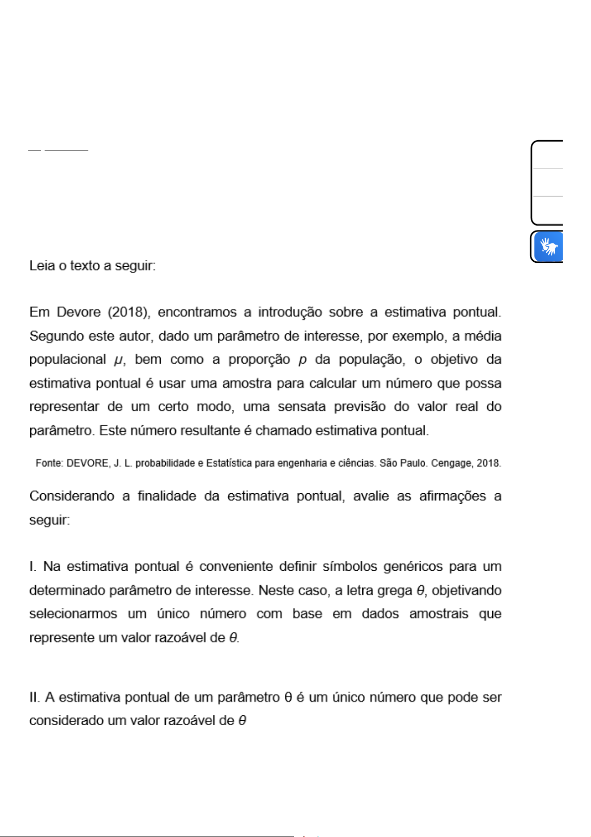 Atividade 4 Iniciado: 31 out em 16:54 Instruções do teste Pergunta 1 0,2 pts Importante: Caso você esteja realizando a atividade através do aplicativo "Canvas Student", é necessário que você clique em "FAZER O QUESTIONÁRIO", no final da página. A+ A A- 31/10/25, 17:10 Teste: Atividade 4 https://famonline.instructure.com/courses/48435/quizzes/232183/take 1/6 Pergunta 2 0,2 pts II, apenas. III, apenas. II e III, apenas. I, II e III. I e II, apenas. A+ A A- 31/10/25, 17:10 Teste: Atividade 4 https://famonline.instructure.com/courses/48435/quizzes/232183/take 2/6 Pergunta 3 0,2 pts Escolha a alternativa correta que define quais dados da população de mal pagadores eram disponíveis para DOGBERT. E também quais dados amostrais eram disponíveis por DOGBERT para poder negar ou conceder o crédito aos clientes: A+ A A- 31/10/25, 17:10 Teste: Atividade 4 https://famonline.instructure.com/courses/48435/quizzes/232183/take 3/6 Pergunta 4 0,2 pts III, apenas. II e III, apenas. I e III, apenas. I, apenas. I e II, apenas. A+ A A- 31/10/25, 17:10 Teste: Atividade 4 https://famonline.instructure.com/courses/48435/quizzes/232183/take 4/6 Pergunta 5 0,2 pts Ao nível de 5% de significância, concluí-se que as bancadas que estão sendo produzidas devem ter altura diferente do especificado, maiores que 0,85 m. Ao nível de 5% de significância, nada pode concluir sobre as bancadas que estão sendo produzidas, e portanto, devem ser descartadas. Ao nível de 5% de significância, concluí-se que as bancadas que estão sendo produzidas devem ter altura que atende ao especificado, isto é, igual a 0,85 m. Considerando esse contexto, avalie as seguintes asserções e a relação proposta entre elas. A+ A A- 31/10/25, 17:10 Teste: Atividade 4 https://famonline.instructure.com/courses/48435/quizzes/232183/take 5/6 Salvo em 17:10 I. Para determinar este intervalo de confiança para o preço médio da gasolina no Rio de Janeiro deverá ser usada a distribuição normal de probabilidade e o valor crítico será igual a 1,96. PORQUE II. Para o preço da gasolina nos postos da cidade do Rio de Janeiro, neste caso, se utiliza a distribuição normal, além de a média populacional e o desvio padrão populacional serem conhecidos. A respeito dessas asserções, assinale a opção correta: As asserções I e II são proposições verdadeiras, mas a II não é uma justificativa da I. As asserções I e II são proposições verdadeiras, e a II é uma justificativa da I. A asserção I é uma proposição falsa, e a II é uma proposição verdadeira. A asserção I é uma proposição verdadeira, e a II é uma proposição falsa. As asserções I e II são proposições falsas. Enviar teste A+ A A- 31/10/25, 17:10 Teste: Atividade 4 https://famonline.instructure.com/courses/48435/quizzes/232183/take 6/6