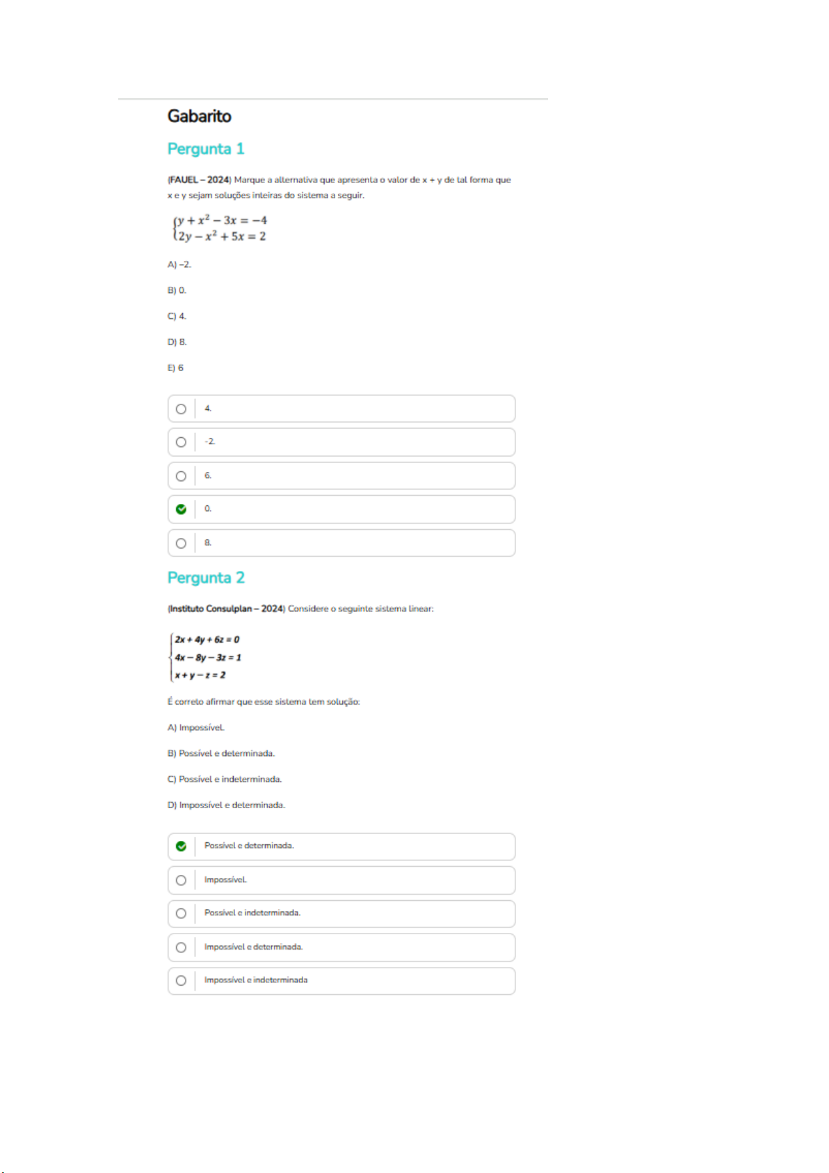 Gabarito Pergunta 1 (FAUEL - 2024) Marque a alternativa que apresenta o valor de + y de tal forma que xe y sejam soluções inteiras do sistema a seguir. A)-2. D) E) 6 4. 6. 0. 8. Pergunta 2 Consulplan - 2024) Considere seguinte sistema x+y-z=2 É correto afirmar que esse sistema tem solução: A) B) e determinada. C) e D) Impossivel e determinada. Possivel e determinada. Impossivel. Possivel e indeterminada. Impossivel e determinada. Impossivel e indeterminada