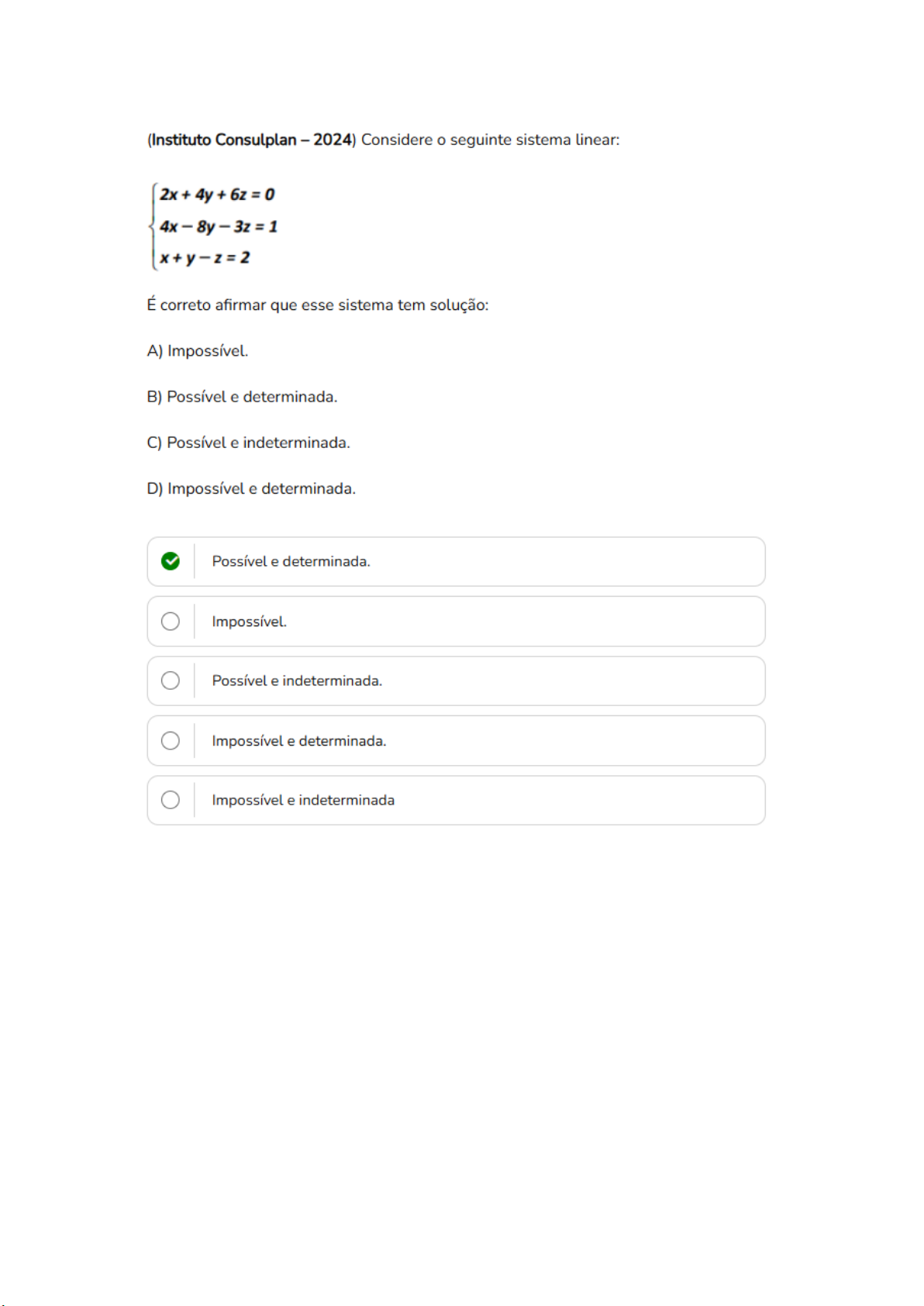 (Instituto Consulplan - 2024) Considere seguinte sistema linear: 4x-8y-3z=1 x+y-z=2 É correto afirmar que esse sistema tem solução: A) Impossível. B) Possível e determinada. C) Possível e indeterminada. D) Impossível e determinada. Possível e determinada. Impossível. Possível e indeterminada. Impossível e determinada. Impossível e indeterminada
