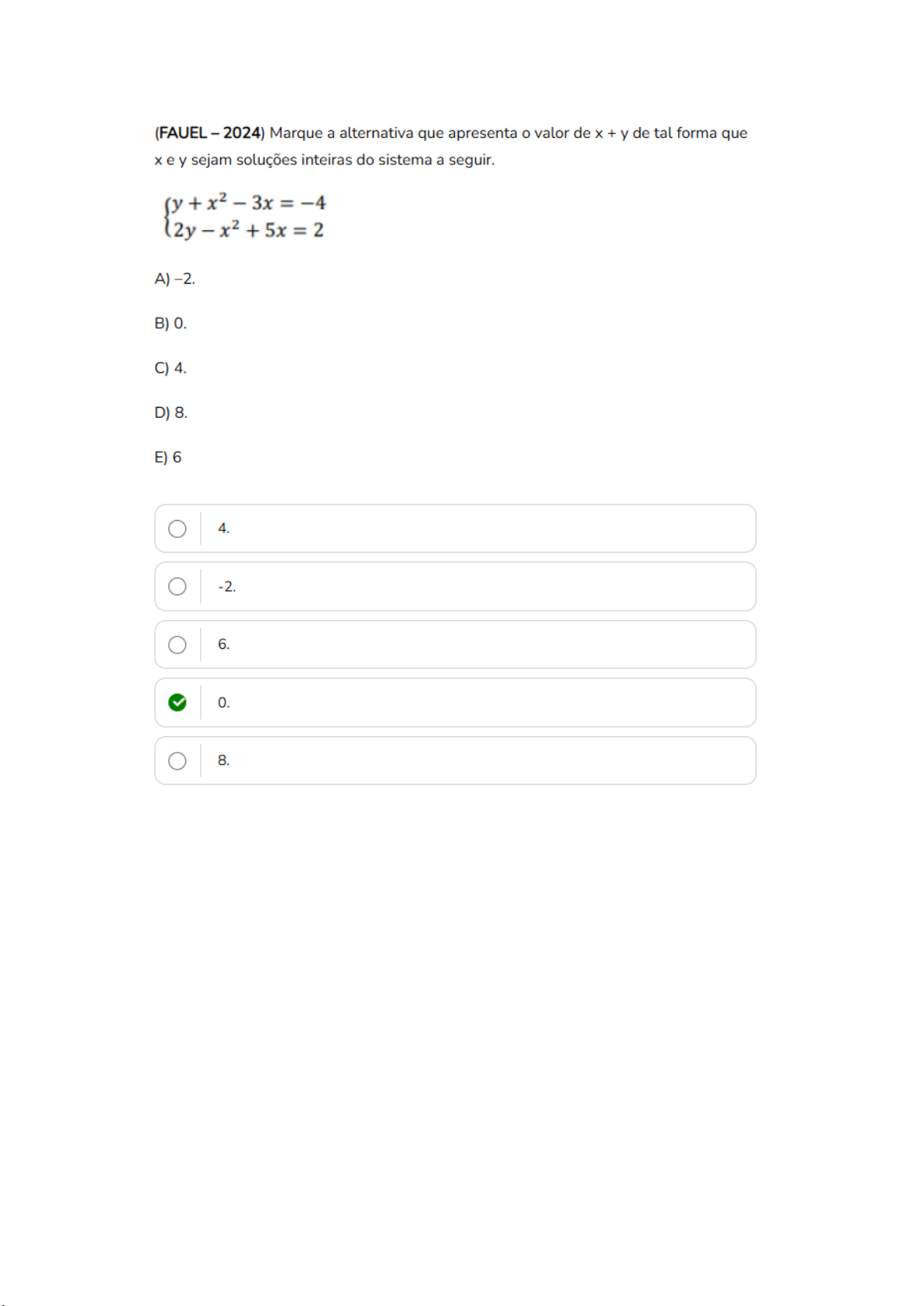 (FAUEL - 2024) Marque a alternativa que apresenta valor de de tal forma que xey sejam soluções inteiras do sistema a seguir. B) 0. C) 4. D) 8. E) 6 4. -2. 6. 0. 8.