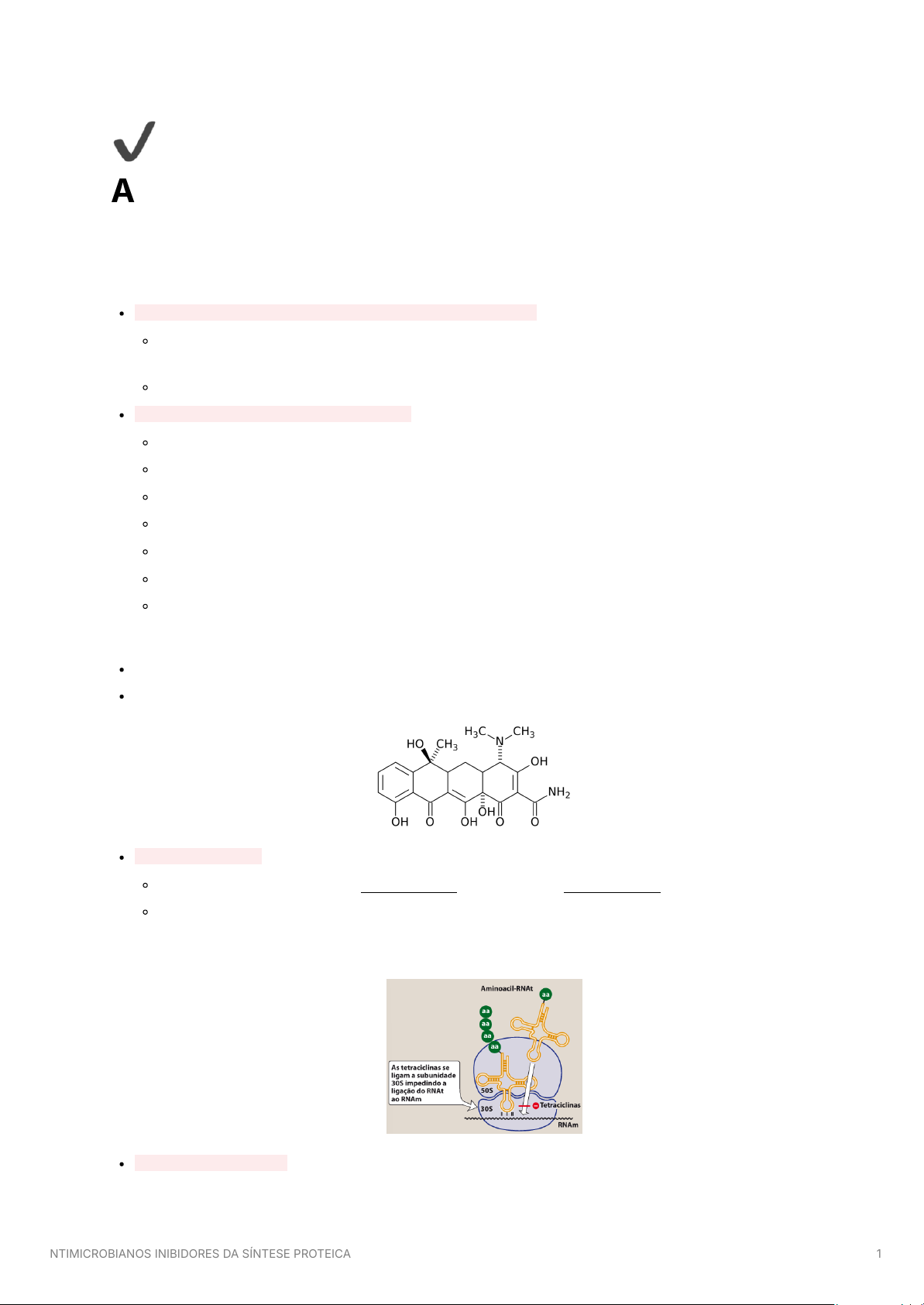 ✔ ANTIMICROBIANOS INIBIDORES DA SÍNTESE PROTEICA INTRODUÇÃO ação nos ribossomos bacterianos e inibição da síntese proteica por que não atinge a síntese proteica humana? porque possuem seletividade pelos ribossomos bacterianos 30s e 50s) e não pelos humanos 40s e 60s) ribossomos mitocondriais humanos → semelhantes aos ribossomos bacterianos → possível toxicidade quais são os inibidores de síntese proteica? tetraciclinas e glicilciclinas aminoglicosídeos macrolídeos/cetolídeos macrocíclicos lincosamidas oxazolidinonas outros → cloranfenicol, quinupristina + dalfopristina TETRACICLINAS tetraciclo 4 ciclos 4 anéis fundidos CICLINAS tetraciclina, doxiciclina, minociclina, demeclociclina mecanismo de ação entrada no micro-organismo por difusão passiva (porinas) ou por transporte ativo impede que o RNAt-aminoacil se ligue ao sítio A do complexo RNAm-ribossomo → inibição da decodificação (escolha do RNAt correto)→ impedimento da tradução → bacteriostático (para usar em pcts com sistema imune funcional) espectro antibacteriano ANTIMICROBIANOS INIBIDORES DA SÍNTESE PROTEICA 1 boa atividade para grupos diversos gram+ >>>>> gram- oa atividade contra Streptococcus pyogenes G e Streptococcus pneumoniae G (sensíveis à penicilina) excelente atividade contra MRSA e MSSA G comum resistência em estrepto do grupo B S. agalactiae) e S. pneumoniae G resistentes à penicilina Bacillus anthracis G e Listeria monocytogenes são suscetíveis G limitada atividade contra enterococos G algumas enterobactérias com resistência G uso com frequência no tto de infecções por Chlamydia G resistência bacteriana mediada por plasmídeos e frequentemente induzida bomba de efluxo inativação enzimática produção de proteína de proteção ribossômica (tetM que impede a ligação da tetraciclina à subunidade 30s obs.: resistência a uma tetraciclina não confere resistência universal a todas farmacocinética absorção boa absorção oral ingestão concomitante de cátions divalentes e trivalentes Ca2, Mg2, Al3, Fe2/3, Zn2 diminuem a absorção → formação de quelatos, principalmente com tetraciclina (deve ser adm em jejum) → evitar ingestão concomitante de antiácidos, produtos lácteos, sais de cálcio, magnésio, ferro ou zinco t 1/2 6 a 12h doxiciclina e minociclina disponíveis VO e IV, alimentos não interferem na absorção, tem meia-vida maior distribuição alto volume aparente de distribuição ANTIMICROBIANOS INIBIDORES DA SÍNTESE PROTEICA 2 40 a 80% de ligação com proteínas séricas se concentram na bile, fígado, rins, líquido gengival e pele se fixam nos tecidos em calcificação minociclina e doxiciclina atingem níveis terapêuticos no LCR atravessam as barreiras placentárias e são encontradas em alta concentração no leite materno metabolismo tetraciclina, minociclina e doxiciclina → biotransformação hepática eliminação tetraciclina eliminada inalterada doxiciclina inalterada eliminada pela bile nas fezes e um pouco na urina efeitos adversos desconforto gastrintestinal, azia, esofagite depósito nos ossos e na dentição primária → coloração, hipoplasia dos dentes, interrupção do crescimento hepatotoxicidade → raro, em pcts com disfunção hepática/renal ou gestantes fototoxicidade → queimaduras em pcts que receberam tetraciclinas quando expostos à luz UV disfunção vestibular → minociclina e doxiciclina → concentração na endolinfa do ouvido dano fetal em gestantes pseudotumor cerebral → raro, HIC benigna, reversível contraindicações gestantes, lactantes, crianças 8a GLICILCICLINAS representante único → tigeciclina → derivado da minociclina 4 anéis + radical parecido com a glicina ampliação do espectro em relação às tetraciclinas indicada no tto de infecções complicadas de pele, tecidos moles e intra-abdominais mecanismo de ação → igual das tetraciclinas espectro antibacteriano MRSA estrepto resistentes a múltiplos fármacos enterococos resistentes à vanco espectro estendido para gram- produtoras de β-lactamases resistência → bombas de efluxo farmacocinética apenas IV ANTIMICROBIANOS INIBIDORES DA SÍNTESE PROTEICA 3 grande volume de distribuição → boa penetração nos tecidos, concentração plasmática baixa ruim para infecções em corrente sanguínea eliminação biliar/fecal → não precisa fazer ajuste de dose para nefropatas ajuste de dose em disfunção hepática efeitos adversos náuseas, êmese pancreatite aguda elevação das enzimas hepáticas e da creatinina fotossensibilidade pseudotumor cerebral hiperpigmentação dentária dano fetal em gestantes pode diminuir a depuração da varfarina → aumenta o TAP AMINOGLICOSÍDEOS dois aminoaçúcares unidos por ligação glicosídica derivados de Streptomyces sp. e Micromonospora sp. amicacina, estreptomicina, gentamicina, neomicina, tobramicina usar para BACILOS GRAM AERÓBICOS mecanismo de ação passa pela membrana externa da gram- por difusão passiva (porinas) passagem pela membrana interna dependente de oxigênio (por isso só funciona para bactérias aeróbicas) ligação irreversível com a subunidade 30s do ribossomo bacteriano, distorcendo sua estrutura leitura incorreta do RNAm → afeta a tradução único inibidor de síntese proteica que é bactericida efeito concentração-dependente (posso administrar em bólus) Cmax de 8 a 10x a CIM ANTIMICROBIANOS INIBIDORES DA SÍNTESE PROTEICA 4 efeito pós-antimicrobiano → quanto maior a dosagem, mais longo o EPA uso de altas dosagens em menos administrações ao dia é mais vantajoso espectro antimicrobiano maioria dos bacilos aeróbicos gram-, inclusive os resistentes a vários fármacos Pseudomonas aeruginosa, Klebsiella pneumoniae, Enterobacter sp. associação com β-lactâmicos para infecções graves por gram+ gentamicina + ampicilina → Enterococcus, Streptococcus agalactiae resistência bacteriana bomba de efluxo diminuição da captação inativação en