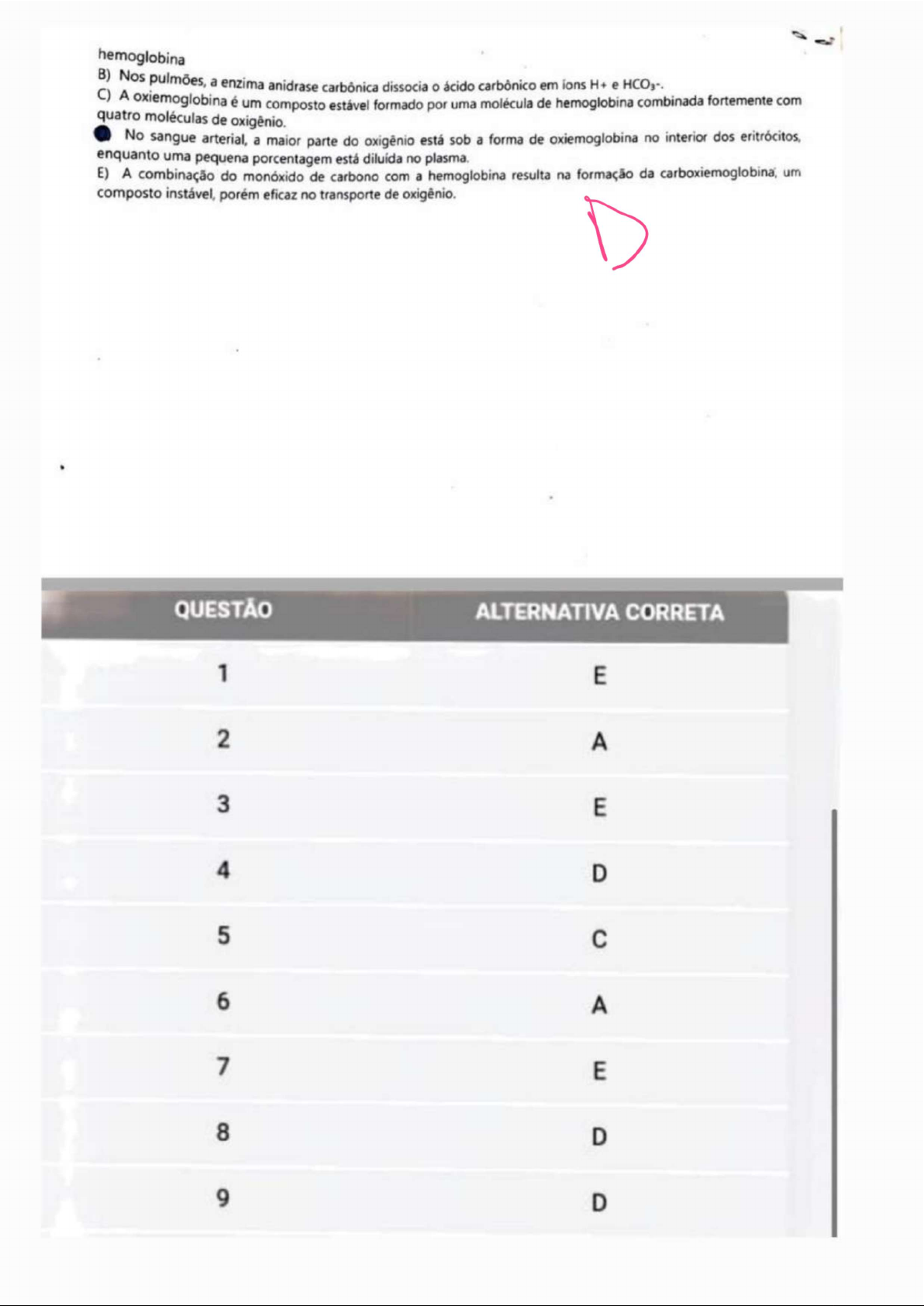 hemoglobina B) Nos pulmões, a enzima anidrase carbônica dissocia o ácido carbônico em ions H+ e C) A oxiemoglobina é um composto estável formado por uma molécula de hemoglobina combinada fortemente com quatro moléculas de oxigênio. No sangue arterial, a maior parte do oxigênio está sob a forma de oxiemoglobina no interior dos eritrócitos, enquanto uma pequena porcentagem está diluída no plasma. E) A combinação do monóxido de carbono com a hemoglobina resulta na formação da um composto instável, porém eficaz no transporte de oxigênio. QUESTÃO ALTERNATIVA CORRETA 1 E 2 A 3 E 4 D 5 c 6 A 7 E 8 D 9 Drespiratório. D) Glote, em função de a faringe ser um órgão comum de passagem tanto do aparelho digestório como do respiratório. E) Epiglote, em função de a boca ser um órgão comum de passagem tanto do aparelho digestório como do Questão 6: Nos seres vivos, as trocas de materiais entre organismo e ambiente devem-se, basicamente, aos processos a seguir numerados. Difusão através de membranas Osmose através de membranas semipermeáveis. III Transporte ativo. A absorção de e o desprendimento de CO2, em todos os seres vivos, são explicados, exclusivamente, por: I. B) II. C) III. D) e III. E) e III. Questão 7: Ao observarmos a circulação humana, quando comparamos artérias e veias, podemos afirmar que: A) Veias conduzem sempre sangue carbonado, assim como as artérias sempre possuem sangue oxigenado. B) Veias levam sangue do coração para os tecidos, e as artérias trazem sangue dos tecidos para coração. C) Artérias e veias apresentam grande número de válvulas que impedem retorno do sangue ao coração. D) grau de elasticidade do tecido muscular liso presente em artérias e veias é mesmo. A pressão do sangue nas veias é mais baixa que nas Questão 8: Para formar a respiração, a função dos músculos é essencial tanto na quanto na expiração. Esses músculos são respectivamente: Inspiração: músculo diafragma e intercostais externos. B) Expiração: músculo diafragma e intercostais externos. C) Inspiração: músculos abdominais e intercostais internos. Expiração: músculos abdominais e intercostais internos. E) Alternativas b e estão corretas. Questão 9: Com relação à circulação humana, analise as afirmativas a seguir e assinale a opção correta: sangue venoso, que contém dióxido de carbono excretado pelas diversas células do organismo, passa pelo coração e, circulando por veias, vai até os pulmões. Substâncias não utilizadas pelas células e que podem prejudicar organismo quando acumuladas, passam para sangue e são eliminadas pelos rins e pelos pulmões. III No dos alvéolos pulmonares, dióxido de carbono é liberado e oxigênio absorvido pelo sangue. sangue arterial volta ao coração circulando por veias e dai é bombeado para todo corpo via artérias. A) Todas estão corretas. B) Apenas a I está correta. Apenas a II é falsa. Estão corretas a e III. E) Todas são falsas. Questão 10: No homem, as trocas gasosas que ocorrem em alvéolos pulmonares, capilares e tecidos acontecem em função das diferenças de pressão parcial de O₂ e de no sangue e no ar alveolar. Em relação a esse mecanismo, pode-se afirmar que: A) Aproximadamente, 30% do transportado pelo sangue estão dissolvidos no plasma e 70% combinados com aA) impulsionado pela contração do ventriculo esquerdo segue para os pulmões através do vaso por 1. B) A sistole atrial e a sistole ventricular ocorrem simultaneamente no ciclo sangue proveniente dos pulmões chega coração atraves da arteria pulmonar, representada por 2 D) A sistole ventricular promove a abertura das valvulas atrioventriculares favorecendo retorno do sangue aos sangue pela circulação sistémica chega coração pelas veias cavas representadas por 3 Questão 2: Qual comprometeria mais a função do sistema digestório e por a remoção dos vinte e cinco iniciais do intestino delgado (duodeno) ou a remoção de igual porção do do intestino grosso? A remoção do duodeno seria mais pois nele ocorre a maior parte da digestão intestinal B) A remoção do duodeno seria mais pois nele ocorre a absorção de toda a agua de que o organismo necessita para C) A remoção do intestino grosso seria mais pois nele ocorre a maior parte da absorção dos produtos do processo D) A remoção do intestino grosso seria mais pois nele ocorre a absorção de toda a agua de que organismo necessita para E) As duas remoções seriam igualmente pois tanto no duodeno quanto no intestino grosso ocorrem digestão e absorção de nutrientes e de Questão 3: Beber água do mar em excesso pode levar à desidratação porque: A) excesso de sal causa diminuição de transpiração e aumento de temperatura. B) sal ingerido e excretado pela pele e ha obstrução das glândulas sudoriparas. C) aumento da quantidade de sais provoca diminuição da corrente D) Os sais ingeridos provocam alteração no processo de digestão dos alimentos. sal ingerido e excretado dissolvido em Questão 4: Na aula de Biologia, o professor pediu a seus alunos que analisassem a seguinte afirmação relativa à fisiologia da digestão: "A pepsina e a tripsina são enzimas produzidas no estômago e atuam preferencialmente em meio ácido". Essa afirmação: A) correta. B) ja que as duas enzimas não são C) Esta ja que as duas enzimas atuam preferencialmente em meio Esta ja que apenas a pepsina e produzida no e atua preferencialmente em meio E) Esta que apenas a tripsina e produzida no e atua preferencialmente em meio acido. Questão 5: "Quando os alimentos passam para o uma espécie de tampa de cartilagem fecha a traqueia. Com a idade, a perda progressiva do muscular leva a um fechamento menos aumentando risco da entrada de alimentos líquidos ou sólidos na traqueia" (Adaptado de Scientif American n. setembro de Em relação ao texto, assinale a opção que apresenta o nome correto dessa tampa protetora do tubo respiratório, e a condi