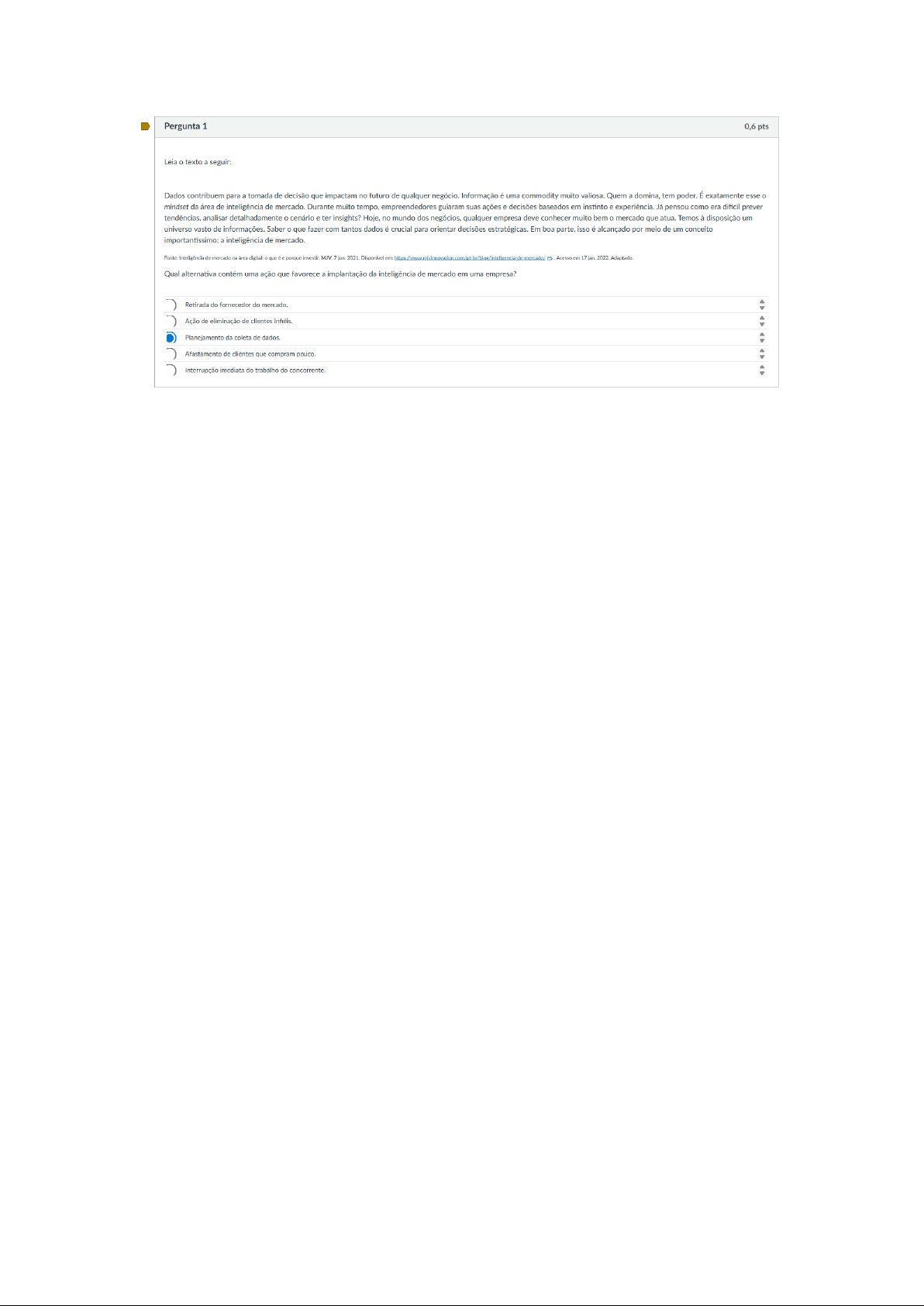 Questão 1: O nome desta disciplina é Inteligência de Marketing: Pesquisa de Mercado e aborda os aspectos formais e informais de levantar e analisa...