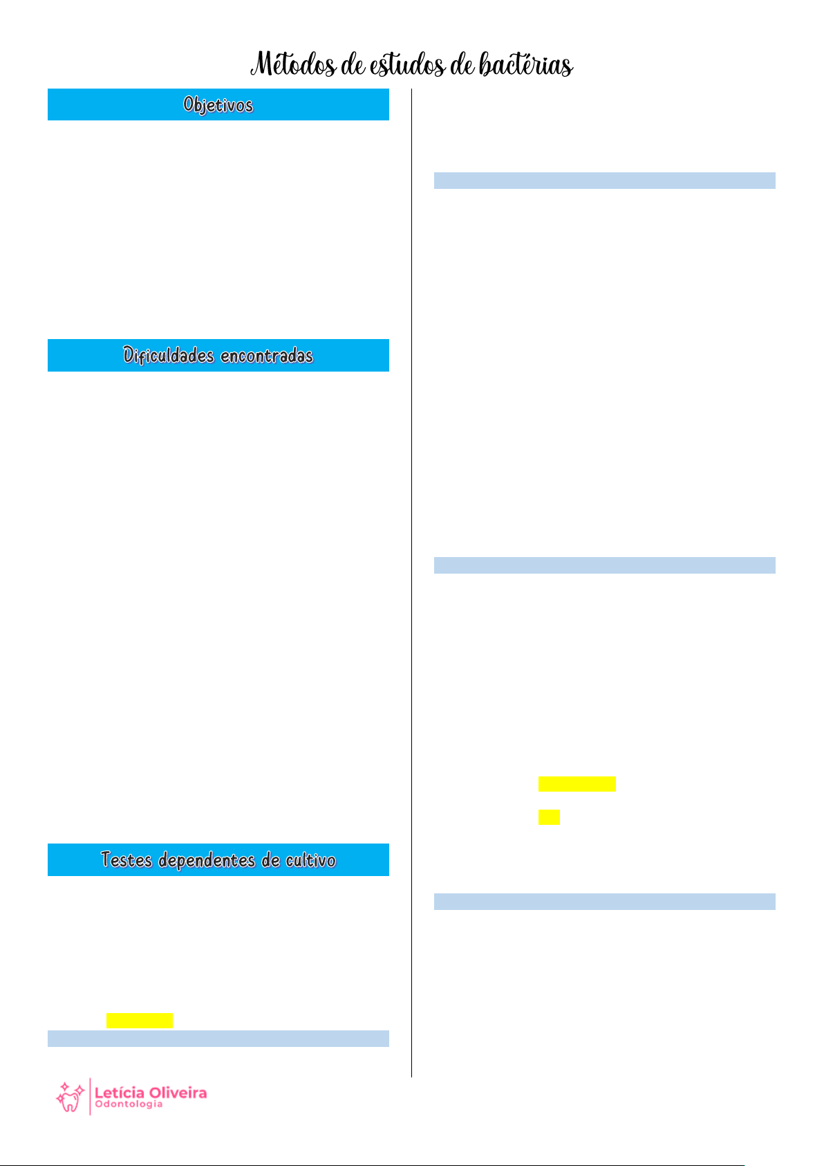 Métodos de estudos de bactérias • O estudo das bactérias visando à sua identificação, principalmente em termos de gênero e espécie, tem múltiplas aplicações e finalidades em microbiologia: • Diagnóstico microbiológico das diferentes doenças infecciosas que acometem o homem, principalmente em sua boca (saliva, biofilme, pus e sangue constituem os principais espécimes clínicos para o diagnóstico microbiológico) • Informação microbiológica completa e rápida da infecção • Identificação dos organismos • Susceptibilidade a antimicrobianos • Melhor opção terapêutica e tratamento • O primeiro aspecto que deve ser ressaltado é a grande dificuldade que o bacteriologista enfrenta quando tem que identificar uma espécie bacteriana. • A maioria dos seres vivos pode ser distinguida pelo simples exame morfológico. As bactérias não oferecem essa facilidade. • Bactérias são mais difíceis de identificar devido a morfologia semelhante. No entanto, o exame morfológico se torna extremamente útil quando da necessidade de detecção de bactérias não cultiváveis. • Nas últimas décadas do século XX começaram a surgir perspectivas de facilitamento dessa tarefa, com a utilização de métodos moleculares ou genéticos de identificação bacteriana. • Podemos citar algumas dificuldades encontradas para identificar as espécies: • Espécies são difíceis para cultivar e identificar • Características físicas de sítios de coleta • Sítios com progressão ativa diferente nos tempos de coleta (a amostra pode não servir mais devido a sucessão bacteriana) • A maior parte das infecções bucais são infecções mistas e presença de microrganismos oportunistas • As análises têm que ser executadas em laboratório de Microbiologia devido à necessidade de dispor de materiais adequados, como microscópio óptico comum, microscópio de contraste de fase ou de campo escuro, bateria de corantes, etc • Os testes usados para a identificação de bactérias em laboratório podem ser divididos em dois grandes grupos: dependentes de cultivo e independentes de cultivo • São os mais utilizados • Esse método depende de um conhecimento aproximado da provável composição da microbiota associada à condição que se pretende estudar, de forma a prover as condições atmosféricas e nutricionais adequadas aos mais variados tipos microbianos. • Necessita do material clinico fresco, meio de cultivo e bactérias vivas • Conta células viáveis • Útil para antibiograma Vantagens • É o único teste que se presta para a verificação de sensibilidade a drogas antimicrobianas (antibiograma, que indica a quais antibióticos a bactéria encontrada é sensível ou resistente para definir a melhor estratégia de tratamento para o paciente), desde que as bactérias sejam mantidas em condição de viabilidade. Desvantagens • São técnicas geralmente muito trabalhosas, a maioria dos resultados demanda alguns dias e em vários casos as bactérias são fastidiosas (demandam muitos dias para formar colônias) • Necessita de microrganismos viáveis para sua execução (alguns não são susceptíveis às mudanças ambientais) • Ainda não se tornou possível cultivar algumas bactérias (a maioria das bactérias orais, principalmente associadas a doenças periodontais e doenças infecciosas na região de cabeça e pescoço – majoritariamente anaeróbias – o que impede a realização do perfil de susceptibilidade a antimicrobianos) • Só estabelecem a identificação até nível de espécie, não se prestando, para a diferenciação de sorotipos ou genótipos • Baixa sensibilidade nos testes • A coleta necessita de cuidados, como o rápido transporte para o laboratório de análise e auxilio de meios de transporte adequados que impedem ou minimizam a desidratação e a oxidação dos materiais coletados, cuja preparação é trabalhosa, cara e necessita de mão-de- obra bastante qualificada Coleta do material e meios de transporte • A viabilidade de um grupo de microrganismos depende da composição dos diferentes meios de transporte. Assim, antes de coletarmos o material para análise, devemos ter um bom conhecimento sobre esse material para direcionarmos a escolha do meio de transporte e o processamento posterior desse material. Ideal: o material deve ser coletado em condições de assepsia e ser imediatamente processado no laboratório para manter ao máximo a viabilidade microbiana. Quando não possível: semeadura imediata do material-problema em meios de transporte adequados para cada material clínico. • Os meios de transporte (meios químicos) mais utilizados na atualidade são: ➢ VMGA III (Viability Maintaining Microsbiotatic Medium) ➢ RTF (Reduced Transport Fluid) ➢ PRAS (Solução de Ringer Pre-Reduced Anaerobically Sterilized) ➢ THM (Thioglycolate Medium) ➢ Stuart, adequado para streptococos Processamento laboratorial 1. Dispersão e diluição da amostra 2. Incubação 3. Exame de morfologia das colônias 4. Teste para identificação definitiva de bactérias (mais específicos, determinam a espécie por meio do fenótipo do organismo isolado) ➢ Provas bioquímicas: baseiam-se na detecção de atividades enzimáticas das bactérias, expressadas pela produção de catabólitos como: ácido, CO2, enzimas, exotoxinas, etc ➢ Provas sorológica: detectam antígenos de superfície na bactéria (imunofluorescência, imunoaglutinação do látex, ensaio de imunoabsorção acoplada a enzimas – ELISA); podem levar a reações cruzadas. ➢ Provas moleculares: trabalham com o DNA da bactéria (pode ser executada na ausência de bactérias viáveis, tornando dispensável a realização de cultivos) Testes independentes de cultivo • Constituídos, principalmente, pelos modernos testes de identificação genética de bactérias (testes genéticos/moleculares: sondas de DNA e PCR) Vantagens • Não necessitam de organism