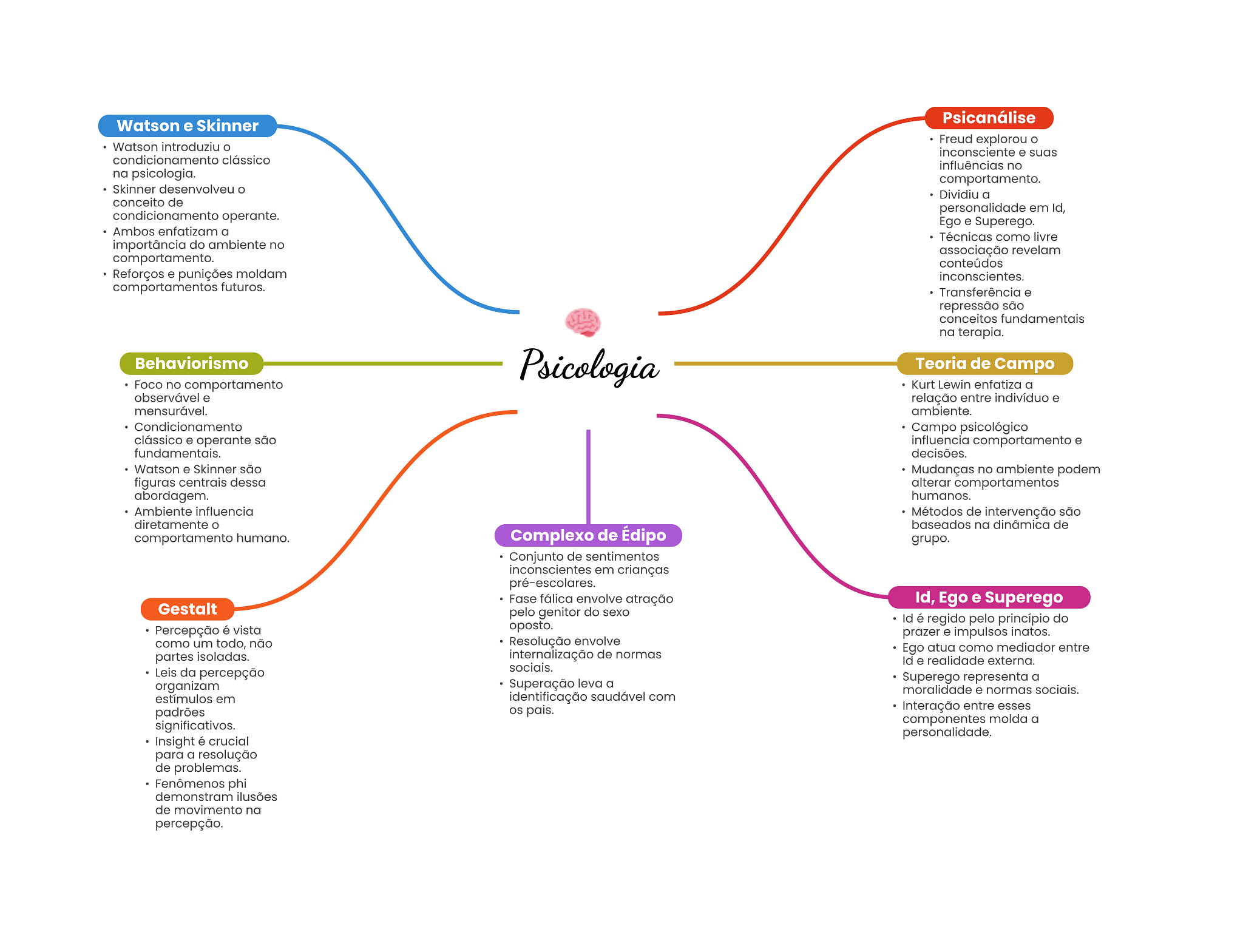 Psicanálise Watson e Skinner Freud explorou O Watson introduziu inconsciente e suas condicionamento clássico influências no na psicologia. comportamento. Skinner desenvolveu Dividiu a conceito de personalidade em Id, condicionamento operante. Ego e Superego. Ambos enfatizam a Técnicas como livre importância do ambiente no associação revelam comportamento. conteúdos Reforços e punições moldam inconscientes. comportamentos futuros. Transferência e repressão são conceitos fundamentais na terapia. Behaviorismo Psicologia Teoria de Campo Foco no comportamento Kurt Lewin enfatiza a observável e relação entre indivíduo e mensurável. ambiente. Campo psicológico clássico e operante são influencia comportamento e fundamentais. decisões. Watson e Skinner são Mudanças no ambiente podem figuras centrais dessa alterar comportamentos abordagem. humanos. Ambiente influencia Métodos de intervenção são diretamente baseados na dinâmica de comportamento humano. Complexo de Édipo grupo. Conjunto de sentimentos inconscientes em crianças pré-escolares. Fase fálica envolve atração Id, Ego e Superego Gestalt pelo genitor do sexo Id é regido pelo princípio do Percepção é vista oposto. prazer e impulsos inatos. como um todo, não Resolução envolve internalização de normas Ego atua como mediador entre partes isoladas. Id e realidade externa. Leis da percepção sociais. Superação leva a Superego representa a organizam moralidade e normas sociais. estímulos em identificação saudável com padrões OS pais. Interação entre esses significativos. componentes molda a personalidade. Insight é crucial para a resolução de problemas. Fenômenos phi demonstram ilusões de movimento na percepção.