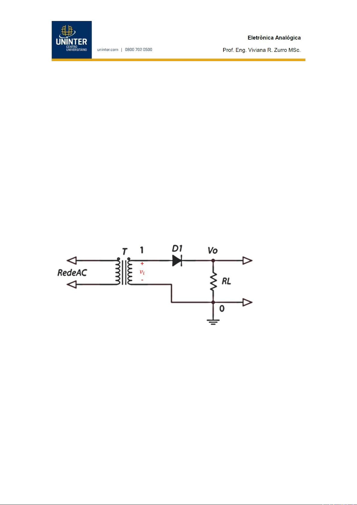 Atividade Prática OBJETIVO Entender o funcionamento dos circuitos não lineares utilizando diodos. Trabalhar com retificadores de meia onda e de onda completa. Montar circuitos básicos com amplificadores operacionais. PROCEDIMENTOS EXPERIMENTAIS EXPERIÊNCIA 1: Retificador de meia onda Separe os seguintes materiais Protoboard Transformador. Osciloscópio 1 Diodo 1N400X (1N4004, 1N4007 ou similar) 1 Resistor de 10 kΩ Foto do circuito montado no protoboard ou uma imagem da tela do simulador com o circuito montado. Figura 1: Representação do circuito. Figura 2: Foto do circuito Foto da imagem da tela do osciloscópio, mostrando os sinais de entrada e saída. Figura 3: Foto do osciloscópi0 Medição dos sinais de entrada e saída de um retificador de meia onda, na Tabela 1. Tabela 1: Sinais de entrada e saída de um retificador de meia onda. Parâmetro υi υ0 Tensão pico a pico [V] 43,2 V 20.6 Frequência [Hz] 60,0 Hz 60,0 Hz a) Explique o princípio de funcionamento do circuito A função do retificador de meia onda é cortar a parte negativa do sinal de entrada. No caso do sinal senoidal, ele corta o semiciclo negativo. A Figura 3 mostra um circuito retificador de meia onda, mostra a tensão de entrada (secundário do transformador – essa tensão está em verde, na figura) e a tensão de saída (em azul). Podemos observar que, no sinal de saída, o semiciclo negativo foi cortado. Conforme, observando no osciloscópio, notamos que ele deixa passar o semiciclo positivo e corta o semiciclo negativo, e representados na tabelas, o gráfico e as imagens do experimento. b) Justifique a forma de onda de saída. A forma de onda é caracterizada por ter o formato do semiciclo positivo (quando o diodo conduz) e um valor zero durante o tempo correspondente ao semiciclo negativo (quando o diodo bloqueia). No semiciclo negativo, o diodo está aberto, suportando toda a tensão do secundário do transformador. Essa tensão é chamada de tensão de pico inverso, e é muito importante verificar na folha de dados do dispositivo qual é a máxima tensão que o diodo aguenta, na polarização reversa. Se a tensão do circuito é maior do que a indicada pelo fabricante, o diodo romperá por avalanche, queimando. Curva de transferência Na tela com os sinais de entrada e saída faça várias medições e preencha a Tabela 2 Tabela 2: Curva de transferência de um retificador de meia onda. υi υ0 -22,2 0 -20,2 0 -18,2 0 -16,2 0 -14,2 0 -12,2 0 -10,2 0 -8,2 0 -6,2 0 -4,2 0 -2,2 0 0 0 2,2 2,2 4,2 4,2 6,2 6,2 8,2 8,2 10,2 10,2 12,2 12,2 14,2 14,2 16,2 16,2 18,2 18,2 20,2 20,2 23,1 22,2 Por meio dos sinais de entrada e saída apresentados na Tabela 2 faça o gráfico da curva de transferência do circuito. Gráfico 1: Retificador meia onda. EXPERIÊNCIA 2: Retificador de onda completa Monte o circuito seguindo as indicações do roteiro. Protoboard Transformador. Osciloscópio 2 Diodo 1N400X (1N4004, 1N4007 ou similar) 1 Resistor de 10 kΩ Circuito montado no protoboard. Figura 4: Representação do circuito. Figura 5: Circuito montado no protoboard. Imagem da tela do osciloscópio mostrando os sinais de entrada e saída. Figura 6: osciloscópio mostrando os sinais de entrada e saída Tabela 3: Sinais de entrada e saída de um retificador de onda completa. Parâmetro υi υ0 Tensão pico a pico [V] 20,6 V 43,2 V Frequência [Hz] 60,0 Hz 120,0 Hz a) Explique o princípio de funcionamento do circuito Devido à polaridade da tensão, no semiciclo positivo a corrente (verde) circula favorecendo a polarização direta do diodo D1, fechando-o. Parte da corrente se desvia para o diodo D2, mas, como ela está no sentido do traço (e não da flecha) do diodo, o diodo abre, impedindo o passo da corrente. Dessa forma, toda a corrente será desviada para a carga, voltando, por meio dela, para o transformador. No semiciclo negativo, a corrente (verde) circula, favorecendo a polarização direta do diodo D2, fechando-o. Parte da corrente se desvia para o diodo D1, mas, como ela está no sentido do traço (e não da flecha) do diodo, o diodo abre, impedindo o passo da corrente. Dessa forma, toda a corrente será desviada para a carga, voltando, por meio dela, para o transformador. Assim sendo, como a corrente está entrando sempre no mesmo ponto (ponto vermelho) da carga, a tensão de saída 𝑣𝑜 será sempre positiva. b) Justifique a forma de onda de saída. A forma de onda é caracterizada por ter o formato do semiciclo positivo, o qual dobra os picos em relação à entrada, isto é a frequência é o dobro da entrada Curva de transferência Tabela 3: Curva de transferência de um retificador onda completa. υi υ0 -22,2 22,2 -20,2 20,2 -18,2 18,2 -16,2 16,2 -14,2 14,2 -12,2 12,2 -10,2 10,2 -8,2 8,2 -6,2 6,2 -4,2 4,2 -2,2 2,2 0 0 2,2 2,2 4,2 4,2 6,2 6,2 8,2 8,2 10,2 10,2 12,2 12,2 14,2 14,2 16,2 16,2 18,2 18,2 20,2 20,2 23,1 22,2 A partir dos sinais de entrada e saída apresentados na Tabela 4 faça o gráfico da curva de transferência do circuito. Gráfico 1: Retificador meia onda. EXPERIÊNCIA 3: Amplificador Operacional Os amplificadores apresentados na Figura serão testados por separado. O amplificador operacional deverá ser alimentado com 𝑉𝐶𝐶=12𝑉 e −𝑉𝐸𝐸=−12𝑉. (a) (b) Figura 7: (a) Amplificador inversor. (b) Amplificador não inversor. Para o amplificador inversor (Figura 7(a)), calcular 𝑅1 e 𝑅2 de tal forma que o circuito tenha um ganho de tensão 𝐴𝑉=−2. a) Amplificador inversor (Figura 7(a)) Ganho de tensão: . Tomando ⇒ Para o amplificador não inversor (Figura 7(b)), calcular 𝑅1 e 𝑅2 de tal forma que o circuito tenha um ganho de tensão 𝐴𝑉=4. Ganho de tensão: . Logo . Com ⇒ Valor comercial mais próximo: 3.0 kΩ. Separe os seguintes materiais: Protoboard Gerador de funções Osciloscópio 2 Fontes de alimentação 1 Amplificador operacional UA741 (pode ter outro nome como LM741, o que importa é o número 741) Resistores calculados no projeto Mo