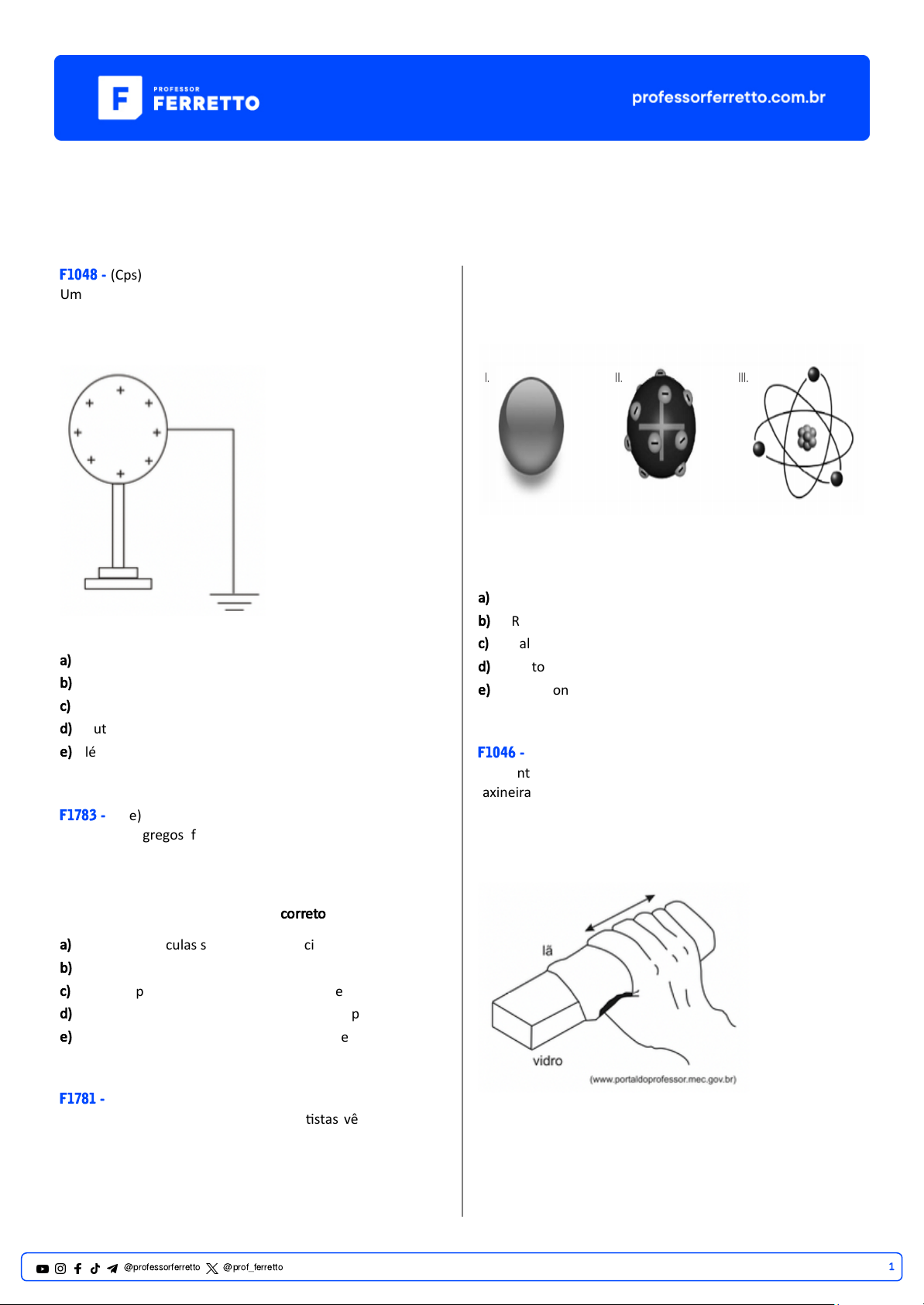 Eletrostática Processos de Eletrização F1048 - (Cps) Um condutor eletrizado posi�vamente está isolado. Ao ser ligado à Terra, por meio de um fio condutor, ele se descarrega em virtude da subida da seguinte par�cula proveniente dessa ligação. a) prótons. b) nêutrons. c) quarks. d) neutrinos. e) elétrons. F1783 - (Ifce) Os filósofos gregos foram os responsáveis pela criação do termo átomo, que significa não divisível. O átomo seria a menor parte da matéria, ou seja, não poderia ser mais dividida. Entretanto, esse conceito não é mais aceito. Diante dessa asser�va, sobre os átomos, é correto afirmar-se que a) possuem par�culas sem carga conhecidas por elétrons. b) não podem ser desintegrados. c) possuem par�culas nega�vas chamadas de nêutrons. d) apresentam o núcleo formado somente por prótons. e) apresentam duas regiões dis�ntas: núcleo e eletrosfera. F1781 - (Ufgd) Desde a Grécia an�ga, filósofos e cien�stas vêm levantando hipóteses sobre a cons�tuição da matéria. Demócrito foi uns dos primeiros filósofos a propor que a matéria era cons�tuída por par�culas muito pequenas e indivisíveis, as quais chamaram de átomos. A par�r de então, vários modelos atômicos foram formulados, à medida que novos e melhores métodos de inves�gação foram sendo desenvolvidos. A seguir, são apresentadas as representações gráficas de alguns modelos atômicos: Assinale a alterna�va que correlaciona o modelo atômico com a sua respec�va representação gráfica. a) I - Thomson, II - Dalton, III - Rutherford-Bohr. b) I - Rutherford-Bohr, II - Thomson, III - Dalton. c) I - Dalton, II - Rutherford-Bohr, III - Thomson. d) I - Dalton, II - Thomson, III - Rutherford-Bohr. e) I - Thomson, II - Rutherford-Bohr, III - Dalton. F1046 - (Ifsp) Enquanto fazia a limpeza em seu local de trabalho, uma faxineira se surpreendeu com o seguinte fenômeno: depois de limpar um objeto de vidro, esfregando-o vigorosamente com um pedaço de pano de lã, percebeu que o vidro atraiu para si pequenos pedaços de papel que estavam espalhados sobre a mesa. O mo�vo da surpresa da faxineira consiste no fato de que 1@professorferretto @prof_ferretto a) quando atritou o vidro e a lã, ela re�rou prótons do vidro tornando-o nega�vamente eletrizado, possibilitando que atraísse os pedaços de papel. b) o atrito entre o vidro e a lã aqueceu o vidro e o calor produzido foi o responsável pela atração dos pedaços de papel. c) ao esfregar a lã no vidro, a faxineira criou um campo magné�co ao redor do vidro semelhante ao existente ao redor de um ímã. d) ao esfregar a lã e o vidro, a faxineira tornou-os eletricamente neutros, impedindo que o vidro repelisse os pedaços de papel. e) o atrito entre o vidro e a lã fez um dos dois perder elétrons e o outro ganhar, eletrizando os dois, o que permi�u que o vidro atraísse os pedaços de papel. F1798 - (Ifce) Dois corpos A e B de materiais diferentes, inicialmente neutros e isolados de outros corpos, são atritados entre si. Após o atrito, observamos que a) um fica eletrizado nega�vamente e o outro, posi�vamente. b) um fica eletrizado posi�vamente e o outro con�nua neutro. c) um fica eletrizado nega�vamente e o outro con�nua neutro. d) ambos ficam eletrizados nega�vamente. e) ambos ficam eletrizados posi�vamente. F1788 - (Ufpb) Rutherford idealizou um modelo atômico com duas regiões dis�ntas. Esse modelo pode ser comparado a um estádio de futebol com a bola no centro: a proporção entre o tamanho do estádio em relação à bola é comparável ao tamanho do átomo em relação ao núcleo (figura). Acerca do modelo idealizado por Rutherford e considerando os conhecimentos sobre o átomo, é correto afirmar: a) Os prótons e os nêutrons são encontrados na eletrosfera. b) Os elétrons possuem massa muito grande em relação à massa dos prótons. c) O núcleo atômico é muito denso e possui par�culas de carga posi�va. d) A eletrosfera é uma região onde são encontradas par�culas de carga posi�va. e) O núcleo atômico é pouco denso e possui par�culas de carga nega�va. F0409 - (Ufrgs) Um aluno recebe um bastão de vidro e um pedaço de seda para realizar uma demonstração de eletrização por atrito. Após esfregar a seda no bastão, o aluno constata que a parte atritada do bastão ficou carregada posi�vamente. Nesse caso, durante o processo de atrito, cargas elétricas a) posi�vas foram transferidas da seda para o bastão. b) nega�vas foram transferidas do bastão para a seda. c) nega�vas foram repelidas para a outra extremidade do bastão. d) nega�vas foram destruídas no bastão pelo calor gerado pelo atrito. e) posi�vas foram criadas no bastão pelo calor gerado pelo atrito. F1282 - (Enem) Por qual mo�vo ocorre a eletrização ilustrada na �rinha? a) Troca de átomos entre a calça e os pelos do gato. b) Diminuição do número de prótons nos pelos do gato. c) Criação de novas par�culas eletrizadas nos pelos do gato. d) Movimentação de elétrons entre a calça e os pelos do gato. e) Repulsão entre par�culas elétricas da calça e dos pelos do gato. F0406 - (Unifor) Sabemos que eletrostá�ca é a parte da Física responsável pelo estudo das cargas elétricas em repouso. A história nos conta que grandes cien�stas como Tales de Mileto conseguiram verificar a existência das cargas elétricas. 2@professorferretto @prof_ferretto Analise as afirmações abaixo acerca do assunto. I. Um corpo é chamado neutro quando é desprovido de cargas elétricas. II. A eletrostá�ca é descrita pela conservação de cargas elétricas, a qual assegura que em um sistema isolado, a soma de todas as cargas existentes será sempre constante. III. A carga elétrica elementar é a menor quan�dade de carga encontrada na natureza IV. No processo de eletrização por atrito, a eletrização não depende da natureza do material. É CORRETO apenas o que se afirm