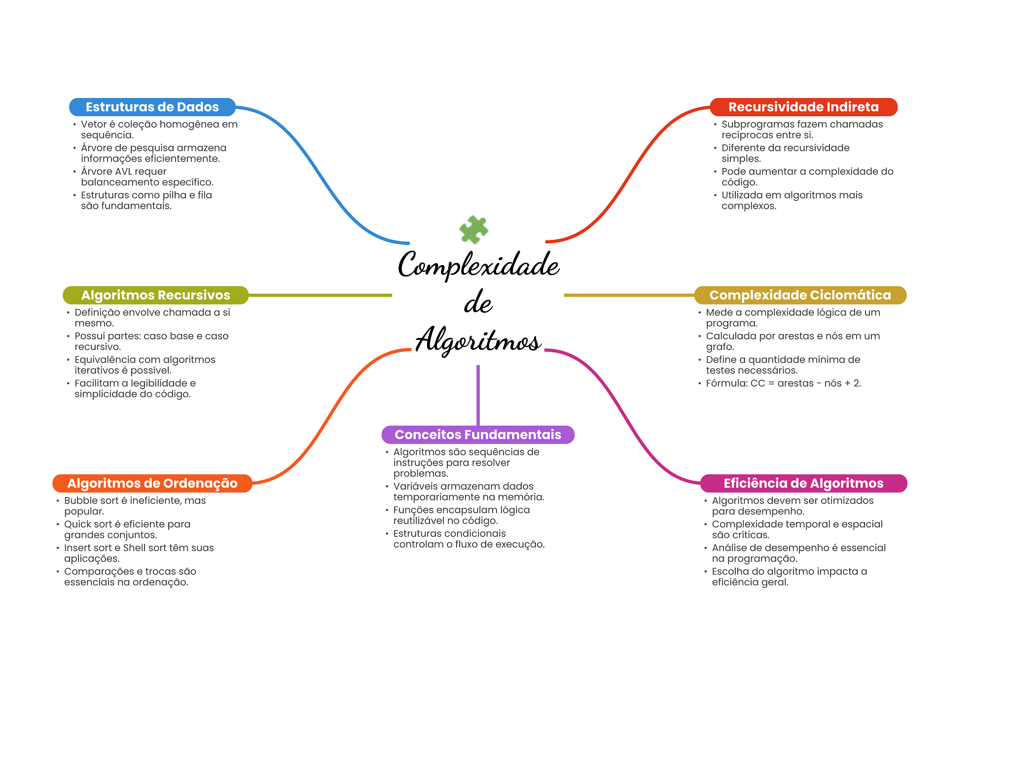 Estruturas de Dados Recursividade Indireta Vetor é coleção homogênea em Subprogramas fazem chamadas sequência. recíprocas entre si. Árvore de pesquisa armazena Diferente da recursividade informações eficientemente. simples. Árvore AVL requer Pode aumentar a complexidade do balanceamento específico. código. Estruturas como pilha e fila Utilizada em algoritmos mais são fundamentais. complexos. Complexidade Algoritmos Recursivos de Complexidade Ciclomática Definição envolve chamada a si Mede a complexidade lógica de um mesmo. programa. Possui partes: caso base e caso Algoritmos Calculada por arestas e nós em um recursivo. grafo. Equivalência com algoritmos Define a quantidade mínima de iterativos é possível. testes necessários. Facilitam a legibilidade e Fórmula: CC = arestas nós + 2. simplicidade do código. Conceitos Fundamentais Algoritmos são sequências de instruções para resolver problemas. Algoritmos de Ordenação Variáveis armazenam dados Eficiência de Algoritmos Bubble sort é ineficiente, mas temporariamente na memória. Algoritmos devem ser otimizados popular. Funções encapsulam lógica para desempenho. Quick sort é eficiente para reutilizável no código. Complexidade temporal e espacial grandes conjuntos. Estruturas condicionais são críticas. Insert sort e Shell sort têm suas controlam O fluxo de execução. Análise de desempenho é essencial aplicações. na programação. Comparações e trocas são Escolha do algoritmo impacta a essenciais na ordenação. eficiência geral.