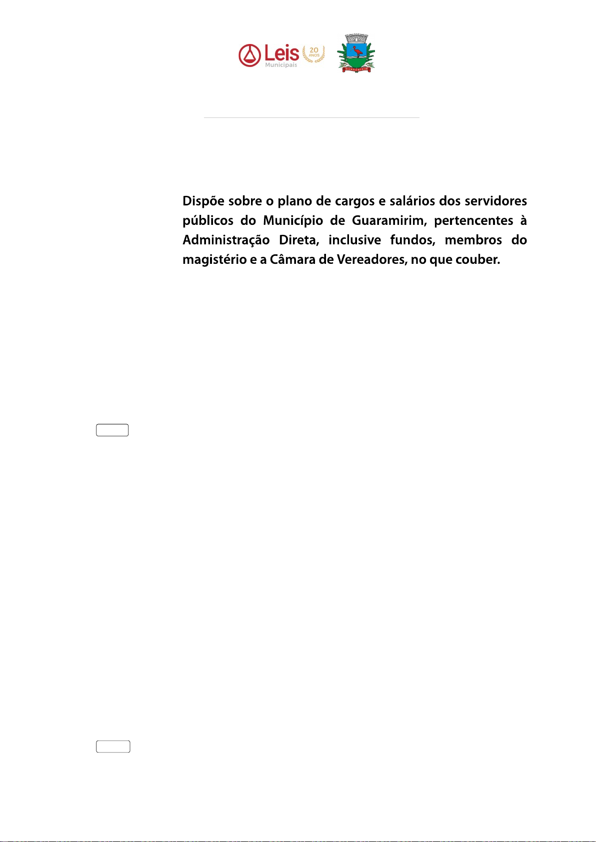 www.LeisMunicipais.com.br Versão consolidada, com alterações até o dia 14/11/2025 LEI COMPLEMENTAR Nº 190/2022 O Prefeito de Guaramirim, no uso de suas atribuições, faz saber a todos os habitantes deste Município, que a Câmara Municipal de Vereadores aprovou e ele sanciona a seguinte Lei: CAPÍTULO I DAS DISPOSIÇÕES PRELIMINARES Art. 1º Esta lei dispõe sobre o Plano de Cargos e Salários dos servidores públicos do Município de Guaramirim, pertencentes à Administração Direta, inclusive fundos, membros do magistério e a Câmara de Vereadores, no que couber, no que se refere aos cargos de provimento efe vo, classificados na forma desta Lei. Parágrafo único. É parte integrante desta lei, os seguintes anexos: I - Anexo I: quadro permanente dos cargos, subdivididos pelos grupos dispostos nos incisos I, II, III e IV do art. 2º, contendo ainda a carga horária semanal, vagas totais e vencimento base; II - Anexo II: quadro dos cargos isolados; III - Anexo III: atribuições dos cargos. CAPÍTULO II DA ESTRUTURA BÁSICA DO PLANO DE CARREIRA Art. 2º Os cargos do Quadro de Pessoal da Administração do Município de Guaramirim estão classificados nos seguintes grupos: Lei Complementar 190 2022 de Guaramirim SC https://leismunicipais.com.br/a/sc/g/guaramirim/lei-complementar/20... 1 of 172 27/11/2025, 15:53 I - A vidades de nível superior - ANS; II - A vidades operacionais e de administração geral - OAG; III - Magistério - MAG; IV - Transportes e serviços auxiliares - TSA; V - Cargos isolados - CIS. Art. 3º Os cargos que compõe os grupos presentes no art. 2º, distribuem-se pelas categorias funcionais com as respec vas habilitações profissionais e salários especificados nos Anexos I ao III, partes integrantes desta Lei. Parágrafo único. Os funcionários classificados nos grupos descritos neste ar go serão doravante denominados de funcionários de provimento efe vo. Art. 4º Cada grupo abrangendo várias a vidades, compreende: I - A vidades de Nível Superior - ANS: os cargos a que sejam inerentes às a vidades compreendidas nas áreas de ciências e tecnologia humanas e sociais indispensáveis ao pleno funcionamento dos órgãos que integram a estrutura organizacional do Município, para cujo desempenho é exigido diploma ou cer ficado de conclusão de curso superior; II - A vidades Operacionais e de Administração Geral - OAG: Os cargos inerentes às a vidades técnico-profissionais compreendidas nos campos da tecnologia, administração e serviços diversos, para cujo desempenho é exigido diploma ou cer ficado de conclusão de ensino fundamental ou ensino médio; III - A vidades de Magistério - MAG: como a vidades de magistério, entende-se o conjunto de servidores que ocupam cargos de docente e especialistas em educação e esportes, nas unidades escolares, ou vinculadas a estas, e demais órgãos relacionados a Educação e Esportes, com a habilitação exigida na forma da Lei; IV - A vidades de Transportes e Serviços Auxiliares - TSA: os cargos inerentes às a vidades operacionais, conservação de instalações, estradas e bens, manutenção, limpeza e transporte, atendimentos, para cujo desempenho é exigido cer ficado de conclusão de 4ª série do 1º grau (ensino fundamental I) e /ou experiência comprovada na área de atuação. V - Cargos Isolados - CIS: Cargos que serão ex ntos no momento em que vagarem. CAPÍTULO III Lei Complementar 190 2022 de Guaramirim SC https://leismunicipais.com.br/a/sc/g/guaramirim/lei-complementar/20... 2 of 172 27/11/2025, 15:53 DOS CONCEITOS Art. 5º Para efeito da aplicação desta Lei, considera-se: I - Cargo: Nome dado à a vidade a ser desempenhada no exercício do Serviço Público Municipal; II - Cargo de Provimento Efe vo: Exercício de função em cargo definido nesta Lei, admi do mediante concurso público; III - Cargos Isolados: Cargos em ex nção, que não fazem parte do Plano de Carreira e Remuneração dos Servidores Públicos Municipais; IV - Categoria Funcional: Conjunto de a vidades desdobráveis, iden ficadas pela natureza e pelo grau de conhecimento exigível para o seu desempenho; V - Enquadramento: Atribuições de novo cargo, grupo, nível e referência ao servidor, levando-se em consideração o cargo ocupado anteriormente a entrada em vigor da presente Lei; VI - Função: Conjunto de atribuições, deveres e responsabilidades come das ao profissional no exercício de suas funções, previstas no plano de carreira e remuneração, de acordo com a área de atuação e formação profissional; VII - Grupo: É o conjunto de categorias funcionais segundo a correlação e afinidade entre as a vidades de cada um, a natureza do trabalho ou o grau de conhecimento necessário ao exercício das respec vas atribuições; VIII - Quadro de Pessoal: Conjunto de cargos de provimento efe vo e comissionado do serviço público municipal; IX - Regime Jurídico: Conjunto de normas que disciplinam o vínculo emprega cio do servidor junto ao Serviço Público Municipal; X - Vencimento: Salário base para a retribuição pecuniária pelo exercício do cargo público, com valor fixado em Lei; XI - Remuneração: Vencimento do cargo de carreira, acrescido de vantagens pecuniárias, permanentes ou temporárias, estabelecido em Lei; XII - Vaga: Número máximo de servidores a ser admi do em determinado cargo; XIII - Níveis Salariais: Graduação ver cal ascendente, existente na Categoria Funcional; Lei Complementar 190 2022 de Guaramirim SC https://leismunicipais.com.br/a/sc/g/guaramirim/lei-complementar/20... 3 of 172 27/11/2025, 15:53 XIV - Progresso Funcional: Deslocamento do servidor nos níveis e referências con das no seu cargo. Art. 6º Cada categoria funcional tem fixado sua escala de níveis de salários segundo critério de importância de a vidade, complexidade e qualificação exigidos para o desempenho das atribuições. CAPÍTULO IV DO ENQUADRAMENTO E RECLASSIFICAÇÃO Art. 7º Os tulares de cargos de pr