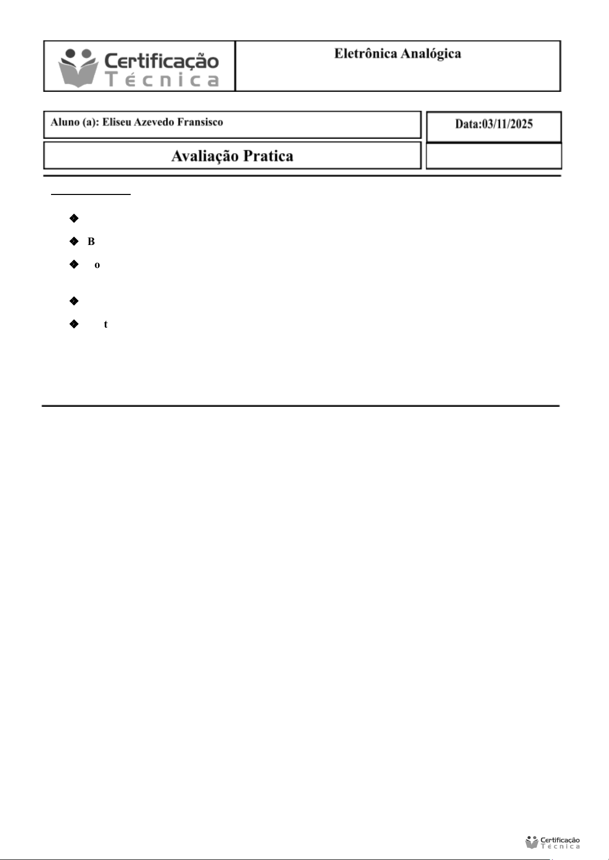 INSTRUÇÕES: ❖ Esta Avaliação contém 2 (duas) questões, totalizando 10 (dez) pontos; ❖ Baixe o arquivo disponível com a Atividade Pratica; ❖ Você deve preencher dos dados no Cabeçalho para sua identificação: o Nome / Data de entrega. ❖ As respostas devem ser digitadas abaixo de cada pergunta; ❖ Ao terminar grave o arquivo com o nome Atividade Prática; o Quando solicitado Questão 1 – Você trabalha no setor de Manutenção de uma empresa, para onde foi enviado um equipamento cuja placa principal de circuito não está funcionando. A placa tem um microprocessador, que é o CI responsável pelo controle do circuito. Concluiu-se que o circuito de sincronismo (clock) não está fornecendo o sinal de 1MHz necessário para o funcionamento correto do microprocessador. O circuito de sincronismo utiliza um CI LM555 com dois resistores de 200Ω cada. O capacitor conectado entre o pino 6 e o terminal de terra do CI está carbonizado. O que deve ser feito para consertar essa placa? Resposta:Para consertar a placa, a primeira ação é a remoção do capacitor carbonizado. C=1.44/((200+(2*200)*10^6) C=1.44/(600*10^6) C=1.44/600000000 C=0.0000000024F O cálculo resulta em 2.4 nF. A etapa final é soldar o novo capacitor de 2.4 nF na placa e testar o circuito com um osciloscópio para confirmar o sinal de 1 MHz. Questão 2 - Os osciladores senoidais duplo-T utilizam arranjos com resistores e capacitores de forma em que atuam como um filtro que rejeita faixa. Determine o valor de R para um oscilador senoidal duplo-T cujo sinal de saída tenha frequência de 1kHz, utilizando um capacitor de 100nF. Considere todos os resistores do circuito como fixos. Resposta: R=1/(2πx10^3x10^7) R=1/(2πx10-4) R=1/0.0006283 O valor de resistência R necessário para o circuito operar a 1 kHz, utilizando capacitores de 100nF, é de aproximadamente 1591.55 ohms(1,591kΩ).