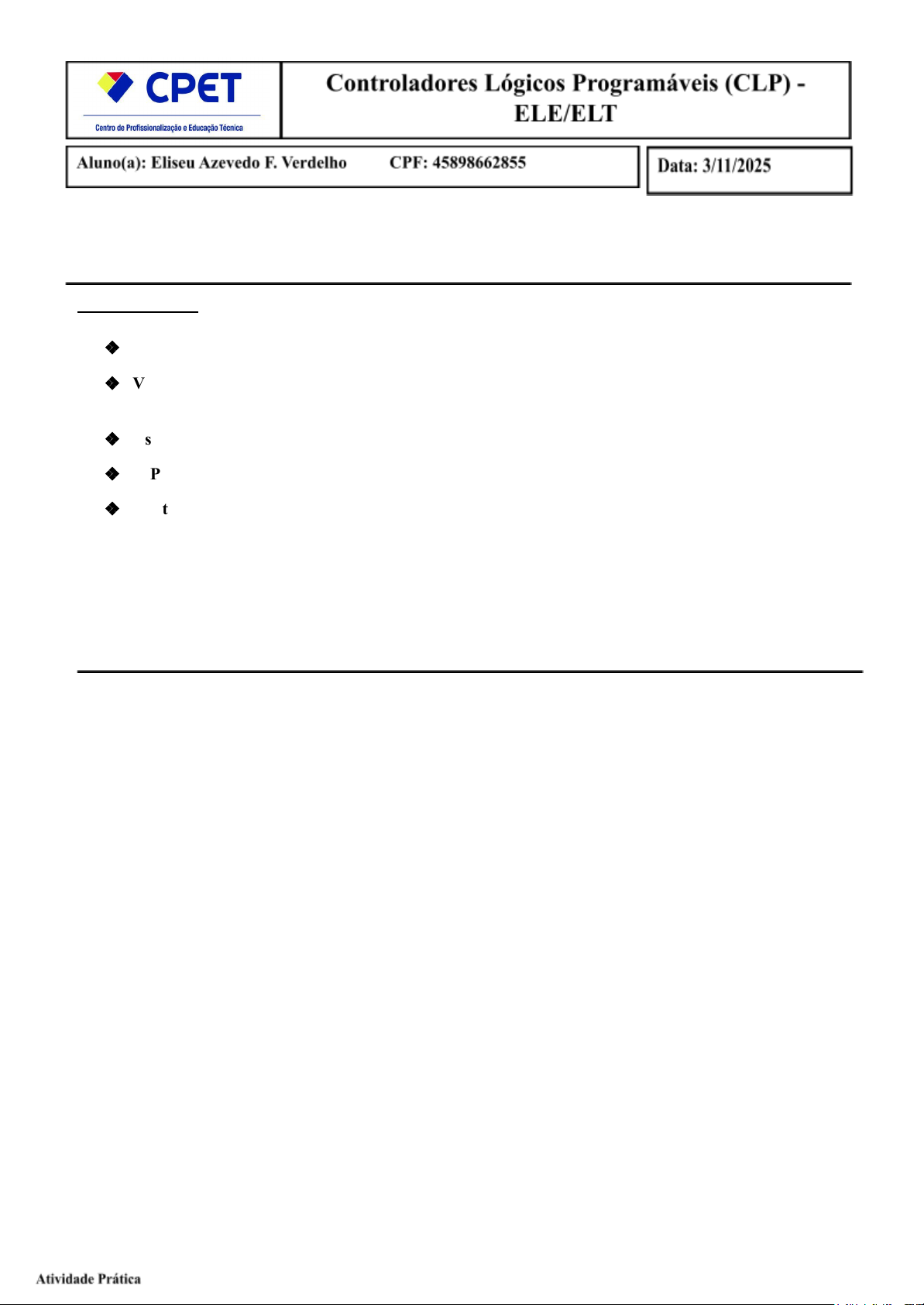 Atividade Prática I - 2024 INSTRUÇÕES: ❖ Esta Atividade contém questões totalizando 10 (dez) pontos; ❖ Você deve preencher dos dados no Cabeçalho para sua identificação: o Nome /CPF/Data ❖ As respostas devem ser digitadas abaixo de cada pergunta; ❖ O Programa deve ser realizado obrigatoriamente no CADSIMU; ❖ Ao terminar salve o arquivo no formato .PDF, DOCX ou no formato do próprio software 1. Faça uma simulação no software CadeSimu mostrando uma partida estrela-triângulo com reversão utilizando o CLP LOGO. OBS.: tenha o cuidado de, além de mostrar a lógica de contatos que o CLP irá utilizar, desenhar também o diagrama de força (o que mostra o motor funcionando). OBS.: Explique quais os botões fazem a reversão na hora da partida. Resposta botao sentido anti horário e botão s2 horário