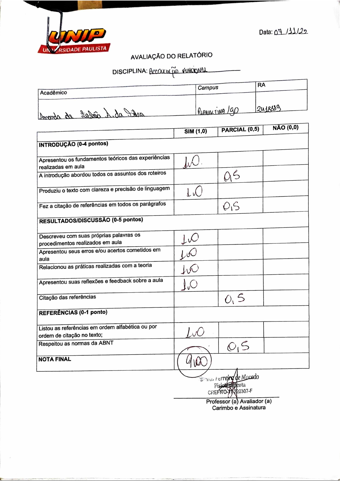 UN UNIP RSIDADE PAULISTA Data: 07/11/25 AVALIAÇÃO DO RELATÓRIO DISCIPLINA: FUNCIONAL Campus RA Acadêmico Amanda de A.da SIM (1,0) PARCIAL (0,5) NÃO (0,0) INTRODUÇÃO (0-4 pontos) Apresentou os fundamentos teóricos das experiências realizadas em aula A introdução abordou todos os assuntos dos roteiros as Produziu o texto com clareza e precisão de linguagem 10 Fez a citação de referências em todos os parágrafos RESULTADOS/DISCUSSÃO (0-5 pontos) Descreveu com suas próprias palavras os procedimentos realizados em aula 100 Apresentou seus erros e/ou acertos cometidos em aula 100 Relacionou as práticas realizadas com a teoria no Apresentou suas reflexões e feedback sobre a aula 100 Citação das referências REFERÊNCIAS (0-1 ponto) Listou as referências em ordem alfabética ou por ordem de citação no texto; Respeitou as normas da ABNT NOTA FINAL de CREFITO 1220307-F Professor (a) Avaliador (a) Carimbo e AssinaturaUNIVERSIDADE PAULISTA Macedo RELATÓRIO REEDUCAÇÃO FUNCIONAL CURSO: Fisioterapia DISCIPLINA: Reeducação funcional NOME DO ALUNO: Amanda de Lisbôa Alves da Silva R.A: 2318889 POLO: Planaltina-GO DATA: 21/11/20251 A Introdução Reeducação Funcional e Postural constitui uma especializada da Fisioterapia, integrando profundamente conhecimentos de neurofisiologia e biomecânica para estabelecer as estratégias motoras mais eficazes no tratamento individualizado dos pacientes. O cerne desta abordagem é o restabelecimento da função. indo além da simples mitigação da dor. Através de uma avaliação precisa, que pode envolver "técnicas de filmagem dos o objetivo é "capacitar o a se movimentar com qualidade e sem dor". Esta intervenção garante que, mesmo diante de disfunções e lesões musculoesqueléticas, os "beneficios de tratamento se mantenham em longo prazo", promovendo a reintegração plena do paciente (Clínica Motricitá). sucesso da Reeducação Funcional reside na aplicação estratégica do exercício terapêutico, que é o seu recurso central para restaurar o sistema musculoesquelético. O foco é continuamente em "avaliar e identificar as disfunções" para que o profissional pos sa traçar um programa de terapia que abranja as diversas áreas da vida do paciente, desde as atividades básicas até as esportivas. Essa intervenção é multifacetada, utilizando o treino de marcha, "técnicas de transferência e mudanças de e resultando em "melhora do ganho sensório-motor, alivia os sintomas e contribui para a ativação dos cofres do paciente". sendo um aliado vital na recuperação de diversos traumas (Relatório de Reeducação Funcional). Para atingir a reestruturação da função e a recuperação da eficiência motora, a Reeducação Funcional incorpora metodologias específicas e cientificamente embasadas. O Método Pilates contribui com o fortalecimento do "powerhouse" e a estabilidade central; a Série de Williams foca na flexão e estabilização da região tóraco-lombar; enquanto o Método McKenzie é um sistema de diagnóstico e tratamento da coluna que busca a centralização da dor por meio de movimentos repetidos. Adicionalmente, o Método Klapp utiliza posturas em quatro apoios para correção de desvios da coluna, e o Método Feldenkrais promove a "conscientização pelo movimento", ensinando o sistema nervoso a reorganizar os padrões motores. Assim, o tratamento eficaz se baseia na "avaliação minuciosa e individualizada de cada paciente, onde identificará as intervenções e a combinação precisa desses métodos (Relatório de Reeducação Funcional; Williams, mackenzie, klapp e feldenkrais).2 Aula Treino de marcha Roteiro Pré-deambulação e exercícios preparatórios A importância do período de pré-deambulação é fundamental para garantir segurança e eficiência no processo de reeducação da marcha (SILVA, 2020). * Objetivo da pré-deambulação * Preparar o paciente para a caminhada de forma segura e eficiente. Segundo Kisner, Colby e Borstad (2020), treinamento terapêutico deve preparar o indivíduo para atividades funcionais de forma progressiva e segura, respeitando seus limites e * Promover o desenvolvimento de habilidades essenciais como fortalecimento muscular, coordenação motora e controle postural. Assim, essas habilidades são a base para a evolução motora do paciente durante o processo de reabilitação (O'SULLIVAN; SCHMITZ; FULK, 2019). * Técnicas preparatórias (como fazer) Manutenção de Posições: Prática de manter o corpo em posições estáveis, como quatro apoios, para fortalecer o tronco e os membros. (TEIXEIRA-SALMELA et al., 2001). * Engatinhar: Movimento coordenado dos membros superiores e inferiores, simulando a dissociação de cinturas e ativando a musculatura para o equilíbrio. Portanto, o engatinhar estimula a coordenação motora e o controle de tronco (UMPHRED; LAZAR; BURKE-DAVIS, 2021).3 Apoio em Suportes e Levantar: Treino de transição de postura (sentado para em pé) da utilizando * apoios firmes, focando na distribuição de peso e no controle postural antes descarga total. (SHUMWAY-COOK; WOOLLACOTT, 2017). Ciclo de marcha humana A marcha humana é composta por fases cíclicas que exigem coordenação e sincronização (BARBOSA, 2018), dividida em Fase de Apoio e Fase de Balanço. fase de apoio (pé no solo) (NEUMANN, 2017). * Contato Inicial: Inicia-se com o toque do calcanhar no solo. * Resposta à Carga: Pé totalmente apoiado, suportando o peso do corpo. (PERRY; BURNFIELD, 2010). * Deslocamento Anterior da Tíbia: A tíbia avança sobre o pé plantado. Whittle (2021) explica que "O avanço da tíbia sobre o pé fixo é essencial para o deslocamento progressivo e requer flexibilidade do tornozelo e estabilidade muscular" (WHITTLE, 2021). * Apoio Terminal: Elevação do calcanhar do solo. (HALL, 2021). * Pré-Balanço: Propulsão (saída dos dedos do pé do solo), impulsionando o corpo para a frente. (OATIS, 2017). * fase de balanço (pé elevado) * Balanço
