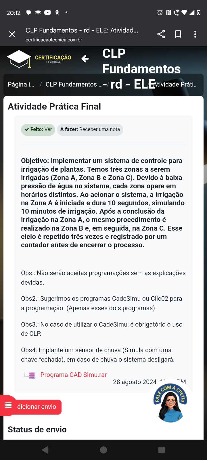 20:12 0 CLP Fundamentos rd ELE: Atividad... X certificacaotecnica.com.br CERTIFICAÇÃO CLP TECNICA Fundamentos Página i... / CLP Fundamentos ...-/ rd - ELE Atividade Práti... Atividade Prática Final Feito: Ver A fazer: Receber uma nota Objetivo: Implementar um sistema de controle para irrigação de plantas. Temos três zonas a serem irrigadas (Zona A, Zona B e Zona C). Devido à baixa pressão de água no sistema, cada zona opera em horários distintos. Ao acionar sistema, a irrigação na Zona A é iniciada e dura 10 segundos, simulando 10 minutos de irrigação. Após a conclusão da irrigação na Zona A, mesmo procedimento é realizado na Zona e, em seguida, na Zona C. Esse ciclo é repetido três vezes e registrado por um contador antes de encerrar o processo. Obs.: Não serão aceitas programações sem as explicações devidas. Obs2.: Sugerimos os programas CadeSimu ou Clic02 para a programação. (Apenas esses dois programas) Obs3.: No caso de utilizar CadeSimu, é obrigatório uso de CLP. Obs4: Implante um sensor de chuva (Simula com uma chave fechada), em caso de chuva sistema desligará. Programa CAD Simu.rar 28 agosto 2024 M FALE COM A dicionar envio Status de envio