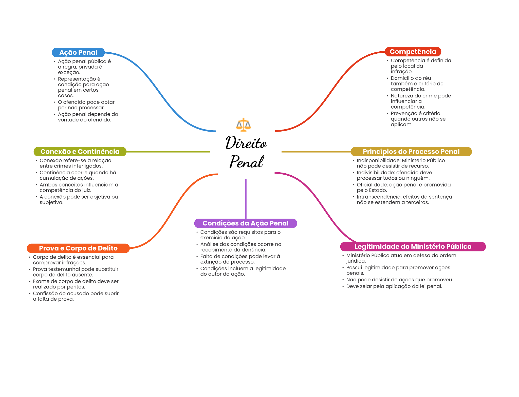 Ação Penal Competência Ação penal pública é Competência é definida a regra, privada é pelo local da exceção. infração. Representação é Domicílio do réu condição para ação também é critério de penal em certos competência. casos. Natureza do crime pode ofendido pode optar influenciar a por não processar. competência. Ação penal depende da Prevenção é critério vontade do ofendido. quando outros não se aplicam. Direito Conexão e Continência Princípios do Processo Penal Conexão refere-se à relação Penal Indisponibilidade: Ministério Público entre crimes interligados. não pode desistir de recurso. Continência ocorre quando há Indivisibilidade: ofendido deve cumulação de ações. processar todos ou ninguém. Ambos conceitos influenciam a Oficialidade: ação penal é promovida competência do juiz. pelo Estado. A conexão pode ser objetiva ou Intranscendência: efeitos da sentença subjetiva. não se estendem a terceiros. Condições da Ação Penal Condições são requisitos para O exercício da ação. Análise das condições ocorre no Prova e Corpo de Delito recebimento da denúncia. Legitimidade do Ministério Público Corpo de delito é essencial para Falta de condições pode levar à Ministério Público atua em defesa da ordem comprovar infrações. extinção do processo. jurídica. Prova testemunhal pode substituir Condições incluem a legitimidade Possui legitimidade para promover ações corpo de delito ausente. do autor da ação. penais. Exame de corpo de delito deve ser Não pode desistir de ações que promoveu. realizado por peritos. Deve zelar pela aplicação da lei penal. Confissão do acusado pode suprir a falta de prova.