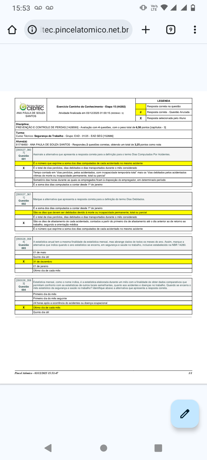 15:53 LTE + 9 LEGENDA ESCOLA TÉCNICA CEDTEC Exercicio Caminho do Conhecimento Etapa 15 (44202) Resposta correta na questão ANA PAULA DE SOUZA Atividade finalizada em 03/12/2025 01:00:15 (5555842 # Resposta correta Questão Anulada SANTOS X Resposta selecionada pelo Aluno Disciplina: PREVENÇÃO E CONTROLE DE PERDAS Avaliação com 4 com 0 peso total de 6,50 pontos Turma: Curso Segurança do Trabalho Grupo: EAD 01/25 EAD SEG [152686] Aluno(a): 91716450 ANA PAULA DE SOUZA SANTOS Respondeu 2 questões corretas, obtendo um total de 3,25 pontos como nota 350027_360 7) Questão Assinale a alternativa que apresenta a resposta correta para a definição para termo Dias Computados Por 001 E 0 número que exprime a soma dos dias computados de cada acidentado no mesmo acidente E total de dias perdidos, dias debitados e dias transportados durante mês considerado Tempo contado em "dias pelos com incapacidade temporaria total" mais os "dias debitados pelos acidentados vitimas de morte ou incapacidade total ou Somatorio das horas durante as quais os empregados ficam à disposição do em determinado a soma dos dias computados a contar desde 10 de janeiro 350027_361 1] Questão Marque a alternativa que apresenta a resposta correta para a definição do termo Dias 002 E a soma dos dias computados a contar desde de janeiro São os dias que devem ser debitados devido à morte ou incapacidade total ou parcial total de dias perdidos, dias debitados e dias transportados durante mês considerado São os dias de afastamento de cada contados a partir do primeiro dia de afastamento até dia anterior ao de retorno ao segundo a orientação médica E número que exprime a soma dos dias computados de cada acidentado no mesmo acidente 350028_358 4] A estatistica anual tem a mesma finalidade da estatistica mas abrange dados de todos os meses do ano. Assim, marque a Questão alternativa que indica quando ano estatistico se em segurança e saúde no inclusive estabelecido na NBR 14280. 003 01 de maio Quinto dia útil 31 de dezembro 01 de janeiro Ultimo dia de cada mês 350028_358 Estatistica mensal, como 0 nome indica, é a estatistica elaborada durante um mês com a finalidade de obter dados comparativos que 3] Questão permitam confronto com as de outros locais quanto aos acidentes e doenças no trabalho. Quando se encerra mês estatistico da segurança e saúde no trabalho? Identifique abaixo a alternativa que apresenta a resposta correta. 004 Primeiro dia do mês Primeiro dia do mês seguinte 24 horas após a ocorrência do acidentes ou doença ocupacional Ultimo dia de cada mês Quinto dia Pincel Atômico 03/12/2025 15:53:47 1/1