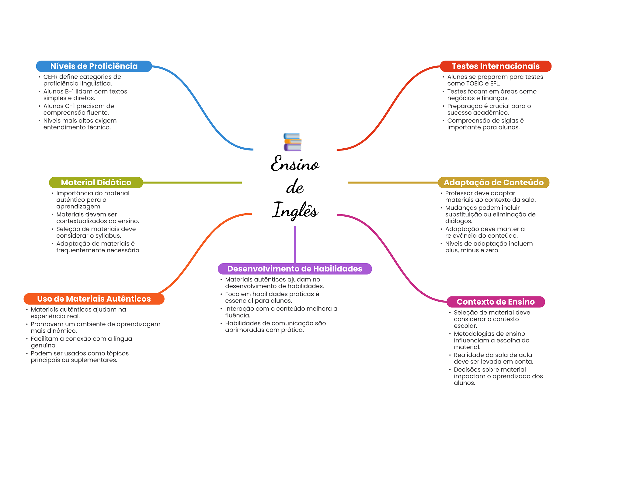 Níveis de Proficiência Testes Internacionais CEFR define categorias de Alunos se preparam para testes proficiência linguística. como TOEIC e EFL. Alunos B-1 lidam com textos Testes focam em áreas como simples e diretos. negócios e finanças. Alunos C-1 precisam de Preparação é crucial para O compreensão fluente. sucesso acadêmico. Níveis mais altos exigem Compreensão de siglas é entendimento técnico. importante para alunos. Ensino Material Didático de Adaptação de Conteúdo Importância do material Professor deve adaptar autêntico para a materiais ao contexto da sala. aprendizagem. Inglês Mudanças podem incluir Materiais devem ser substituição ou eliminação de contextualizados ao ensino. diálogos. Seleção de materiais deve Adaptação deve manter a considerar O syllabus. relevância do conteúdo. Adaptação de materiais é Níveis de adaptação incluem frequentemente necessária. plus, minus e zero. Desenvolvimento de Habilidades Materiais autênticos ajudam no desenvolvimento de habilidades. Foco em habilidades práticas é Uso de Materiais Autênticos essencial para alunos. Contexto de Ensino Materiais autênticos ajudam na Interação com O conteúdo melhora a experiência real. fluência. Seleção de material deve considerar contexto Promovem um ambiente de aprendizagem Habilidades de comunicação são escolar. mais dinâmico. aprimoradas com prática. Metodologias de ensino Facilitam a conexão com a língua influenciam a escolha do genuína. material. Podem ser usados como tópicos Realidade da sala de aula principais ou suplementares. deve ser levada em conta. Decisões sobre material impactam O aprendizado dos alunos.
