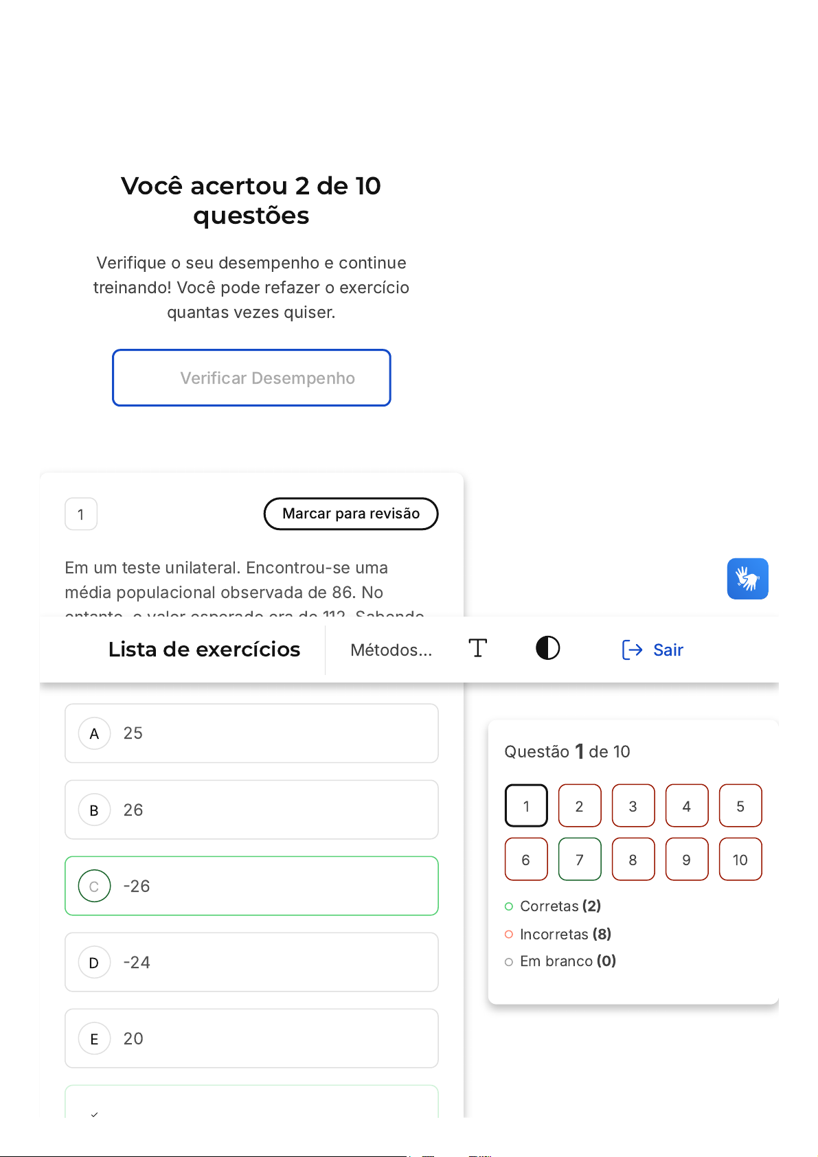 09/06/2025 10:00 https://estacio.saladeavaliacoes.com.br/exercicio/6846daaef464610f1c3cfdf1/gabarito/ https://estacio.saladeavaliacoes.com.br/exercicio/6846daaef464610f1c3cfdf1/gabarito/ 1/15 Você acertou 2 de 10 questões Verifique o seu desempenho e continue treinando! Você pode refazer o exercício quantas vezes quiser. Verificar Desempenho A B C D E 1 Marcar para revisão Em um teste unilateral. Encontrou-se uma média populacional observada de 86. No entanto, o valor esperado era de 112. Sabendo que o desvio padrão é de ± 15, e que foram observados 224 dados, o valor Z é igual a: 25 26 �26 �24 20 Questão 1 de 10 Corretas �2� Incorretas �8� Em branco �0� 1 2 3 4 5 6 7 8 9 10 Lista de exercícios Métodos… Sair 09/06/2025 10:00 https://estacio.saladeavaliacoes.com.br/exercicio/6846daaef464610f1c3cfdf1/gabarito/ https://estacio.saladeavaliacoes.com.br/exercicio/6846daaef464610f1c3cfdf1/gabarito/ 2/15 Resposta correta Parabéns, você selecionou a alternativa correta. Confira o gabarito comentado! Gabarito Comentado 2 Marcar para revisão Uma determinada indústria de máscaras cirúrgicas tem um valor médio de tamanho de máscara fabricado. Todavia, é tolerado na produção uma diferença de tamanho de 34,13% para mais e para menos. Considerando uma curva normal, de quantos desvios padrões a empresa está falando que tolera? 09/06/2025 10:00 https://estacio.saladeavaliacoes.com.br/exercicio/6846daaef464610f1c3cfdf1/gabarito/ https://estacio.saladeavaliacoes.com.br/exercicio/6846daaef464610f1c3cfdf1/gabarito/ 3/15 A B C D E 1 1,5 2 2,5 3 Resposta incorreta Opa! A alternativa correta é a letra A. Confira o gabarito comentado! Gabarito Comentado Na distribuição normal, também conhecida como curva de Gauss, o desvio padrão é uma medida que indica o quanto os dados estão dispersos em relação à média. No caso apresentado, a indústria tolera uma variação de 34,13% para mais ou para menos no tamanho das máscaras produzidas. Ao analisarmos a curva normal, percebemos que essa variação corresponde a 1 desvio padrão para a direita ou para a esquerda da média. Portanto, a empresa tolera uma variação de 1 desvio padrão no tamanho das máscaras. 3 Marcar para revisão 09/06/2025 10:00 https://estacio.saladeavaliacoes.com.br/exercicio/6846daaef464610f1c3cfdf1/gabarito/ https://estacio.saladeavaliacoes.com.br/exercicio/6846daaef464610f1c3cfdf1/gabarito/ 4/15 A B C D E Ao organizar dados experimentais, é comum representá-los graficamente por histogramas. Porém, para estimar probabilidades com maior precisão, é necessário um modelo teórico. Com base nos conceitos de distribuição normal e na representação gráfica dos dados, assinale a alternativa que identifica corretamente o recurso utilizado para determinar a probabilidade de ocorrência de um valor. A probabilidade de ocorrência é identificada diretamente a partir do eixo vertical do histograma. O histograma fornece a função densidade usada para cálculo da probabilidade exata de um valor. A área sob as barras do histograma indica a distribuição acumulada dos dados observados. A distribuição de Gauss, usada para calcular probabilidades, é obtida da frequência acumulada dos dados. A determinação da probabilidade é feita com base em uma curva gaussiana, chamada distribuição normal. Resposta incorreta Opa! A alternativa correta é a letra E. Confira o gabarito comentado! Gabarito Comentado 09/06/2025 10:00 https://estacio.saladeavaliacoes.com.br/exercicio/6846daaef464610f1c3cfdf1/gabarito/ https://estacio.saladeavaliacoes.com.br/exercicio/6846daaef464610f1c3cfdf1/gabarito/ 5/15 Embora o histograma represente visualmente os dados coletados, ele não permite o cálculo exato da probabilidade de ocorrência de um valor ou intervalo. Para isso, utiliza-se a função densidade da distribuição normal, também conhecida como curva gaussiana, que é um modelo matemático contínuo e simétrico. Essa curva permite determinar probabilidades pela área sob a curva, associada a intervalos definidos por desvios-padrão. 4 Marcar para revisão Ao inferir uma hipótese, temos que testá-la para saber se, podemos rejeitá-la ou não. Isso ocorre, porque em estatística, a pergunta feita não é: qual a chance da minha hipótese ser aceita? Mas sim: qual a chance da minha hipótese ser rejeitada? Diante ao exposto, marque a alternativa que apresenta a condição para rejeitar uma hipótese pelo teste χ2 09/06/2025 10:00 https://estacio.saladeavaliacoes.com.br/exercicio/6846daaef464610f1c3cfdf1/gabarito/ https://estacio.saladeavaliacoes.com.br/exercicio/6846daaef464610f1c3cfdf1/gabarito/ 6/15 A B C χ2 χ2�valor p χ2≤valor p 09/06/2025 10:00 https://estacio.saladeavaliacoes.com.br/exercicio/6846daaef464610f1c3cfdf1/gabarito/ https://estacio.saladeavaliacoes.com.br/exercicio/6846daaef464610f1c3cfdf1/gabarito/ 7/15 D E A B χ2≥valor p χ2≠valor p Resposta incorreta Opa! A alternativa correta é a letra A. Confira o gabarito comentado! Gabarito Comentado Após calcular o χ2, devemos compará-lo com o valor p. Se χ2, rejeitamos a hipótese H0. 5 Marcar para revisão Durante o estudo de estatística, técnicas consideradas recentes surgiram. Algumas dessas técnicas buscam inferir hipóteses, sobre a natureza populacional dos dados e estabelecem uma relação entre as variáveis, e, por isso, elas são chamadas de testes paramétricos. Todavia, existem testes que não especificam condições sobre os parâmetros da população de dados, os chamados testes não paramétricos. Para utilizar o teste deve-se: comparar um grupo de dados observado com um grupo de dados esperado. comparar a covariância das variáveis, com a variância de cada uma delas separadamente. 09/06/2025 10:00 https://estacio.saladeavaliacoes.com.br/exercicio/6846daaef464610f1c3cfdf1/gabarito/ https://estacio.saladeavaliacoes.com.br/exercicio/6846daaef464610f1c3cfdf1/gabarito/ 8/15 C D E comparar a média dos dados obse