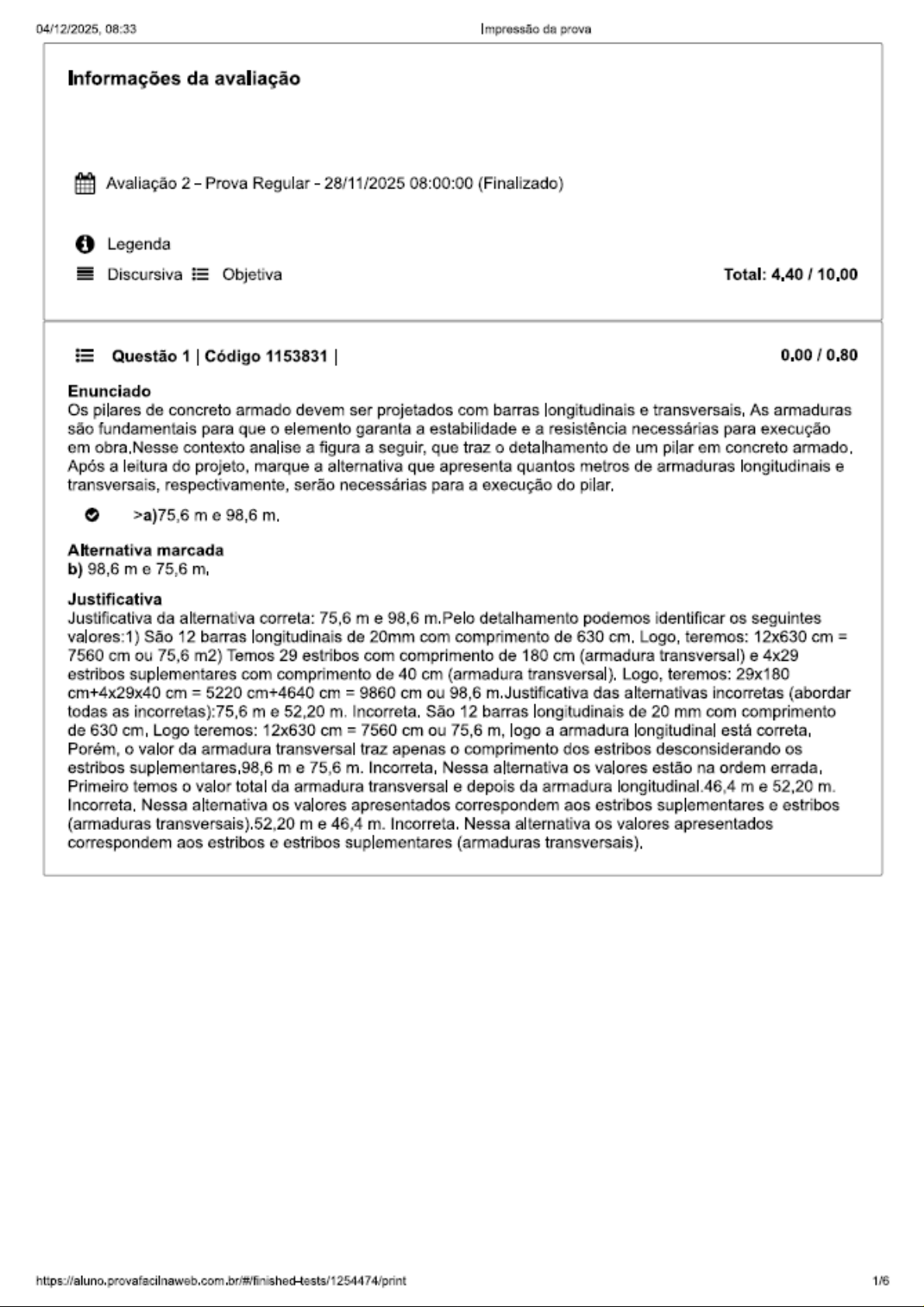 04/12/2025, 08:33 Impressão da prova Informações da avaliação Avaliação 2 Prova Regular 28/11/2025 08:00:00 (Finalizado) Legenda Discursiva Objetiva Total: 4,40 10,00 Questão 1 Código 1153831 0,00 / 0,80 Enunciado Os pilares de concreto armado devem ser projetados com barras longitudinais e transversais, As armaduras são fundamentais para que o elemento garanta a estabilidade e a resistência necessárias para execução em obra,Nesse contexto analise a figura a seguir, que traz o detalhamento de um pilar em concreto armado, Após a leitura do projeto, marque a alternativa que apresenta quantos metros de armaduras longitudinais e transversais, respectivamente, serão necessárias para a execução do pilar. >a)75,6 m e 98,6 m. Alternativa marcada b) 98,6 m e 75,6 m, Justificativa Justificativa da alternativa correta: 75,6 m e 98,6 m.Pelo detalhamento podemos identificar os seguintes valores:1) São 12 barras longitudinais de 20mm com comprimento de 630 Logo, teremos: 12x630 cm = 7560 cm ou 75,6 m2) Temos 29 estribos com comprimento de 180 cm (armadura transversal) e 4x29 estribos suplementares com comprimento de 40 cm (armadura transversal). Logo, teremos: 29x180 cm+4x29x40 cm = 5220 cm+4640 cm = 9860 cm ou 98,6 m.Justificativa das alternativas incorretas (abordar todas as incorretas):75,6 m e 52,20 m. Incorreta, São 12 barras longitudinais de 20 mm com comprimento de 630 cm, Logo teremos: 12x630 cm = 7560 cm ou 75,6 m, logo a armadura está correta, Porém, o valor da armadura transversal traz apenas o comprimento dos estribos desconsiderando os estribos suplementares,98,6 m e 75,6 m. Incorreta, Nessa alternativa os valores estão na ordem errada, Primeiro temos o valor total da armadura transversal e depois da armadura longitudinal.46,4 m e 52,20 m. Incorreta, Nessa alternativa os valores apresentados correspondem aos estribos suplementares e estribos (armaduras transversais).52,20 m e 46,4 m. Incorreta. Nessa alternativa os valores apresentados correspondem aos estribos e estribos suplementares (armaduras transversais). 1/604/12/2025, 08:33 Impressão da prova Questão 2 Código 1153838 0.00 0.80 Enunciado Em uma edificação de múltiplos pavimentos, as escadas de concreto armado desempenham papel fundamental na circulação vertical, transmitindo cargas diretamente aos elementos de apoio, como vigas e pilares. Para garantir a segurança e desempenho estrutural da escada, é essencial realizar o dimensionamento adequado das armaduras, que são responsáveis por resistir aos esforços solicitantes de projeto.Considerando as normas técnicas e os requisitos de projeto, um profissional de engenharia determinou a armadura principal e de distribuição para uma escada, de modo a atender a todas as exigências do projeto. Os valores de área de aço obtidos foram: Armadura longitudinal As= e Armadura de distribuição As= 1,2cm²/m. Visando atender às recomendações da ABNT NBR 6118 e levando em consideração a economia de aço, assinale a alternativa que apresenta a solução adequada para armadura longitudinal e de distribuição, respectivamente.Se necessário, consulte a tabela a seguir: 12,5 cada 15cm; cada 20cm. Alternativa marcada a) 16 cada 16cm; 6,3 cada 20cm. Justificativa Questão 3 Código 1153837 0.00 / 0.80 Enunciado A determinação da seção transversal do pilar é um processo iterativo, em que se estima uma seção, efetuam-se os cálculos, analisa-se o aproveitamento da resistência do pilar frente aos esforços solicitantes e altera-se a seção. O objetivo é chegar a um aproveitamento de 100% dos materiais utilizados no pilar, caso em que os esforços solicitantes são iguais ou muito próximos da resistência do pilar. Na literatura especializada, existem diversos métodos de pré-dimensionamento de seção transversal de pilar em concreto armado.O pré-dimensionamento da seção transversal está apresentado a seguir e serve apenas para pilares de construções de pequeno porte (baixa altura) e aço do tipo CA-50. Edifícios em que a ação do vento origina solicitações significativas devem ter a seção transversal majorada em relação àquelas resultantes deste pré-dimensionamento. Para pilares internos a formulação para o pré-dimensionamento está apresentada a seguir.Está sendo elaborado projeto estrutural de uma residência com um pavimento. Visando deixar os pilares embutidos nas paredes, estão sendo projetados pilares com 15 cm de base. Nesse contexto, sabe-se que: a área de influência de um pilar de extremidade é de 30 m²; a carga distribuída na laje é de 10 kN/m², concreto C20.Visando atender às recomendações da ABNT NBR 6118 e utilizando a formulação apresentada, assinale a alternativa que contém o valor mais próximo da outra dimensão a ser adotada inicialmente para o pilar. >a)21 cm. Alternativa marcada b) 17 cm. Justificativa Justificativa da alternativa correta:21 cm.Correta. A NBR 6118, estabelece que a seção transversal dos pilares, qualquer que seja sua forma, não deve apresentar dimensão menor do que 19 cm. Em casos especiais, permite-se a consideração de dimensões entre 19 cm e 14 cm, desde que no dimensionamento se multipliquem as ações por um coeficiente adicional yn que apresenta valor segundo exposto na tabela apresentada a seguir, em que "b" é a menor dimensão em seção transversal do pilar.Sendo assim, o coeficiente gn deve majorar os esforços solicitantes finais de projeto/cálculo nos pilares, quando estes possuem a menor dimensão menor do que 19cm. Justificativa das alternativas incorretas (abordar todas as incorretas): 17cm. Incorreta, pois desconsidera valor de majoração de 1,2 por este motivo chega-se ao valor de 17cm. 12 cm. Incorreta, pois desconsidera os dois valores de majoração de 1,4 e 1,2 e por este motivo chega-se ao valor de 12cm. Essa medida não atende à área mínima da seção transversal.26 cm. Incorreta, pois considera o valor de resistência de projeto do concreto 