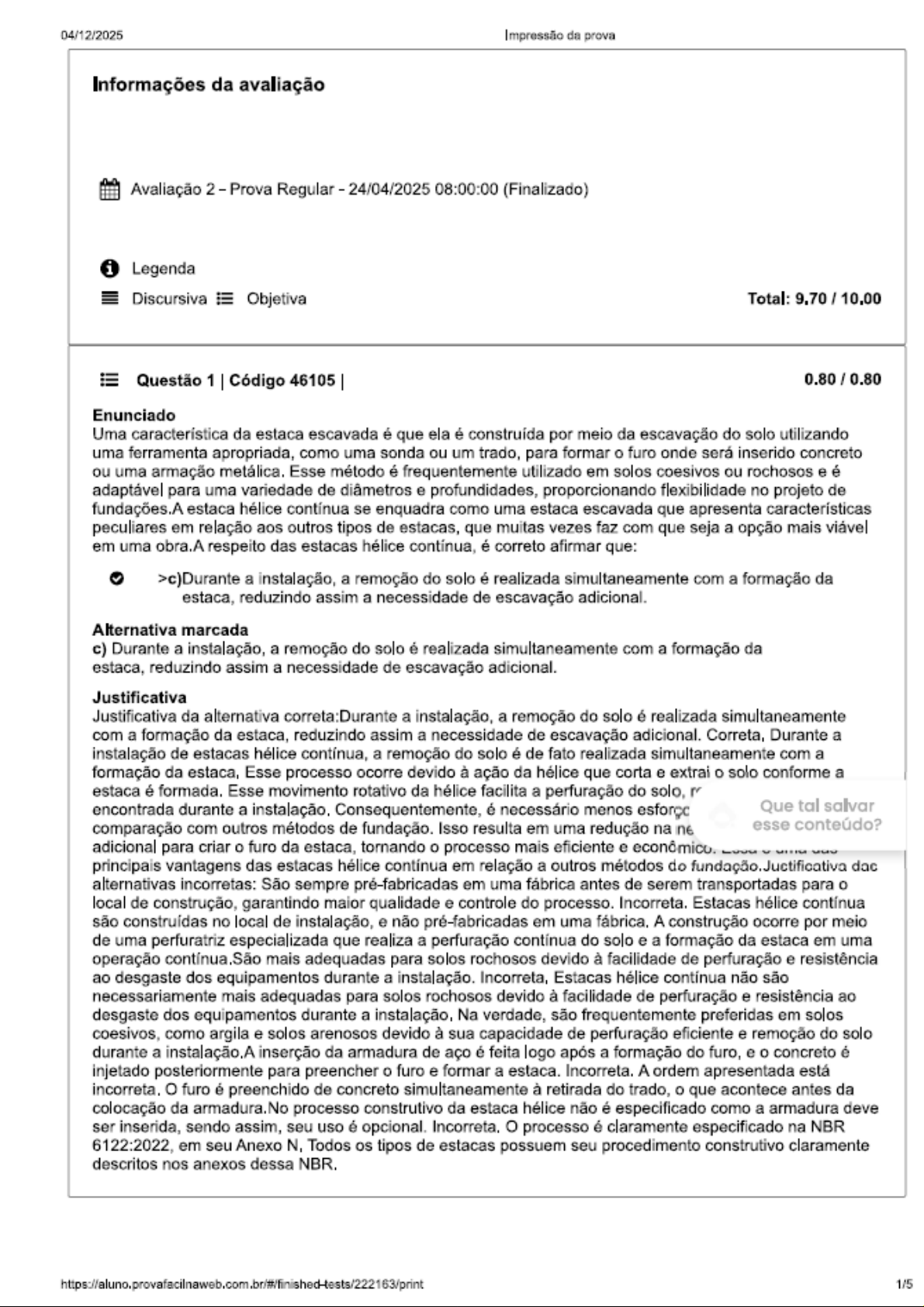 04/12/2025 Impressão da prova Informações da avaliação Avaliação 2 Prova Regular 24/04/2025 08:00:00 (Finalizado) i Legenda Discursiva Objetiva Total: 9,70 10,00 Questão 1 Código 46105 0.80 0.80 Enunciado Uma característica da estaca escavada é que ela é construída por meio da escavação do solo utilizando uma ferramenta apropriada, como uma sonda ou um trado, para formar o furo onde será inserido concreto ou uma armação metálica. Esse método é frequentemente utilizado em solos coesivos ou rochosos e é adaptável para uma variedade de diâmetros e profundidades, proporcionando flexibilidade no projeto de estaca hélice contínua se enquadra como uma estaca escavada que apresenta características peculiares em relação aos outros tipos de estacas, que muitas vezes faz com que seja a opção mais viável em uma obra.A respeito das estacas hélice contínua, é correto afirmar que: >c)Durante a instalação, a remoção do solo é realizada simultaneamente com a formação da estaca, reduzindo assim a necessidade de escavação adicional. Alternativa marcada c) Durante a instalação, a remoção do solo é realizada simultaneamente com a formação da estaca, reduzindo assim a necessidade de escavação adicional. Justificativa Justificativa da alternativa correta:Durante a instalação, a remoção do solo é realizada simultaneamente com a formação da estaca, reduzindo assim a necessidade de escavação adicional. Correta, Durante a instalação de estacas hélice contínua, a remoção do solo é de fato realizada simultaneamente com a formação da estaca, Esse processo ocorre devido à ação da hélice que corta e extrai o solo conforme a estaca é formada, Esse movimento rotativo da hélice facilita a perfuração do solo, encontrada durante a Consequentemente, é necessário menos esforço Que tal salvar comparação com outros métodos de fundação. Isso resulta em uma redução na ne esse conteúdo? adicional para criar 0 furo da estaca, tornando o processo mais eficiente e econômico. principais vantagens das estacas hélice contínua em relação a outros métodos do fundação. Juctificativa dac alternativas incorretas: São sempre pré-fabricadas em uma fábrica antes de serem transportadas para o local de construção, garantindo maior qualidade e controle do processo. Incorreta. Estacas hélice contínua são construídas no local de instalação, e não pré-fabricadas em uma fábrica, A construção ocorre por meio de uma perfuratriz especializada que realiza a perfuração contínua do solo e a formação da estaca em uma operação contínua,São mais adequadas para solos rochosos devido à facilidade de perfuração e resistência ao desgaste dos equipamentos durante a instalação. Incorreta, Estacas hélice contínua não são necessariamente mais adequadas para solos rochosos devido à facilidade de perfuração e resistência ao desgaste dos equipamentos durante a instalação, Na verdade, são frequentemente preferidas em solos coesivos, como argila e solos arenosos devido à sua capacidade de perfuração eficiente e remoção do solo durante a inserção da armadura de aço é feita logo após a formação do furo, e 0 concreto é injetado posteriormente para preencher o furo e formar a estaca. Incorreta. A ordem apresentada está incorreta, furo é preenchido de concreto simultaneamente à retirada do trado, o que acontece antes da colocação da armadura.No processo construtivo da estaca hélice não é especificado como a armadura deve ser inserida, sendo assim, seu uso é opcional. Incorreta, processo é claramente especificado na NBR 6122:2022, em seu Anexo N, Todos os tipos de estacas possuem seu procedimento construtivo claramente descritos nos anexos dessa 1/504/12/2025, 08:56 Impressão da prova Questão 2 Código 1145472 0.80 0.80 Enunciado Todo solo tem origem na desintegração e decomposição das rochas pela ação de agentes intempéricos ou antrópicos. que ocorre, basicamente, no processo de intemperismo físico? >e)Decomposição da rocha pela redução do tamanho das partículas. Alternativa marcada e) Decomposição da rocha pela redução do tamanho das partículas. Justificativa iii Questão 3 Código 1145465 0.80 0.80 Enunciado Na fase definitiva, da Elaboração de Projetos Executivo de Engenharia de Estradas, os estudos geotécnicos constarão de: >c) Estudo do subleito; Ensaios geotécnicos de laboratório/campo; Estudo dos empréstimos para o corpo dos aterros e Estudo da ocorrência de materiais para a pavimentação. Alternativa marcada c) Estudo do subleito; Ensaios geotécnicos de laboratório/campo; Estudo dos empréstimos para o corpo dos aterros e Estudo da ocorrência de materiais para a pavimentação. Justificativa Que tal salvar esse conteúdo? 2/504/12/2025, 08:56 Impressão da prova Questão 4 Código 46109 0.80 0.80 Enunciado A ruptura por puncionamento é um fenômeno que ocorre em solos coesivos quando são submetidos a determinados tipos de cargas. Essa forma de falha acontece quando a pressão aplicada em um ponto específico do solo é maior do que sua capacidade de suporte local, resultando em um afundamento ou deformação localizada da superfície do solo.Dito isso, é possível afirmar que há uma ruptura por puncionamento quando temos: >b)Colapso localizado do solo sob cargas pontuais. Alternativa marcada b) Colapso localizado do solo sob cargas pontuais. Justificativa Justificativa da alternativa correta:O colapso localizado do solo sob cargas pontuais. Correta. A alternativa descreve adequadamente o fenômeno da ruptura por puncionamento. Nesse processo, solo coesivo é incapaz de suportar adequadamente a carga concentrada aplicada em um ponto específico, resultando em um afundamento ou deformação localizada da superfície do solo. Esse colapso ocorre devido à pressão excessiva exercida pela carga pontual, que excede a capacidade de suporte do solo naquela área específica. Esse 