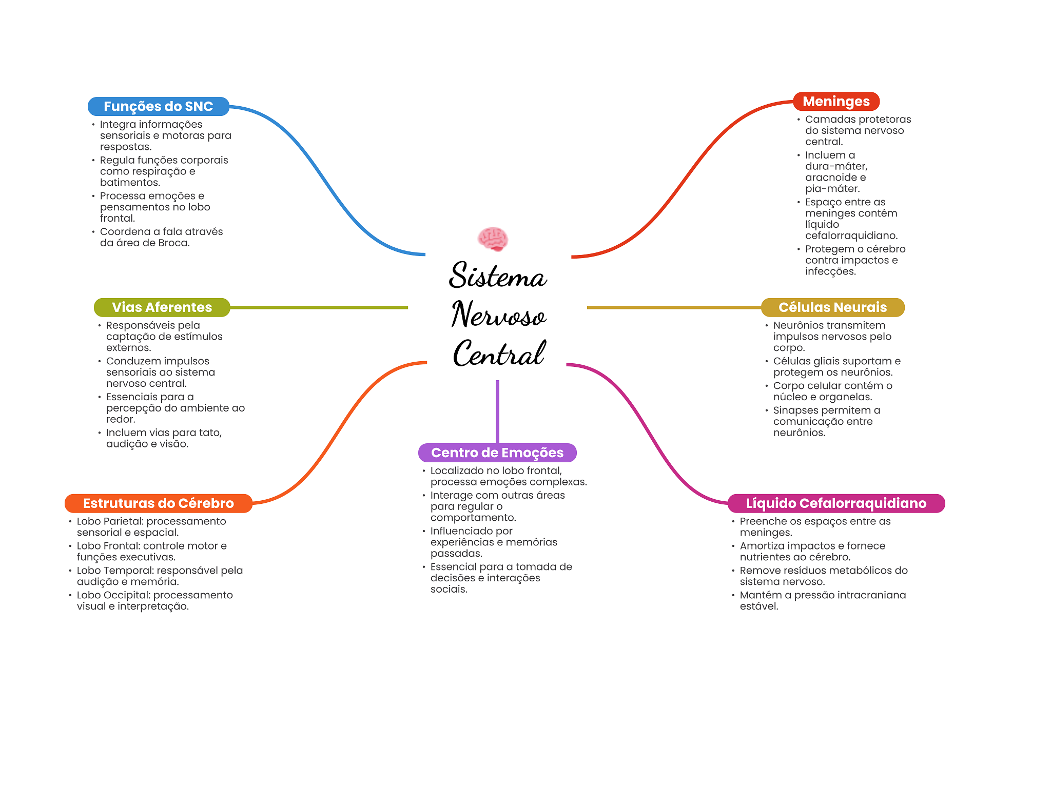 Funções do SNC Meninges Integra informações Camadas protetoras do sistema nervoso sensoriais e motoras para central. respostas. Incluem a Regula funções corporais como respiração e dura-máter, aracnoide e batimentos. pia-máter. Processa emoções e pensamentos no lobo Espaço entre as frontal. meninges contém líquido Coordena a fala através cefalorraquidiano. da área de Broca. Protegem cérebro contra impactos e Sistema infecções. Vias Aferentes Nervoso Células Neurais Responsáveis pela Neurônios transmitem captação de estímulos impulsos nervosos pelo externos. Central corpo. Conduzem impulsos Células gliais suportam e sensoriais ao sistema protegem neurônios. nervoso central. Corpo celular contém Essenciais para a núcleo e organelas. percepção do ambiente ao Sinapses permitem a redor. comunicação entre Incluem vias para tato, neurônios. audição e visão. Centro de Emoções Localizado no lobo frontal, processa emoções complexas. Interage com outras áreas Estruturas do Cérebro para regular Líquido Cefalorraquidiano Lobo Parietal: processamento comportamento. Preenche espaços entre as sensorial e espacial. Influenciado por meninges. Lobo Frontal: controle motor e experiências e memórias Amortiza impactos e fornece funções executivas. passadas. nutrientes ao cérebro. Lobo Temporal: responsável pela Essencial para a tomada de Remove resíduos metabólicos do audição e memória. decisões e interações sistema nervoso. sociais. Lobo Occipital: processamento Mantém a pressão intracraniana visual e interpretação. estável.