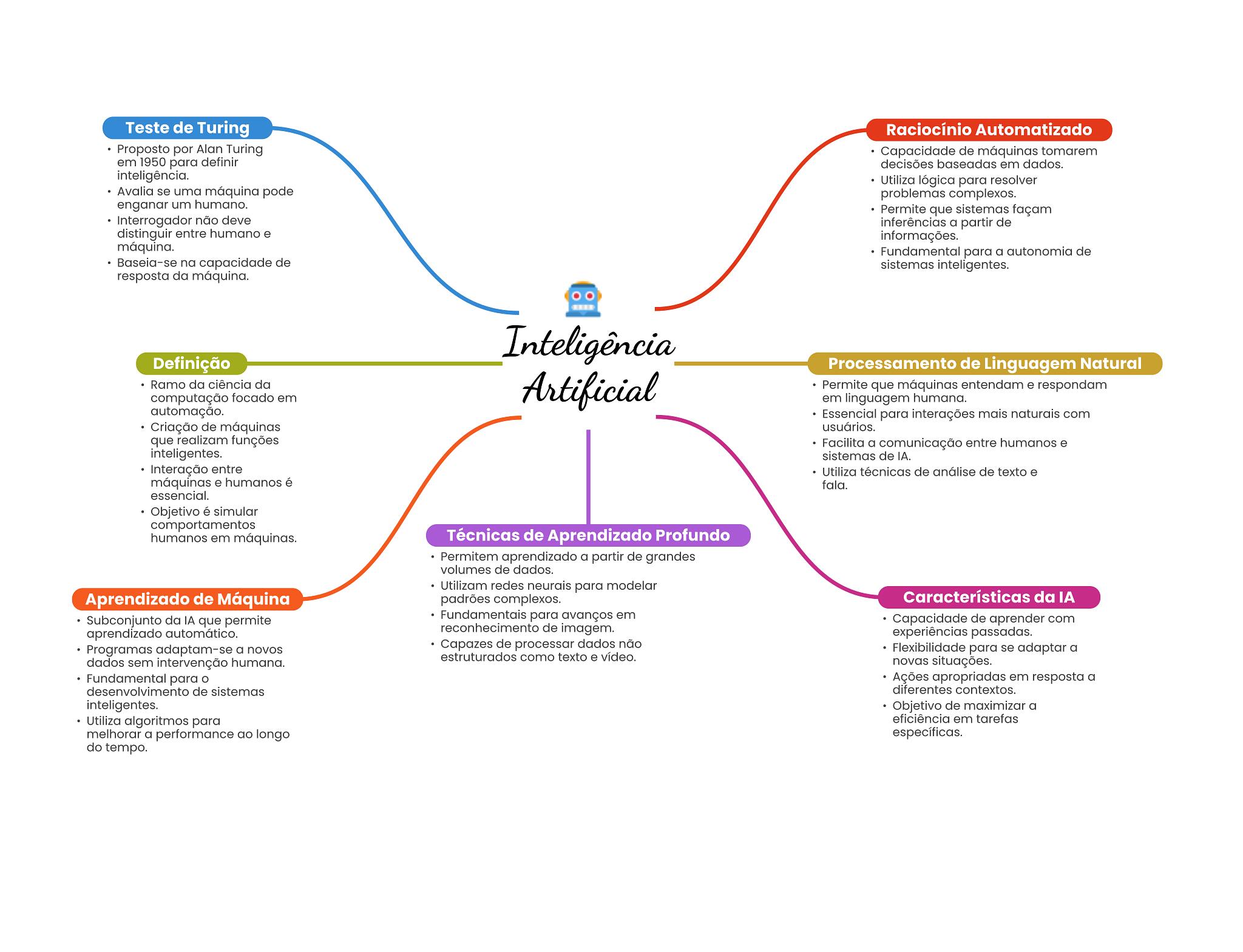 Teste de Turing Raciocínio Automatizado Proposto por Alan Turing Capacidade de máquinas tomarem em 1950 para definir decisões baseadas em dados. inteligência. Utiliza lógica para resolver Avalia se uma máquina pode problemas complexos. enganar um humano. Permite que sistemas façam Interrogador não deve inferências a partir de distinguir entre humano e informações. máquina. Fundamental para a autonomia de Baseia-se na capacidade de sistemas inteligentes. resposta da máquina. Inteligência Definição Processamento de Linguagem Natural Ramo da ciência da Artificial Permite que máquinas entendam e respondam computação focado em em linguagem humana. automação. Essencial para interações mais naturais com Criação de máquinas usuários. que realizam funções Facilita a comunicação entre humanos e inteligentes. sistemas de IA. Interação entre Utiliza técnicas de análise de texto e máquinas e humanos é fala. essencial. Objetivo é simular comportamentos humanos em máquinas. Técnicas de Aprendizado Profundo Permitem aprendizado a partir de grandes volumes de dados. Utilizam redes neurais para modelar Aprendizado de Máquina padrões complexos. Características da IA Subconjunto da IA que permite Fundamentais para avanços em Capacidade de aprender com aprendizado automático. reconhecimento de imagem. experiências passadas. Programas adaptam-se a novos Capazes de processar dados não Flexibilidade para se adaptar a estruturados como texto e vídeo. dados sem intervenção humana. novas situações. Fundamental para Ações apropriadas em resposta a desenvolvimento de sistemas diferentes contextos. inteligentes. Objetivo de maximizar a Utiliza algoritmos para eficiência em tarefas melhorar a performance ao longo específicas. do tempo.