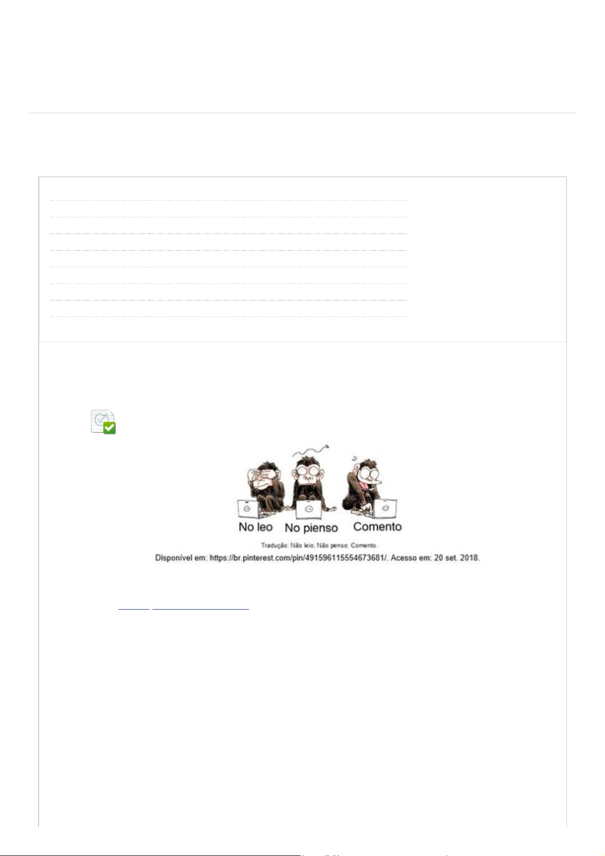 Revisar envio do teste: AVALIAÇÃO I ESTUDOS DISCIPLINARES XV 6678-10_SEI_CT_0122_R_20252 CONTEÚDO Usuário beatriz.silva647 @aluno.unip.br Curso ESTUDOS DISCIPLINARES XV Teste AVALIAÇÃO I Iniciado 08/10/25 13:21 Enviado 08/10/25 14:03 Status Completada Resultado da tentativa 10 em 10 pontos Tempo decorrido 41 minutos Resultados exibidos Respostas enviadas, Perguntas respondidas incorretamente Pergunta 1 Leia a charge e o texto a seguir. Gente que comenta sem ler - r eflexões sobre uma epidemia digital Danilo Venticinque Clique em qualquer notícia de um grande portal, vá à seção de comentários e faça sua aposta: quantas pessoas realmente leram todo o texto antes de comentar? Quando comecei no jornalismo, ingênuo, acreditava que todos liam tudo. Os anos me tornaram cético. Hoje, tenho certeza de que o número é próximo de zero. Na internet, quase todos nós lemos muito mal. Num universo de leitura fragmentada, os comentaristas conseguem se destacar negativamente. Ao contrário dos outros maus leitores, que prestam conta apenas às suas consciências, quem comenta deixa registrada, definitivamente, a sua falta de atenção. Só não morrem de vergonha disso porque sabem que ninguém notará suas falhas. Afinal, se quase ninguém lê as notícias, é seguro apostar que mesmo o mais absurdo dos comentários passará despercebido por todos. Quanto maior a audiência de uma notícia, maior a chance de a caixa de comentários se transformar numa sala de bate-papo delirante, sem nenhuma relação com o assunto original. Não importa se o texto é sobre a Petrobras, sobre novas marcas de esmalte ou sobre o álbum da Copa: sempre haverá uma desculpa para transformá-lo em palco para brigas políticas. Quando a vontade de expressar uma opinião é irresistível, a lógica é o que menos importa. Sempre há um ou outro justiceiro que gasta seu tempo apontando incoerências nos CONTEÚDOS ACADÊMICOS BIBLIOTECAS MURAL DO ALUNO TUTORIAISUNIP EAD 1 em 1 pontos http://company.blackboard.com/ https://ava.ead.unip.br/webapps/blackboard/execute/courseMain?course_id=_428187_1 https://ava.ead.unip.br/webapps/blackboard/content/listContent.jsp?course_id=_428187_1&content_id=_4773276_1&mode=reset https://epoca.globo.com/colunas-e-blogs/danilo-venticinque/noticia/2014/04/gente-que-bcomenta-sem-lerb.html https://ava.ead.unip.br/webapps/portal/execute/tabs/tabAction?tab_tab_group_id=_25_1 https://ava.ead.unip.br/webapps/portal/execute/tabs/tabAction?tab_tab_group_id=_27_1 https://ava.ead.unip.br/webapps/portal/execute/tabs/tabAction?tab_tab_group_id=_47_1 https://ava.ead.unip.br/webapps/portal/execute/tabs/tabAction?tab_tab_group_id=_29_1 https://ava.ead.unip.br/webapps/portal/execute/tabs/tabAction?tab_tab_group_id=_10_1 https://ava.ead.unip.br/webapps/login/?action=logout Resposta Selecionada: e. comentários alheios. São criaturas exóticas: leem não só os textos, como também os comentários - e ainda se dão ao trabalho de notar quando não há qualquer relação entre uma coisa e outra. Os esforços desses bravos heróis são em vão: a horda de comentaristas enfurecidos imediatamente os descartará como lacaios de algum partido político ou, pior ainda, metidos a intelectuais. Bem feito. Quem mandou gastar seu tempo lendo um texto na internet? Comentários em redes sociais são ainda piores. Lá, não é necessário nem mesmo clicar na notícia para palpitar sobre ela. Basta ler o título do post que um amigo compartilhou e o campo de comentários estará logo abaixo, com todos os seus encantos. No último primeiro de abril, o site da National Public Radio (NPR) aplicou uma pegadinha impiedosa em seus leitores: publicou, no Facebook, um texto com o título "Por que a América não lê". Centenas de pessoas comentaram o assunto. Algumas discordavam, indignadas. Outras concordavam e discorriam longamente sobre as causas desse fenômeno. O texto da notícia, que ninguém leu, explicava a piada e dizia algo como "os americanos leem, mas temos a impressão de que eles só olham o título antes de comentar". Eu não saberia dizer precisamente o que estava escrito lá: confesso que não li o texto da NPR. Vi o link no Facebook de um ou dois amigos e decidi comentar sobre o assunto mesmo assim. Por muito tempo, acreditei que a multidão que comenta sem ler era a escória da internet. Que o mundo seria melhor se lêssemos todos os textos antes de palpitar sobre eles. Eu estava errado. Hoje penso exatamente o contrário. A enorme maioria dos textos que circulam pela internet é inútil. Os comentaristas ensandecidos simplesmente decidiram parar de perder tempo com esse tipo de bobagem. São seres mais evoluídos do que nós. Basta aplicarem em algo útil todas as horas de leitura superficial que economizam e logo dominarão o mundo. Saber comentar sem ler é uma habilidade indispensável para ser bem-sucedido no mundo digital. Se você ainda não aderiu, pare de ler agora e junte-se a nós. Seja bem-vindo ao futuro. O próximo passo rumo à iluminação digital é aprender a não ler e não comentar. As discussões na internet, convenhamos, nunca mudaram a opinião de ninguém. Nos meus anos menos esclarecidos, li muitos debates em seções de comentários. Nunca vi um crítico do governo terminar uma discussão com "pensando bem, acho que a culpa não é da Dilma". Ou um ativista, após longas réplicas e tréplicas, decidir dar o braço a torcer: "diante de todos os argumentos aqui expostos, cheguei à conclusão de que #vaitercopa". As discussões virtuais são tão dispensáveis quanto as notícias que as antecedem. Abençoado seja quem guarda sua opinião para si e cultiva o silêncio digital. É o que vou fazer agora. Até a próxima semana. Disponível em: https://epoca.globo.com/colunas-e-blogs/danilo-venticinque/noticia/2014/0 4/gente-que-bcomenta-sem-lerb.html. Acesso em: 20 set. 2018. Com base na leitura, avalie as afirmativas. I- A charge apresenta um posicionamento oposto ao do artig