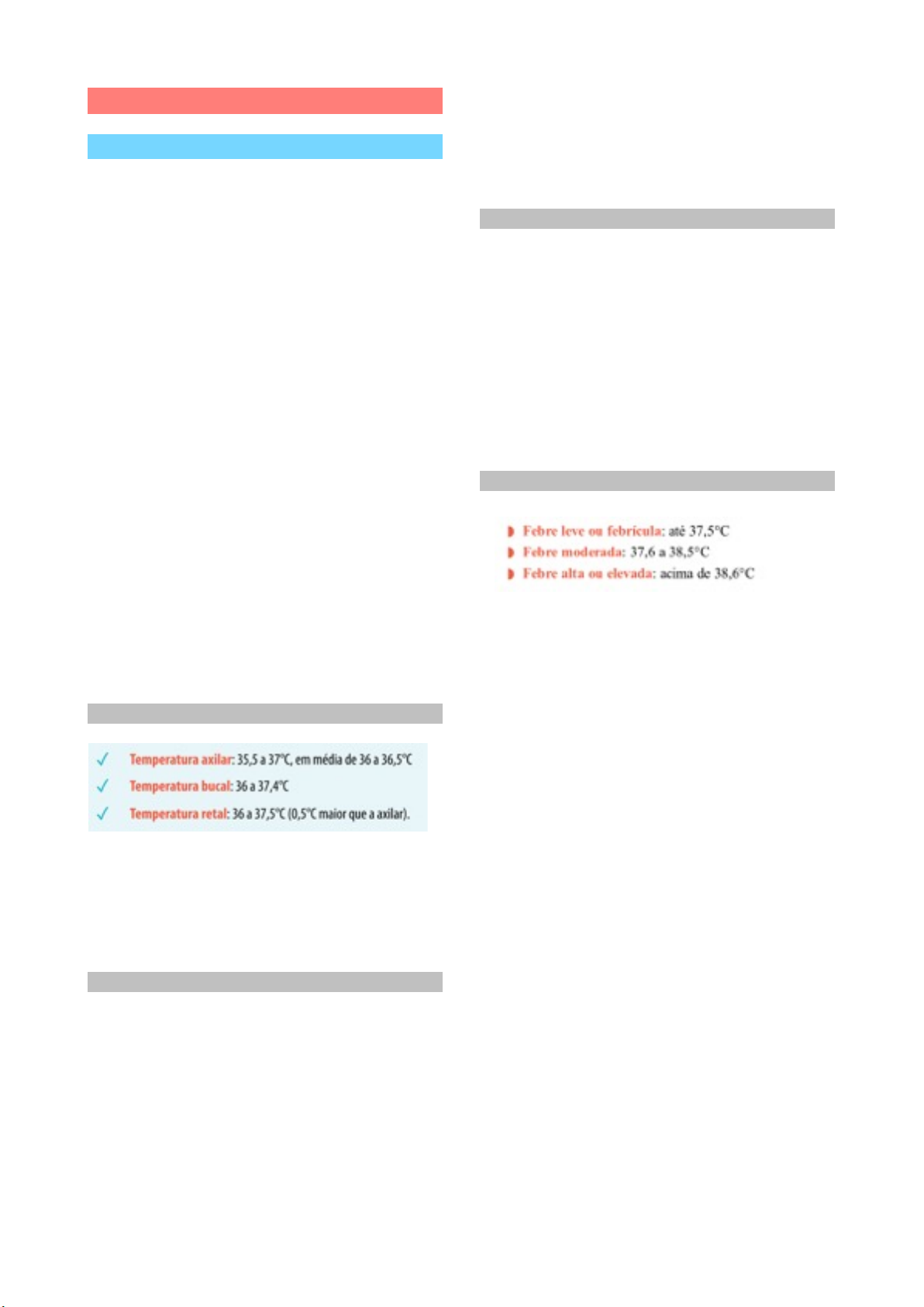 Sinais Vitais Temperatura Varia em torno de 0,6 graus, mesmo em exposição ao frio, graças ao aparelho termorregulador. Também varia ao longo do dia, com valores mais baixos pela manhã e mais altos pela noite. É possível registro da temperatura ao longo de dias e estabelecimento de uma curva térmica. Aumento fisiológico - refeições copiosas, exercícios físicos intensos, gravidez e ovulação. Termômetros clínicos registram T de 35 a 42 graus. Termômetros eletrônicos de 32 a 43 graus. 1. Axilar - mais utilizada. 2. Oral - termômetro na região sublingual e no canto do lábio. Necessidade de termômetros individuais. 3. Retal - termômetro na ampola retal. Uso de termômetros individuais e com o bulbo redondo. Faixas de normalidade Sinal de Lannander - diferenças maiores do que um grau entre as temperaturas axilar e retal podem significar casos de abdome agudo ou afecções pélvicas inflamatórias, como a apendicite. Classificação Hipotermia - valores abaixo do normal. Não deve ser diagnosticada com termômetro axilar. Ocorre mais frequentemente em crianças e idosos. - Calafrios, confusão mental, taquicardia, delírio, hipotensão arterial, cianose, rigidez muscular, torpor e coma. Febre - valores acima do normal (síndrome). Hipertermia - valores acima do normal com presença de fatores ambientais. Em alguns casos é benéfica e fisiológica. Apirexia - ausência de febre. Medição da Temperatura Axilar 1. Desinfectar termômetro. 2. Observar coluna igual ou inferior a 35 graus. 3. Secar o oco axilar se necessário. 4. Posicionar o bulbo no oco axilar e abraço s o b r e o p e i t o , m a n t e r p o r aproximadamente 5 min. Nesse período é possível observar outros sinais vitais. 5. Retirar termômetro pelo lado oposto ao bulbo e realizar leitura. Febre T corporal acima da faixa de normalidade, por transtornos do cérebro ou substância tóxicas que influenciam os centros reguladores. A administração de antitérmicos normalmente ocorre a partir de 38,2 graus. Há elevação do ponto de ajuste do termostato hipotalâmico. As substâncias que causam esse aumento são denominadas de pirogênicas e secretas por bactérias ou por tecidos em degeneração. A febre é uma síndrome e apresenta aspectos nocivos, com maior velocidade dos processos metabólicos acentuando a perda de peso, aumento do trabalho e frequência do coração e sudorese agravando a perda de líquidos e eletrólitos. Pode haver mal estar consequente à cefaleia, fotofobia, indisposição geral e sensação de calor. Quando a temperatura se eleva subitamente, o paciente pode mesmo sentir frio ou, mais frequentemente, calafrios. Sinais e sintomas da síndrome febril são: - Astenia - Inapetência - Cefaleia - Taquicardia - Taquipneia - Taquisfigmia - Oliguria - Dor no corpo - Calafrios - Sudorese - Náuseas - Vômitos - Delírio - Confusão mental - Convulsões Características semiológicas da febre 1. Início - súbito ou gradual. No primeiro quase sempre acompanha sinais e sintomas da síndrome febril e sensações iniciais de calafrio. 2. Intensidade - depende da causa e da capacidade de reação do organismo. - Leve ou febrícula - Moderada - Alta ou elevada 3. Duração - curta ou prolongada. - Prolongada - tuberculose, septicemia, malária, endocardite infecciosa, febre tifoide, colagenoses, linfomas, pielonefrite, brucelose e esquistossomose. 4. Modo de evolução - gráfico, quadro ou curva térmica. - Contínua - sempre acima do normal com variações de ate um grau. - Irregular ou séptica - picos muito altos intercalados por T baixas ou períodos de apirexia. - Remitente - hipertermia diária com variações de mais de um grau, mas sem períodos de apirexia. - Intermitente - períodos intercalados de febre e apirexia. - Recorrente ou ondulante - T elevada durante alguns dias e apirexia por dias ou semanas. 5. Término - C r i s e - d e s a p a r e c e s u b i t a m e n t e , normalmente com sudorese profunda e prostração. - Lise - desaparece gradualmente. Causas da febre Por aumento na produção de calor, por bloqueio na perda de calor e por lesão nos tecidos (maior parte). Ritmo e Frequência do Pulso e Cardíaca Normalmente do pulso radial, mas também pode ser do carotídeo ou do femoral. Características semiológicas 1. Estado da parede arterial 2. Ritmo - regular ou irregular. O irregular traduz arritmia cardiaca. 3. Frequência - contar pulsações durante um minuto. Comparar com a frequência cardíaca (ausculta das bulhas). Déficit de pulso é quando a frequência de pulsações no pulso é menor do que a cardíaca, com valor clínico de fibrilação atrial e extrassistolia. Normal - 60 a 100 bpm. Em atletas pode ser de 50 a 60 bpm. Taquicardia - acima de 100 bpm. Ocorre no exercício físico, emoções gravidez, estados febris, hipertireoidismo, fibrilação atrial, hipovolemia, miocardite, colapso periférico, taquicardia paroxística. Bradicardia -sobre superfície firme, com palma da mão para cima. Anotar a posição da aferição. - Primeira avaliação e em alguns casos - idosos, suspeita de hipotensão postural - deve ser medida em todas as posições e nos quatro membros (sempre precedida de palpação dos pulsos periféricos). - Aparelho limpo e calibrado. - Colocar o manguito 2cm acima da fossa cubital. Centralizar o meio da parte compressiva do manguito sobre a artéria braquial. - Palpar o pulso radial. - Inflar o manguito até o desaparecimento do pulso radial, em seguida desinsuflar lentamente. Quando reaparecer o pulso será a P sistólica. - Diafragma do esteto na artéria braquial. Localizar pulsações. Insuflar o manguito 30 m m H g a c i m a d o v a l o r s i s t ê m i c o encontrado. - Soltar o ar de 2 a 3 mmHg/s - volta dos sons é a pressão sistólica e perda dos sons novamente é a pressão diastólica. Sons de Korotokoff Ritmo e Frequência Respiratórios S u c e s s ã o r e g u l a r d e m o v i m e n t o s respiratórios, com amplitude de p