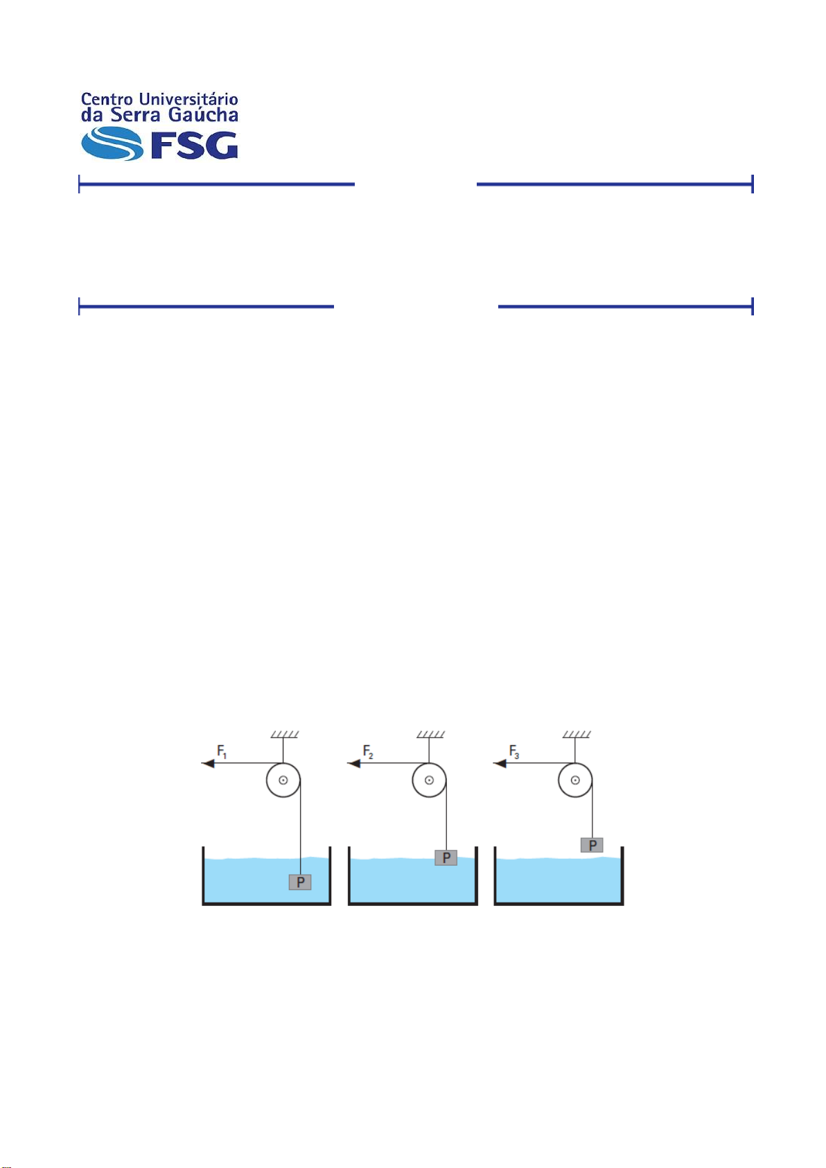 Disciplina: Física Aplicada II Profª: Andréa Timm Acadêmicos: RA: Curso(s): Data: 01) Um fluido é: a) um líquido b) um gás c) qualquer coisa que escoa d) qualquer coisa cuja forma pode ser alterada 02) Um fluido dentro de um recipiente está sujeito à pressão atmosférica que atua sobre sua superfície e também à gravitação da Terra. A pressão no fundo do recipiente: a) depende da altura da coluna de fluido b) depende da forma do recipiente c) é igual à pressão atmosférica ________________________________________________________________________________ ________________________________________________________________________________ ________________________________________________________________________________ 03) As figuras abaixo mostram três etapas da retirada de um bloco de granito P do fundo de uma piscina. Considerando que F1, F2 e F3 são os valores das forças que mantêm o bloco em equilíbrio, cite e justifique qual das três forças é a mais intensa e qual é a menos intensa. ________________________________________________________________________________ ________________________________________________________________________________ ________________________________________________________________________________ Identificação Questões 04) Um desafio interessante consiste em colocar uma moeda no fundo de um prato, de forma que ela fique coberta por uma fina camada de água, conforme está representado na figura I, e retirá-la sem molhar os dedos, utilizando apenas um copo, uma vela e um isqueiro. Uma solução é apresentada nas figuras seguintes: a vela é acesa e, posteriormente, o copo é emborcado sobre ela; depois de algum tempo, a chama da vela extingue-se, e a água do prato é drenada para o interior do copo. Com relação à situação apresentada, julgue os itens que se seguem em verdadeiros (V) ou falsos (F). ( ) A massa total de gás aprisionado no interior do copo com a vela acesa é menor que a massa total do gás que seria aprisionado se o copo fosse emborcado com a vela apagada. ( ) A chama da vela se apagará somente se a água que entrar no copo for suficiente para atingir o pavio aceso. ( ) Enquanto a vela estiver acesa no interior do copo, observar-se-á um aumento no brilho da chama. ( ) Depois que a chama da vela se apaga, o gás no interior do copo resfria-se, originando uma região de baixa pressão. Consequentemente, a pressão exterior empurra a água para o interior do copo. 05) Dois copos idênticos são enchidos com água até o mesmo nível. Um dos dois tem cubos de gelo flutuando. Quando os cubos de gele derretem, em qual copo o nível de água fica mais elevado? a) No copo sem cubos de gelo b) No copo com cubos de gelo c) O nível é o mesmo em ambos ________________________________________________________________________________ ________________________________________________________________________________ ________________________________________________________________________________ 06) O navio Estrela do Mar, vindo do Oceano Atlântico, passa para a Lagoa dos Patos, a caminho do porto de Rio Grande. Sabendo que a densidade da água doce é menor do que a da água salgada, responda à seguinte pergunta e justifique sua resposta. O volume de água deslocado pelo navio no mar é maior, menor ou igual ao volume deslocado na lagoa? ________________________________________________________________________________ ________________________________________________________________________________ ________________________________________________________________________________ 07) Uma mangueira é constituída por duas partes, uma de 20 mm de diâmetro e outra de 15 mm de diâmetro. As duas partes são conectadas, uma depois da outra, a uma torneira. Na extremidade aberta da mangueira, a vazão de água é de 10 litros por minuto. Em que parte da mangueira a água escoa mais rapidamente? a) Na parte de 20 mm de diâmetro b) Na parte de 15 mm de diâmetro c) A velocidade de escoamento é a mesma em ambos os casos d) A resposta depende de qual parte vem primeiro em relação ao escoamento. ________________________________________________________________________________ ________________________________________________________________________________ ________________________________________________________________________________ 08) Julgue os itens abaixo em verdadeiros (V) ou falsos (F) Dois corpos de ferro A e B estão, inicialmente, com as temperaturas TA = 120ºC e TB = 80ºC. As massas dos corpos são: MA = 1,0 kg e MB = 2,0 kg. Quando colocados em contato térmico, dentro de um recipiente isolado termicamente: ( ) a energia flui sob a forma de calor do corpo B para o corpo A; ( ) a temperatura dos dois corpos tenderá a se igualar; ( ) a energia flui sob a forma de calor do corpo A para o corpo B; ( ) como a massa de B é o dobro da massa do corpo A, a energia em forma de calor fluirá do corpo B para o corpo A; ( ) para o equilíbrio térmico ser alcançado o corpo B cederá energia em forma de calor para o corpo A. 09) Uma porca está muito apertada no parafuso. O que você deve fazer para afrouxá-la? ( ) É indiferente esfriar ou esquentar a porca. ( ) Esfriar a porca. ( ) Esquentar a porca. ( ) É indiferente esfriar ou esquentar o parafuso. ( ) Esquentar o parafuso.