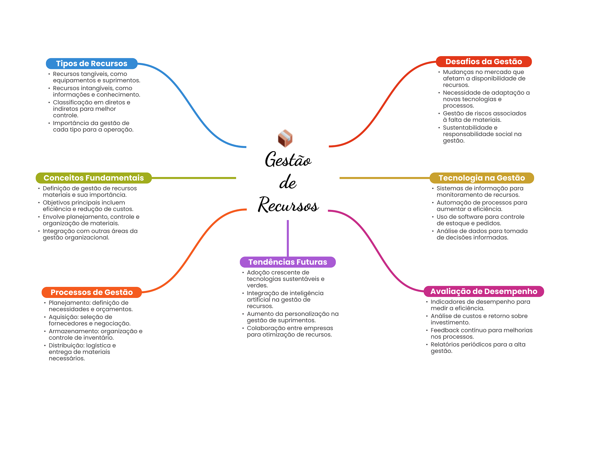 Tipos de Recursos Desafios da Gestão Recursos tangíveis, como Mudanças no mercado que equipamentos e suprimentos. afetam a disponibilidade de recursos. Recursos intangíveis, como informações e conhecimento. Necessidade de adaptação a Classificação em diretos e novas tecnologias e indiretos para melhor processos. controle. Gestão de riscos associados à falta de materiais. Importância da gestão de cada tipo para a operação. Sustentabilidade e responsabilidade social na gestão. Gestão Conceitos Fundamentais de Tecnologia na Gestão Definição de gestão de recursos Sistemas de informação para materiais e sua importância. monitoramento de recursos. Objetivos principais incluem eficiência e redução de custos. Recursos Automação de processos para aumentar a eficiência. Envolve planejamento, controle e Uso de software para controle organização de materiais. de estoque e pedidos. Integração com outras áreas da Análise de dados para tomada gestão organizacional. de decisões informadas. Tendências Futuras Adoção crescente de tecnologias sustentáveis e verdes. Processos de Gestão Integração de inteligência Avaliação de Desempenho Planejamento: definição de artificial na gestão de Indicadores de desempenho para recursos. necessidades e orçamentos. medir a eficiência. Aquisição: seleção de Aumento da personalização na Análise de custos e retorno sobre fornecedores e negociação. gestão de suprimentos. investimento. Armazenamento: organização e Colaboração entre empresas Feedback contínuo para melhorias controle de inventário. para otimização de recursos. nos processos. Distribuição: logística e Relatórios periódicos para a alta entrega de materiais gestão. necessários.