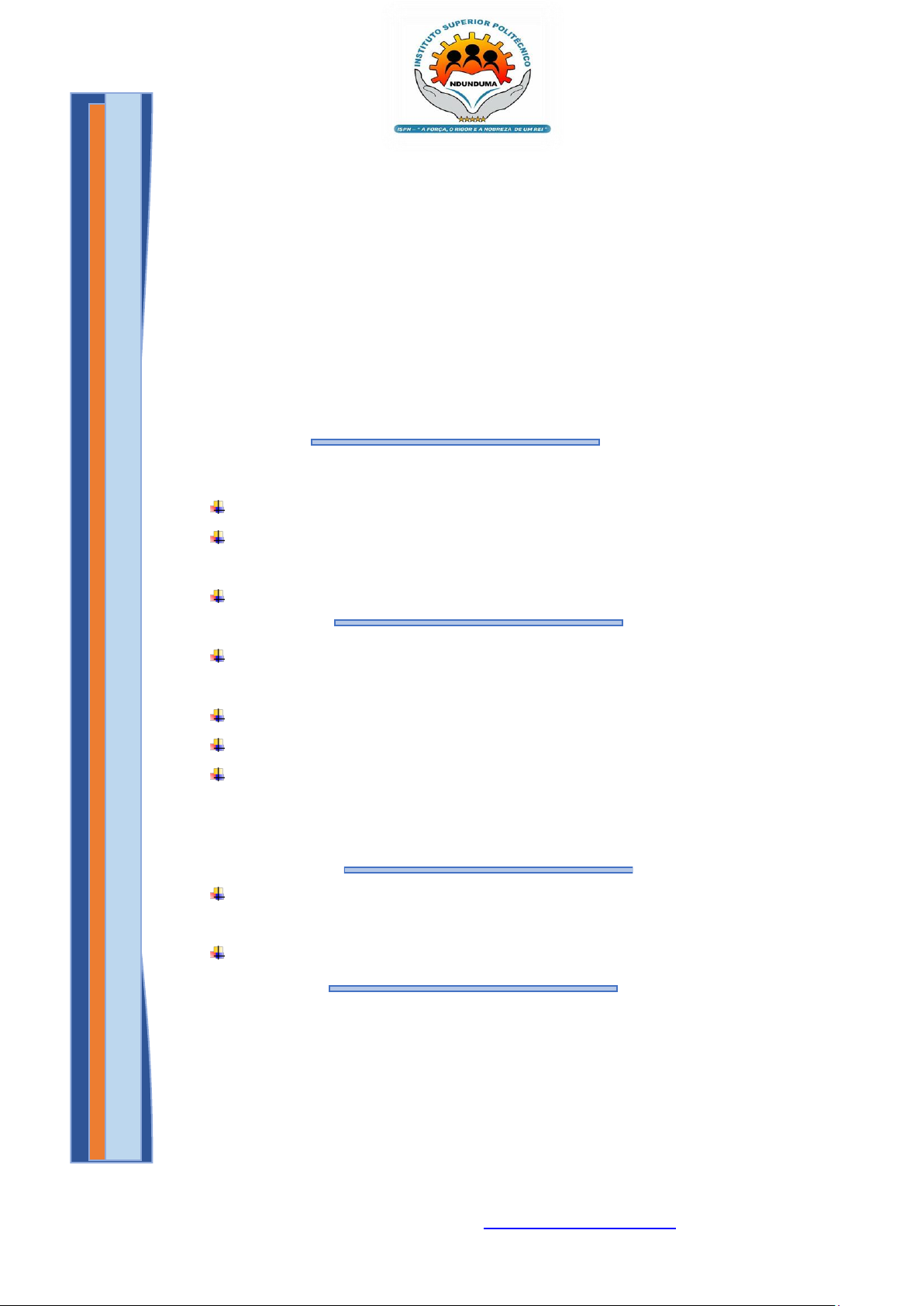 SEDE: CUITO, AVENIDA JOAQUIM KAPANGO KUITO/BIÉ Telef. (00244) 928 544 950/932 175 804 Web: ispndunduma.co.ao E-mail: geral@ispndunduma.co.ao Proposta do Programa da Primeira Jornada Académica do Construtor 09H00 – Recepção e acomodação dos convidados 09H30- Entoação do Hino Nacional Palavras de boas-vindas a serem proferidas pela Exma. Presidente do ISPN, Dra. Salomé Clara Chinofila Painel 1: Mesa redonda Académica Debate: Inter- institucional (ISPN, UIC, IM Adolfo Andrade, IM Camacupa) Tema: Construir Angola com soluções realistas e sustentáveis. Momento cultural Painel 2: A voz da experiência Apresentação do tema central pelo Engenheiro Gabriel Chande. Tema: panorama da construção Civil em Angola. Sessão de Perguntas e Respostas 15 minutos para interação da plateia com o Engenheiro Gabriel Chande. Discurso de encerramento a ser proferido pela presidente do ISPN Fim da actividade – 11h30 INSTITUTO SUPERIOR POLITÉCNICO NDUNDUMA, “A FORÇA, O RIGOR E A NOBREZA DE UM REI”! mailto:geral@ispndunduma.co.ao