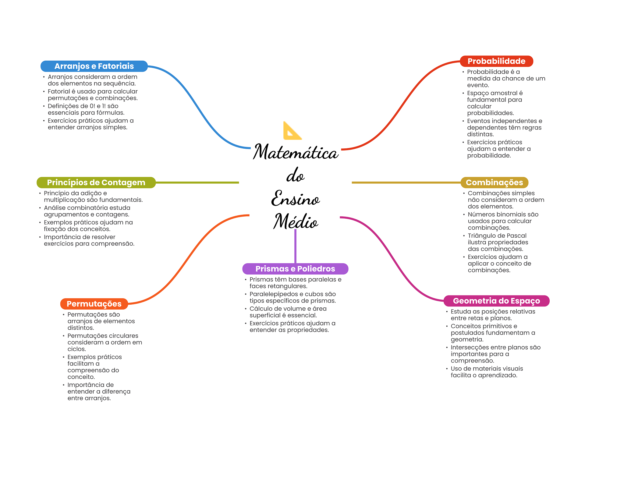 Probabilidade Arranjos e Fatoriais Probabilidade é a Arranjos consideram a ordem medida da chance de um dos elementos na sequência. evento. Fatorial é usado para calcular Espaço amostral é permutações e combinações. fundamental para Definições de O! e 1! são calcular essenciais para fórmulas. probabilidades. Exercícios práticos ajudam a Eventos independentes e entender arranjos simples. dependentes têm regras distintas. Exercícios práticos Matemática ajudam a entender a probabilidade. do Princípios de Contagem Combinações Princípio da adição e Ensino Combinações simples multiplicação são fundamentais. não consideram a ordem Análise combinatória estuda dos elementos. agrupamentos e contagens. Números binomiais são Exemplos práticos ajudam na Médio usados para calcular fixação dos conceitos. combinações. Importância de resolver Triângulo de Pascal exercícios para compreensão. ilustra propriedades das combinações. Exercícios ajudam a aplicar conceito de Prismas e Poliedros combinações. Prismas têm bases paralelas e faces retangulares. Paralelepípedos e cubos são Permutações tipos específicos de prismas. Geometria do Espaço Cálculo de volume e área Permutações são Estuda as posições relativas superficial é essencial. arranjos de elementos entre retas e planos. Exercícios práticos ajudam a distintos. Conceitos primitivos e entender as propriedades. Permutações circulares postulados fundamentam a consideram a ordem em geometria. ciclos. Intersecções entre planos são Exemplos práticos importantes para a facilitam a compreensão. compreensão do Uso de materiais visuais conceito. facilita aprendizado. Importância de entender a diferença entre arranjos.
