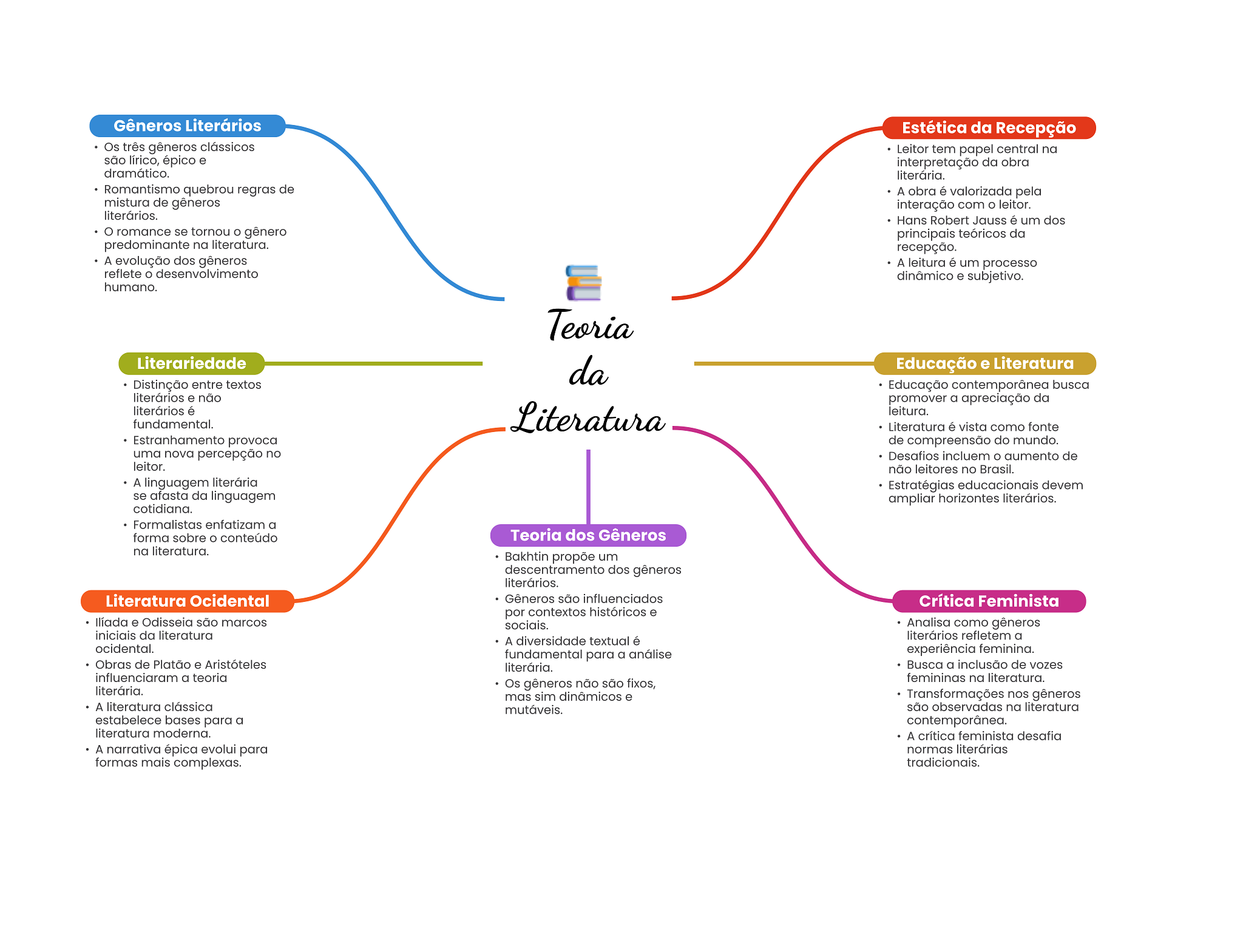 Gêneros Literários Estética da Recepção Os três gêneros clássicos Leitor tem papel central na são lírico, épico e interpretação da obra dramático. literária. Romantismo quebrou regras de A é valorizada pela mistura de gêneros interação com leitor. literários. Hans Robert Jauss é um dos romance se tornou gênero principais teóricos da predominante na literatura. recepção. A evolução dos gêneros A leitura é um processo reflete desenvolvimento dinâmico e subjetivo. humano. Teoria Literariedade da Educação e Literatura Distinção entre textos Educação contemporânea busca literários e não promover a apreciação da literários é fundamental. Literatura leitura. Literatura é vista como fonte Estranhamento provoca de compreensão do mundo. uma nova percepção no Desafios incluem aumento de leitor. não leitores no Brasil. A linguagem literária Estratégias educacionais devem se afasta da linguagem ampliar horizontes literários. cotidiana. Formalistas enfatizam a forma sobre conteúdo Teoria dos Gêneros na literatura. Bakhtin propõe um descentramento dos gêneros literários. Literatura Ocidental Gêneros são influenciados Crítica Feminista por contextos históricos e Ilíada e Odisseia são marcos sociais. Analisa como gêneros iniciais da literatura A diversidade textual é literários refletem a ocidental. fundamental para a análise experiência feminina. Obras de Platão e Aristóteles literária. Busca a inclusão de vozes influenciaram a teoria femininas na literatura. literária. Os gêneros não são fixos, mas sim dinâmicos e Transformações nos gêneros A literatura clássica mutáveis. são observadas na literatura estabelece bases para a contemporânea. literatura moderna. A crítica feminista desafia A narrativa épica evolui para normas literárias formas mais complexas. tradicionais.
