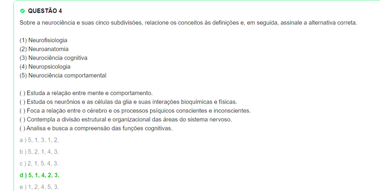 QUESTÃO 4 Sobre a neurociencia e suas cinco relacione OS conceitos às definições em seguida, assinale a alternativa correta. (1) Neurofisiologia (2) Neuroanatomia (3) Neurociência cognitiva (4) Neuropsicologia (5) Neurociência comportamental Estuda a relação entre mente e comportamento. Estuda os e as células da glia e suas interações e fisicas. Foca a relação entre O cérebro e processos psíquicos conscientes e inconscientes. Contempla a divisão estrutural e organizacional das areas do sistema nervoso. Analisa e busca a compreensão das funções cognitivas. a)5,1,3,1,2. b)5,2,1,4,3. c)2,1,5,4,3. d)5,1,4,2,3.