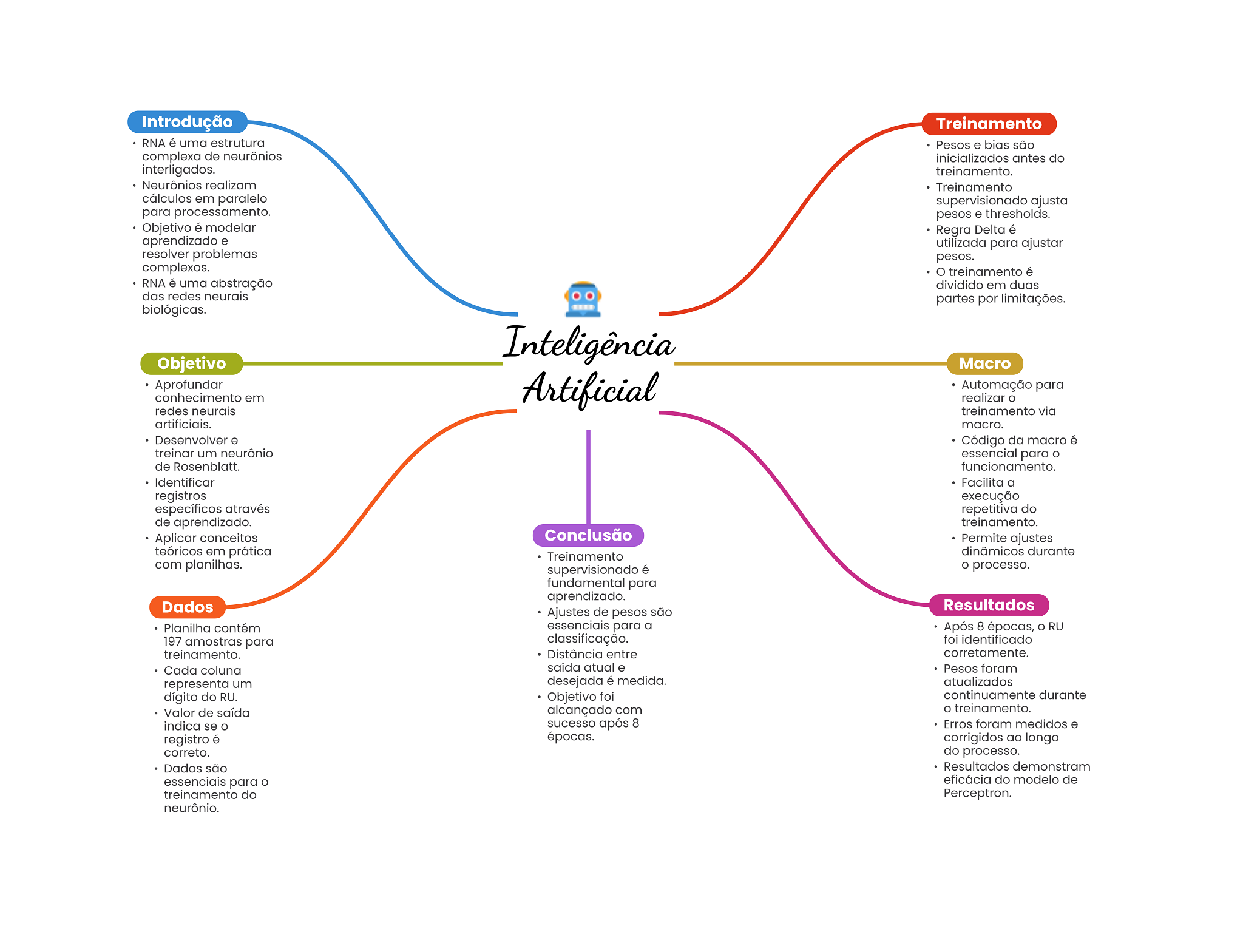 Introdução Treinamento RNA é uma estrutura Pesos e bias são complexa de neurônios inicializados antes do interligados. treinamento. Neurônios realizam Treinamento cálculos em paralelo supervisionado ajusta para processamento. pesos e thresholds. Objetivo é modelar Regra Delta é aprendizado e utilizada para ajustar resolver problemas pesos. complexos. treinamento é RNA é uma abstração dividido em duas das redes neurais partes por limitações. biológicas. Inteligência Objetivo Macro Aprofundar Artificial Automação para conhecimento em realizar redes neurais treinamento via artificiais. macro. Desenvolver e Código da macro é treinar um neurônio essencial para O de Rosenblatt. funcionamento. Identificar Facilita a registros execução específicos através repetitiva do de aprendizado. treinamento. Aplicar conceitos Conclusão Permite ajustes teóricos em prática Treinamento dinâmicos durante com planilhas. supervisionado é processo. fundamental para aprendizado. Dados Resultados Ajustes de pesos são Planilha contém essenciais para a Após 8 épocas, RU 197 amostras para classificação. foi identificado treinamento. Distância entre corretamente. Cada coluna saída atual e Pesos foram representa um desejada é medida. atualizados dígito do RU. Objetivo foi continuamente durante Valor de saída alcançado com O treinamento. indica se sucesso após 8 Erros foram medidos e registro é épocas. corrigidos ao longo correto. do processo. Dados são Resultados demonstram essenciais para eficácia do modelo de treinamento do Perceptron. neurônio.