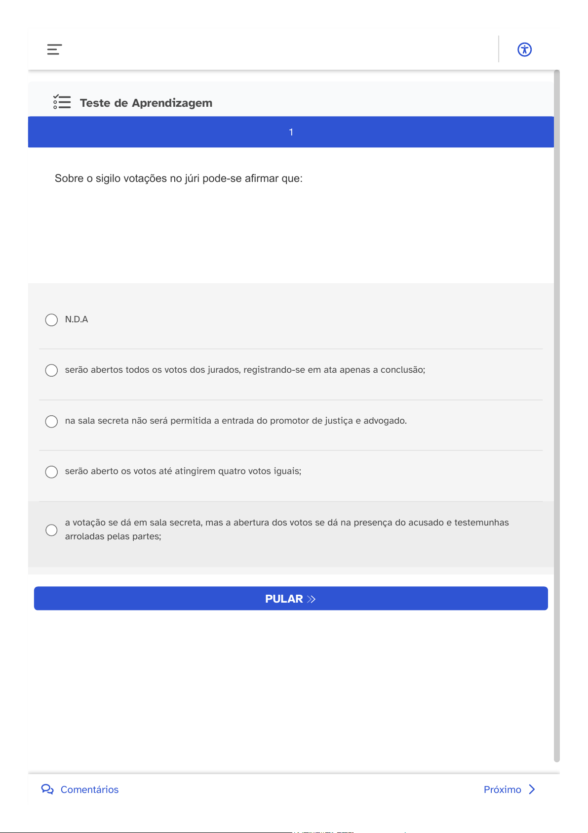 Teste de Aprendizagem Sobre o sigilo votações no júri pode-se afirmar que: N.D.A serão abertos todos os votos dos jurados, registrando-se em ata apenas a conclusão; na sala secreta não será permitida a entrada do promotor de justiça e advogado. serão aberto os votos até atingirem quatro votos iguais; a votação se dá em sala secreta, mas a abertura dos votos se dá na presença do acusado e testemunhas arroladas pelas partes; PULAR 1 Próximo Comentários 05/12/2025, 07:38 EBRADI DL https://student.ulife.com.br/ContentPlayer/Index?lc=yrbS5CEaFDyZYQSOVjd48A%3d%3d&l=hknRRdQtTUvov2eo7rvFuA%3d%3d&cd=V7D%2f… 1/1