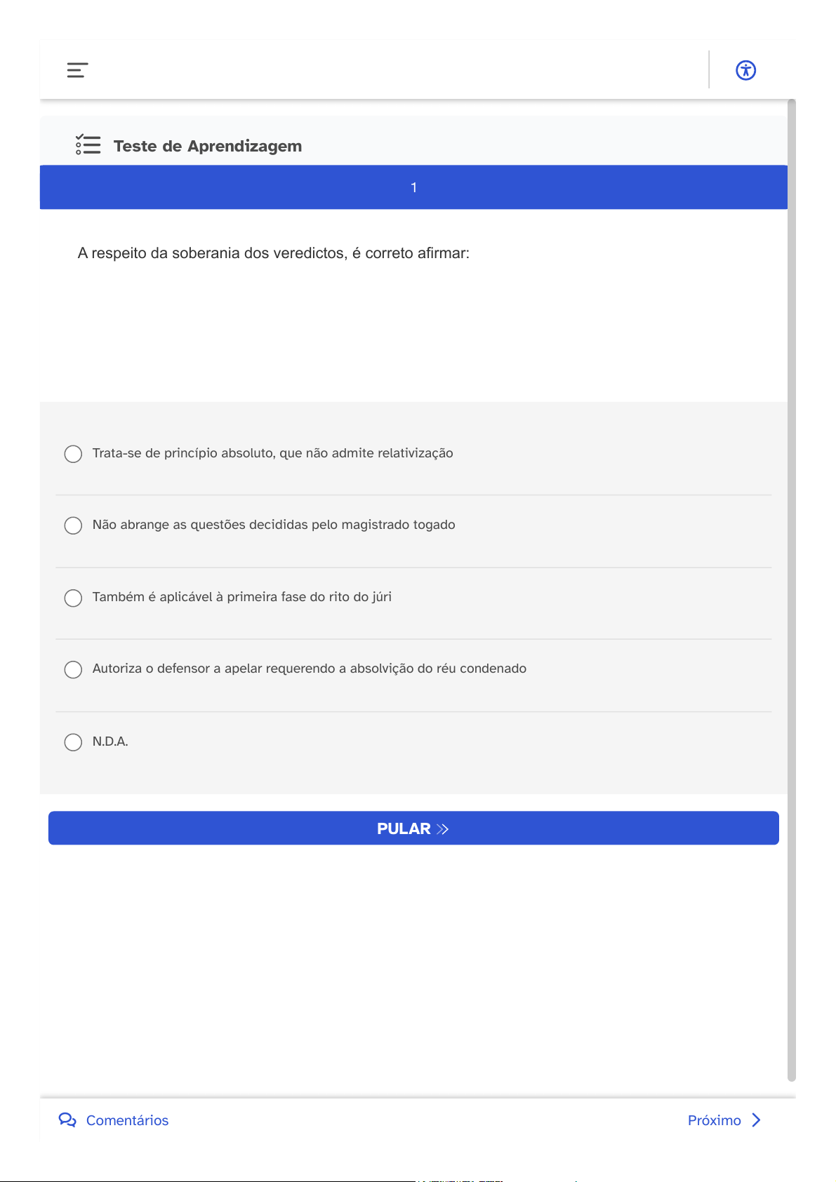 Teste de Aprendizagem A respeito da soberania dos veredictos, é correto afirmar: Trata-se de princípio absoluto, que não admite relativização Não abrange as questões decididas pelo magistrado togado Também é aplicável à primeira fase do rito do júri Autoriza o defensor a apelar requerendo a absolvição do réu condenado N.D.A. PULAR 1 Próximo Comentários 05/12/2025, 07:35 EBRADI DL https://student.ulife.com.br/ContentPlayer/Index?lc=yrbS5CEaFDyZYQSOVjd48A%3d%3d&l=hknRRdQtTUvov2eo7rvFuA%3d%3d&cd=V7D%2f… 1/1