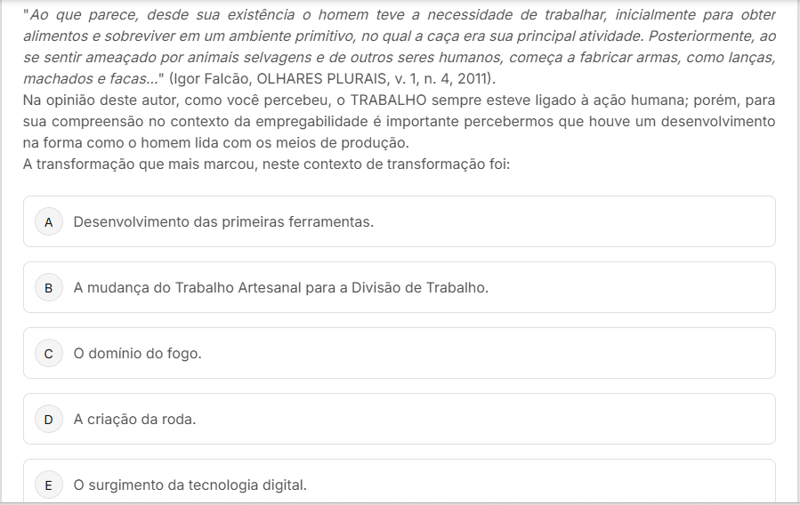 "Ao que parece, desde sua existência O homem teve a necessidade de trabalhar, inicialmente para obter alimentos e sobreviver em um ambiente primitivo, no qual a caça era sua principal atividade. Posteriormente, ao se sentir ameaçado por animais selvagens e de outros seres humanos, começa a fabricar armas, como lanças, machados e facas..." (Igor Falcão, OLHARES PLURAIS, V. 1, n. 4, 2011). Na opinião deste autor, como você percebeu, O TRABALHO sempre esteve ligado à ação humana; porém, para sua compreensão no contexto da empregabilidade é importante percebermos que houve um desenvolvimento na forma como O homem lida com meios de produção. A transformação que mais marcou, neste contexto de transformação foi: A Desenvolvimento das primeiras ferramentas. B A mudança do Trabalho Artesanal para a Divisão de Trabalho. C O domínio do fogo. D A criação da roda. E surgimento da tecnologia digital.