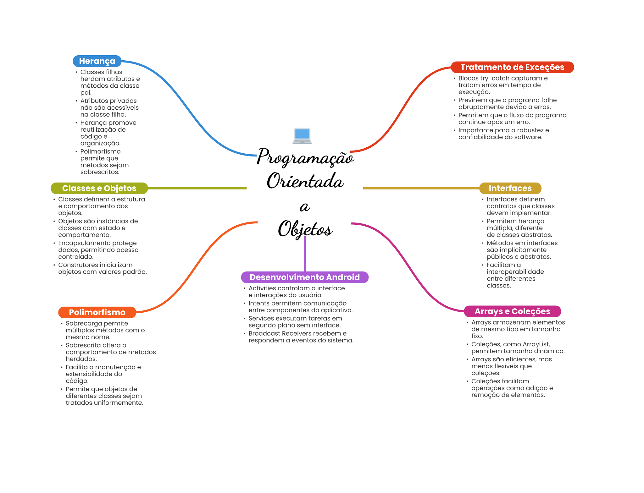 Herança Tratamento de Exceções Classes filhas herdam atributos e Blocos try-catch capturam e métodos da classe tratam erros em tempo de pai. execução. Atributos privados Previnem que programa falhe não são acessíveis abruptamente devido a erros. na classe filha. Permitem que fluxo do programa Herança promove continue após um erro. reutilização de Importante para a robustez e código e confiabilidade do software. organização. Polimorfismo permite que métodos sejam Programação sobrescritos. Orientada Classes e Objetos Interfaces Classes definem a estrutura Interfaces definem e comportamento dos a contratos que classes objetos. devem implementar. Objetos são instâncias de Permitem herança classes com estado e Objetos múltipla, diferente comportamento. de classes abstratas. Encapsulamento protege Métodos em interfaces dados, permitindo acesso são implicitamente controlado. públicos e abstratos. Construtores inicializam Facilitam a objetos com valores padrão. interoperabilidade Desenvolvimento Android entre diferentes Activities controlam a interface classes. e interações do usuário. Intents permitem comunicação Polimorfismo entre componentes do aplicativo. Arrays e Coleções Services executam tarefas em Sobrecarga permite segundo plano sem interface. Arrays armazenam elementos múltiplos métodos com de mesmo tipo em tamanho Broadcast Receivers recebem e mesmo nome. fixo. respondem a eventos do sistema. Sobrescrita altera Coleções, como ArrayList, comportamento de métodos permitem tamanho dinâmico. herdados. Arrays são eficientes, mas Facilita a manutenção e menos flexíveis que extensibilidade do coleções. código. Coleções facilitam Permite que objetos de operações como adição e diferentes classes sejam remoção de elementos. tratados uniformemente.