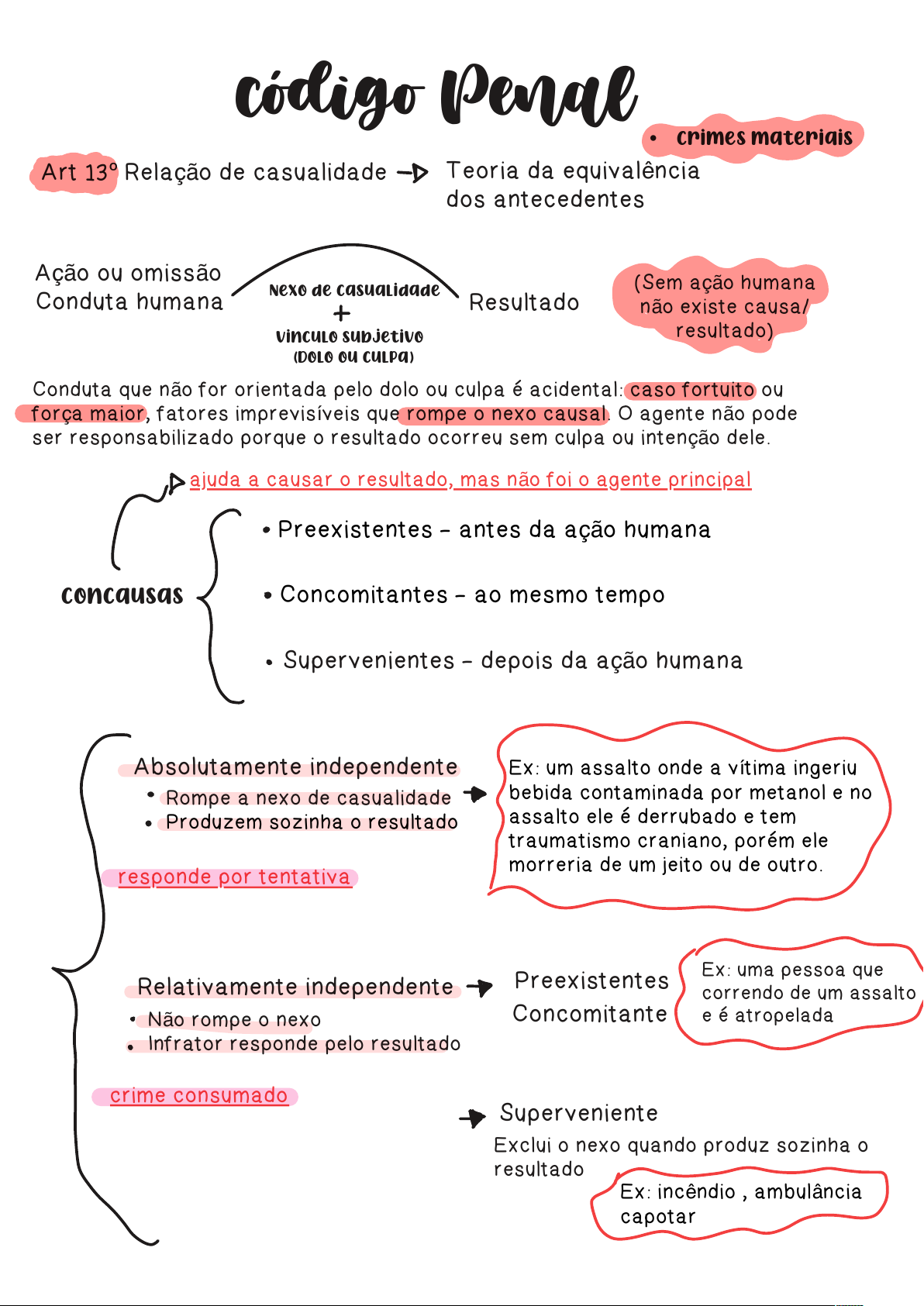 código Penal Art 13º Relação de casualidade Teoria da equivalência dos antecedentes Ação ou omissão Conduta humana Resultado Nexo de casualidade Vinculo subjetivo (Dolo ou culpa) • Crimes materiais (Sem ação humana não existe causa/ resultado) Conduta que não for orientada pelo dolo ou culpa é acidental: caso fortuito ou força maior, fatores imprevisíveis que rompe o nexo causal. O agente não pode ser responsabilizado porque o resultado ocorreu sem culpa ou intenção dele. Concausas Preexistentes - antes da ação humana Concomitantes - ao mesmo tempo Supervenientes - depois da ação humana Absolutamente independente Rompe a nexo de casualidade Produzem sozinha o resultado Ex: um assalto onde a vítima ingeriu bebida contaminada por metanol e no assalto ele é derrubado e tem traumatismo craniano, porém ele morreria de um jeito ou de outro. Relativamente independente Preexistentes ConcomitanteNão rompe o nexo Infrator responde pelo resultado Superveniente Exclui o nexo quando produz sozinha o resultado Ex: uma pessoa que correndo de um assalto e é atropelada Ex: incêndio , ambulância capotar ajuda a causar o resultado, mas não foi o agente principal responde por tentativa crime consumado