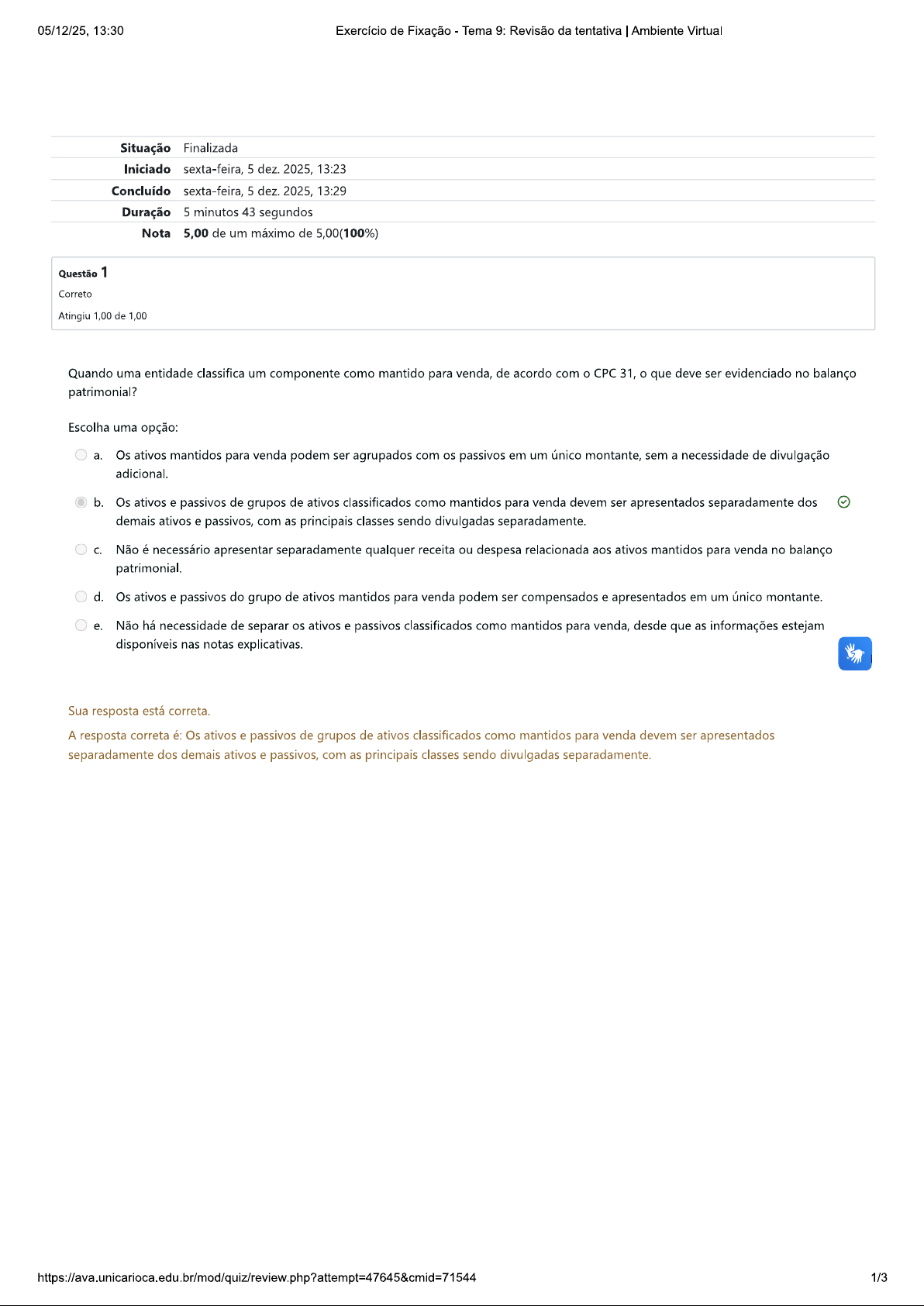 05/12/25, 13:30 Exercício de Fixação Tema 9: Revisão da tentativa Ambiente Virtual Situação Finalizada Iniciado sexta-feira, 5 dez. 2025, 13:23 Concluído sexta-feira, 5 dez. 2025, 13:29 Duração 5 minutos 43 segundos Nota 5,00 de um máximo de 5,00(100%) Questão 1 Correto Atingiu 1,00 de 1,00 Quando uma entidade classifica um componente como mantido para venda, de acordo com CPC 31, que deve ser evidenciado no balanço patrimonial? Escolha uma opção: a. Os ativos mantidos para venda podem ser agrupados com os passivos em um único montante, sem a necessidade de divulgação adicional. b. Os ativos e passivos de grupos de ativos classificados como mantidos para venda devem ser apresentados separadamente dos demais ativos e passivos, com as principais classes sendo divulgadas separadamente. C. Não é necessário apresentar separadamente qualquer receita ou despesa relacionada aos ativos mantidos para venda no balanço patrimonial. d. Os ativos e passivos do grupo de ativos mantidos para venda podem ser compensados e apresentados em um único montante. e. Não há necessidade de separar os ativos e passivos classificados como mantidos para venda, desde que as informações estejam disponíveis nas notas explicativas. Sua resposta está correta. A resposta correta é: Os ativos e passivos de grupos de ativos classificados como mantidos para venda devem ser apresentados separadamente dos demais ativos e passivos, com as principais classes sendo divulgadas separadamente. 1/305/12/25, 13:30 Exercício de Fixação Tema 9: Revisão da tentativa Ambiente Virtual Questão 2 Correto Atingiu 1,00 de 1,00 Em relação à reclassificação de operações descontinuadas, conforme o CPC 31, se a entidade deixar de classificar um componente como mantido para venda, os resultados das operações devem ser: Escolha uma opção: a. Reclassificados e incluídos no resultado das operações em continuidade, sem a necessidade de descrições adicionais sobre os ajustes. b. Mantidos nas operações descontinuadas sem alteração, já que a reclassificação não é permitida. C. Reclassificados e incluídos no resultado das operações em continuidade, com uma descrição de que foram novamente apresentados os montantes de períodos anteriores. d. Apresentados como resultado financeiro, sem necessidade de vinculação a operações em continuidade ou descontinuadas. e. Apenas apresentados em notas explicativas, sem necessidade de ajustes nos resultados. Sua resposta está correta. A resposta correta é: Reclassificados e incluídos no resultado das operações em continuidade, com uma descrição de que foram novamente apresentados os montantes de períodos anteriores. Questão 3 Correto Atingiu 1,00 de 1,00 De acordo com a disposição transitória do Pronunciamento Técnico, é permitido aplicar retrospectivamente os requisitos do Pronunciamen Técnico a: Escolha uma opção: a. Operações que atendem aos critérios de descontinuidade, sem a necessidade de informações retrospectivas ou avaliações anteriores. b. Todos os ativos não circulantes ou a grupos de ativos mantidos para venda e operações descontinuadas, desde que as avaliações e informações necessárias tenham sido obtidas quando os critérios de classificação foram inicialmente atendidos. C. Todos os ativos circulantes, desde que as avaliações estejam disponíveis na data de publicação do Pronunciamento Técnico. d. Apenas a ativos não circulantes classificados como mantidos para venda, desde que as informações necessárias sejam obtidas ao longo do período de avaliação. e. Grupos de ativos que atendem aos critérios de ativos não circulantes, sem necessidade de atender a outros requisitos específicos. Sua resposta está correta. A resposta correta é: Todos os ativos não circulantes ou a grupos de ativos mantidos para venda e operações descontinuadas, desde que as avaliações e informações necessárias tenham sido obtidas quando os critérios de classificação foram inicialmente atendidos. 2/305/12/25, 13:30 Exercício de Fixação Tema 9: Revisão da tentativa Ambiente Virtual Questão 4 Correto Atingiu 1,00 de 1,00 De acordo com o Pronunciamento Técnico CPC 31, qual é o procedimento adequado quando a entidade classifica um ativo ou grupo de ativos como mantido para venda? Escolha uma opção: a. ativo ou grupo de ativos deve ser mensurado pelo menor valor entre seu valor contábil e o valor justo, menos as despesas de venda. b. Os juros sobre os passivos de grupos de ativos mantidos para venda não precisam ser reconhecidos enquanto o ativo não for vendido. C. A entidade deve continuar depreciando o ativo enquanto ele estiver classificado como mantido para venda. d. A entidade deve amortizar o ativo não circulante enquanto ele estiver classificado como mantido para venda. e. A entidade deve mensurar o ativo ou grupo de ativos pelo valor contábil, independentemente do valor justo menos as despesas de venda. Sua resposta está correta. A resposta correta é: ativo ou grupo de ativos deve ser mensurado pelo menor valor entre seu valor contábil e justo, menos as despesas de venda. Questão 5 Correto Atingiu 1,00 de 1,00 De acordo com o Pronunciamento Técnico CPC 31, quando a entidade classifica um componente como operação descontinuada, é necessário evidenciar: Escolha uma opção: a. Um montante único na demonstração do resultado, abrangendo tanto o resultado das operações descontinuadas quanto os ganhos ou perdas decorrentes da mensuração pelo valor justo. b. resultado total das operações descontinuadas, sem a necessidade de apresentar a análise separada das receitas e despesas. C. Apenas o resultado das operações em continuidade, sem a inclusão das operações descontinuadas. d. resultado total das operações descontinuadas, mas sem a necessidade de separar as receitas e despesas de tributos sobre o lucro. e. Apenas os fluxos de caixa líquidos atribuíveis às atividades operaci